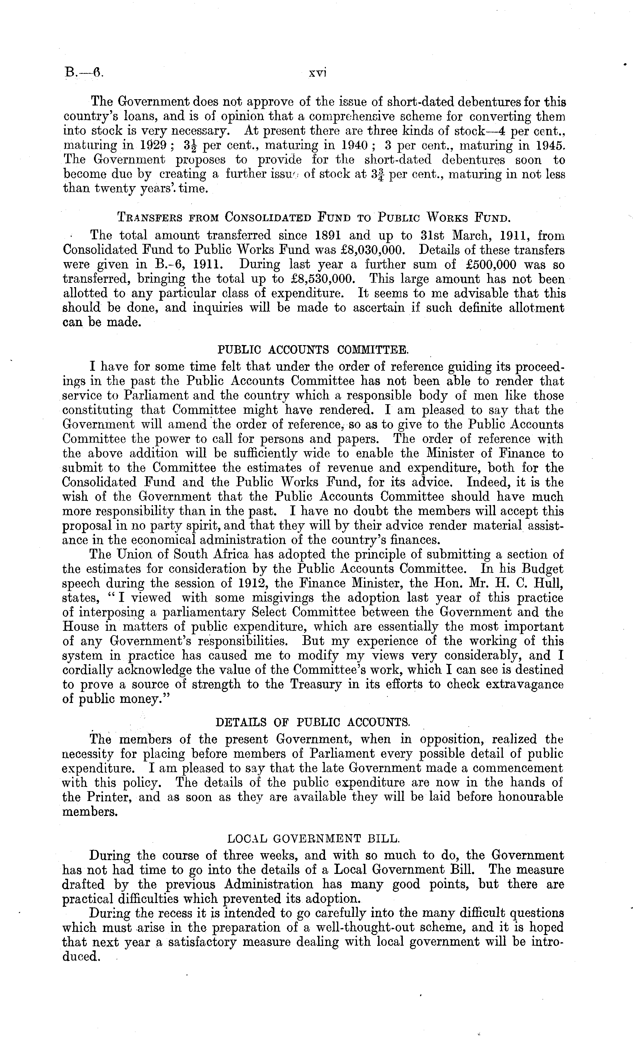 The Government does not approve of the issue of short-dated debentures for this country's loans, and is of opinion that a comprehensive scheme for converting them into stock is very necessary. At present there are three kinds of stock—4 per cent., maturing in 1929 ; 3j per cent., maturing in 1940 ; 3 per cent., maturing in 1945. The Government proposes to provide for the short-dated debentures soon to become duo by creating a further issuo of stock at 3f per cent., maturing in not less than twenty years', time. Transfers from Consolidated Fund to Public Works Fund. The total amount transferred since 1891 and up to 31st March, 1911, from Consolidated Fund to Public Works Fund was £8,030,000. Details of these transfers were given in 8.-6, 1911. During last year a further sum of £500,000 was so transferred, bringing the total up to £8,530,000. This large amount has not been allotted to any particular class of expenditure. It seems to me advisable that this should be done, and inquiries will be made to ascertain if such definite allotment can be made. PUBLIC ACCOUNTS COMMITTEE. I have for some time felt that under the order of reference guiding its proceedings in the past the Public Accounts Committee has not been able to render that service to Parliament and the country which a responsible body of men like those constituting that Committee might have rendered. I am pleased to say that the Government will amend the order of reference, so as to give to the Public Accounts Committee the power to call for persons and papers. The order of reference with the above addition will be sufficiently wide to enable the Minister of Finance to submit to the Committee the estimates of revenue and expenditure, both for the Consolidated Fund and the Public Works Fund, for its advice. Indeed, it is the wish of the Government that the Public Accounts Committee should have much more responsibility than in the past. I have no doubt the members will accept this proposal in no party spirit, and that they will by their advice render material assistance in the economical administration of the country's finances. The Union of South Africa has adopted the principle of submitting a section of the estimates for consideration by the Public Accounts Committee. In his Budget speech during the session of 1912, the Finance Minister, the Hon. Mr. H. C. Hull, states, " I viewed with some misgivings the adoption last year of this practice of interposing a parliamentary Select Committee between the Government and the House in matters of public expenditure, which are essentially the most important of any Government's responsibilities. But my experience of the working of this system in practice has caused me to modify my views very considerably, and I cordially acknowledge the value of the Committee's work, which I can see is destined to prove a source of strength to the Treasury in its efforts to check extravagance of public money." DETAILS OF PUBLIC ACCOUNTS. The members of the present Government, when in opposition, realized the necessity for placing before members of Parliament every possible detail of public expenditure. lam pleased to say that the late Government made a commencement with this policy. The details of the public expenditure are now in the hands of the Printer, and as soon as they are available they will be laid before honourable members. LOCAL GOVERNMENT BILL. During the course of three weeks, and with so much to do, the Government has not had time to go into the details of a Local Government Bill. The measure drafted by the previous Administration has many good points, but there are practical difficulties which prevented its adoption. During the recess it is intended to go carefully into the many difficult questions which must arise in the preparation of a well-thought-out scheme, and it is hoped that next year a satisfactory measure dealing with local government will be introduced.
