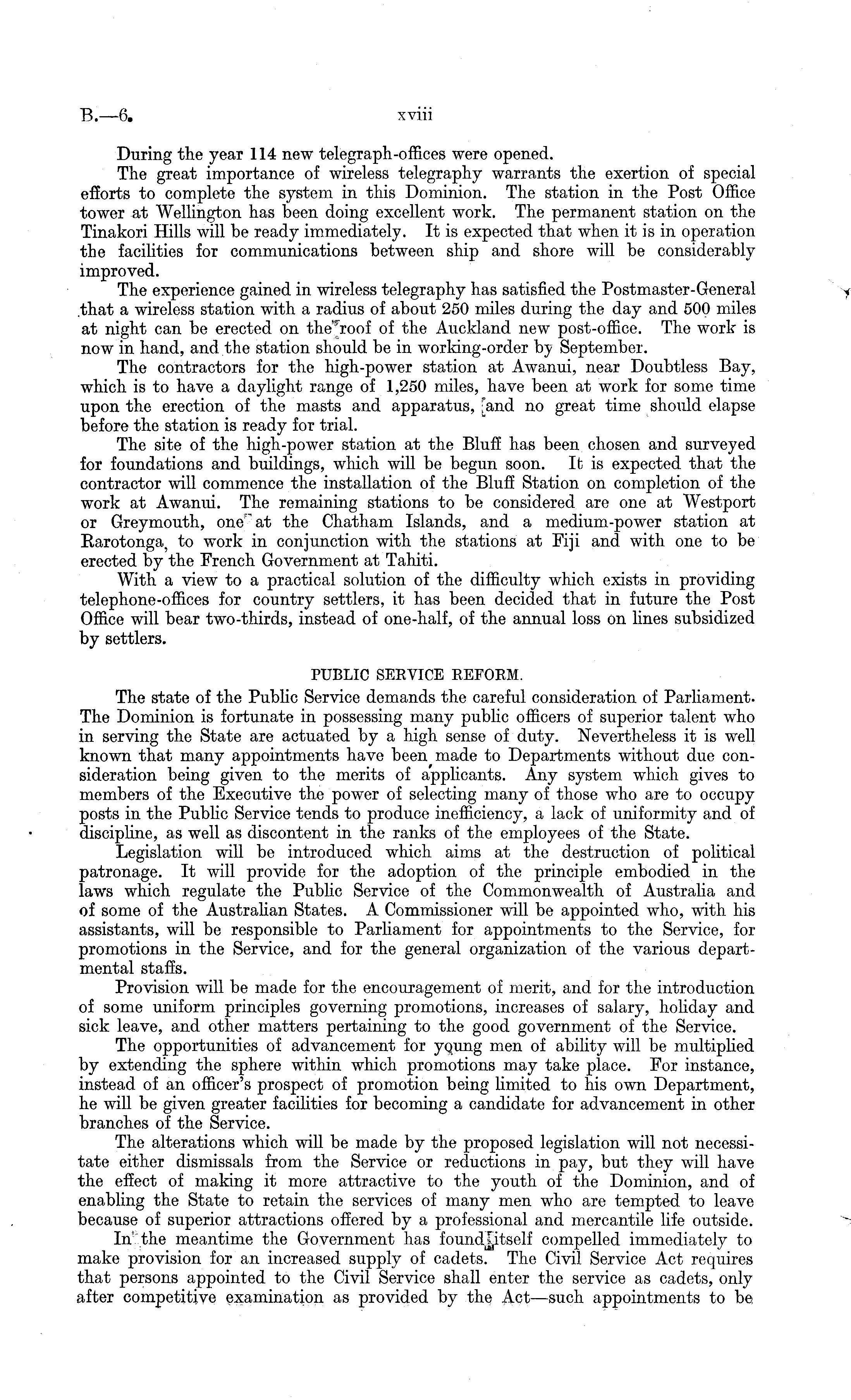 During the year 114 new telegraph-offices were opened. The great importance of wireless telegraphy warrants the exertion of special efforts to complete the system in this Dominion. The station in the Post Office tower at Wellington has been doing excellent work. The permanent station on the Tinakori Hills will be ready immediately. It is expected that when it is in operation the facilities for communications between ship and shore will be considerably improved. The experience gained in wireless telegraphy has satisfied the Postmaster-General .that a wireless station with a radius of about 250 miles during the day and 500 miles at night can be erected on of the Auckland new post-office. The work is now in hand, and the station should be in working-order by September. The contractors for the high-power station at Awanui, near Doubtless Bay, which is to have a daylight range of 1,250 miles, have been at work for some time upon the erection of the masts and apparatus, [and no great time should elapse before the station is ready for trial. The site of the high-power station at the Bluff has been chosen and surveyed for foundations and buildings, which will be begun soon. It is expected that the contractor will commence the installation of the Bluff Station on completion of the work at Awanui. The remaining stations to be considered are one at Westport or Greymouth, one' at the Chatham Islands, and a medium-power station at Rarotonga ? to work in conjunction with the stations at Fiji and with one to be erected by the French Government at Tahiti. With a view to a practical solution of the difficulty which exists in providing telephone-offices for country settlers, it has been decided that in future the Post Office will bear two-thirds, instead of one-half, of the annual loss on lines subsidized by settlers. PUBLIC SEEVICE REFORM. The state of the Public Service demands the careful consideration of Parliament. The Dominion is fortunate in possessing many public officers of superior talent who in serving the State are actuated by a high sense of duty. Nevertheless it is well known that many appointments have been made to Departments without due consideration being given to the merits of applicants. Any system which gives to members of the Executive the power of selecting many of those who are to occupy posts in the Public Service tends to produce inefficiency, a lack of uniformity and of discipline, as well as discontent in the ranks of the employees of the State. Legislation will be introduced which aims at the destruction of political patronage. It will provide for the adoption of the principle embodied in the laws which regulate the Public Service of the Commonwealth of Australia and of some of the Australian States. A Commissioner will be appointed who, with his assistants, will be responsible to Parliament for appointments to the Service, for promotions in the Service, and for the general organization of the various departmental staffs. Provision will be made for the encouragement of merit, and for the introduction of some uniform principles governing promotions, increases of salary, holiday and sick leave, and otner matters pertaining to the good government of the Service. The opportunities of advancement for yqung men of ability will be multiplied by extending the sphere within which promotions may take place. For instance, instead of an officer's prospect of promotion being limited to his own Department, he will be given greater facilities for becoming a candidate for advancement in other branches of the Service. The alterations which will be made by the proposed legislation will not necessitate either dismissals from the Service or reductions in pay, but they will have the effect of making it more attractive to the youth of the Dominion, and of enabling the State to retain the services of many men who are tempted to leave because of superior attractions offered by a professional and mercantile life outside. In* the meantime the Government has foundj,itself compelled immediately to make provision for an increased supply of cadets. The Civil Service Act requires that persons appointed to the Civil Service shall enter the service as cadets, only after competitive examination as provided by the Act —such appointments to he,