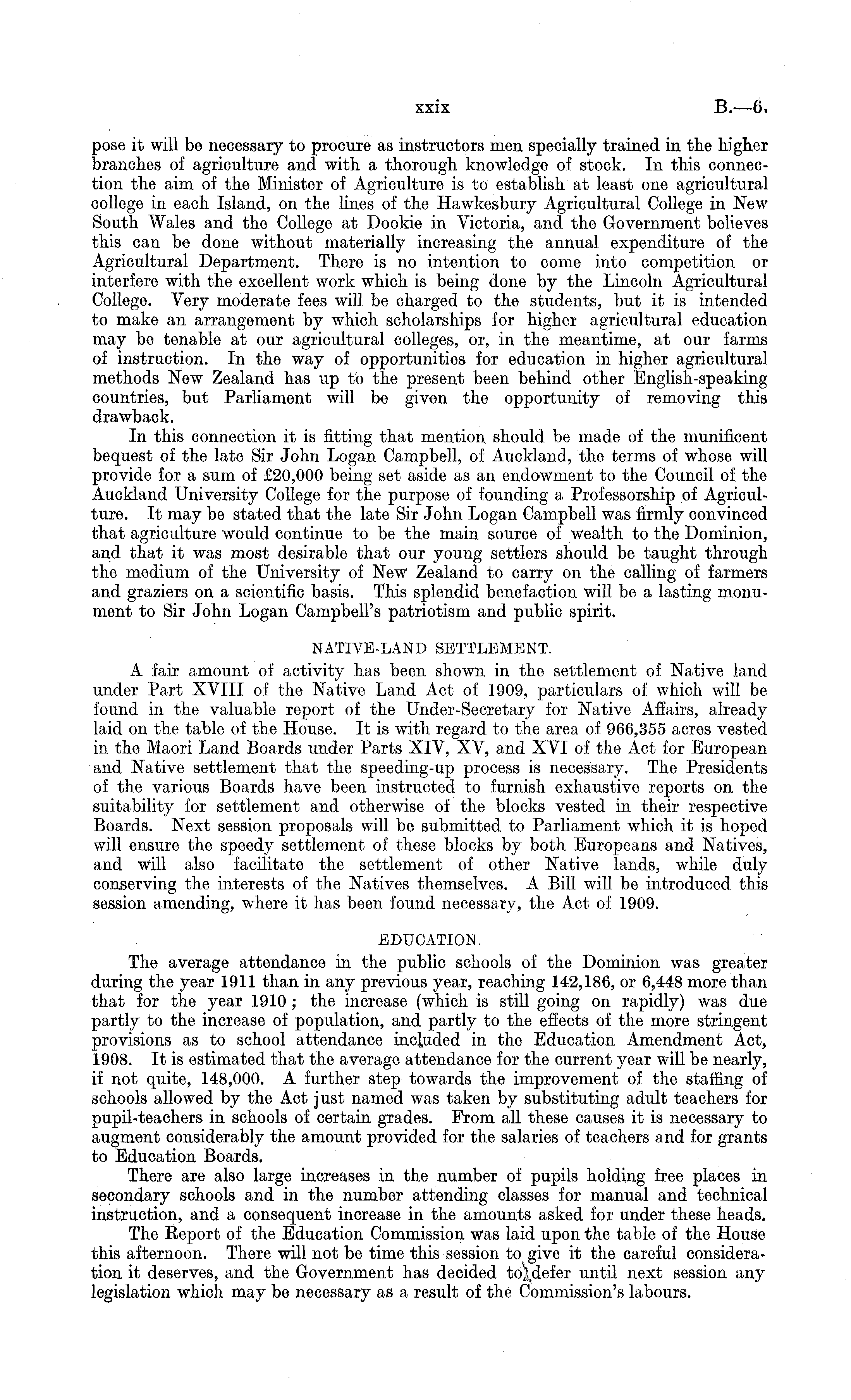 pose it will be necessary to procure as instructors men specially trained in the higher branches of agriculture and with a thorough knowledge of stock. In this connection the aim of the Minister of Agriculture is to establish at least one agricultural college in each Island, on the lines of the Hawkesbury Agricultural College in New South Wales and the College at Dookie in Victoria, and the Government believes this can be done without materially increasing the annual expenditure of the Agricultural Department. There is no intention to come into competition or interfere with the excellent work which is being done by the Lincoln Agricultural College. Very moderate fees will be charged to the students, but it is intended to make an arrangement by which scholarships for higher agricultural education may be tenable at our agricultural colleges, or, in the meantime, at our farms of instruction. In the way of opportunities for education in higher agricultural methods New Zealand has up to the present been behind other English-speaking countries, but Parliament will be given the opportunity of removing this drawback. In this connection it is fitting that mention should be made of the munificent bequest of the late Sir John Logan Campbell, of Auckland, the terms of whose will provide for a sum of £20,000 being set aside as an endowment to the Council of the Auckland University College for the purpose of founding a Professorship of Agriculture. It may be stated that the late Sir John Logan Campbell was firmly convinced that agriculture would continue to be the main source of wealth to the Dominion, and that it was most desirable that our young settlers should be taught through the medium of the University of New Zealand to carry on the calling of farmers and graziers on a scientific basis. This splendid benefaction will be a lasting monument to Sir John Logan Campbell's patriotism and public spirit. NATIVE-LAND SETTLEMENT. A fair amount of activity has been shown in the settlement of Native land under Part XVIII of the Native Land Act of 1909, particulars of which will be found in the valuable report of the Under-Secretary for Native Affairs, already laid on the table of the House. It is with regard to the area of 966,355 acres vested in the Maori Land Boards under Parts XIV, XV, and XVI of the Act for European and Native settlement that the speeding-up process is necessary. The Presidents of the various Boards have been instructed to furnish exhaustive reports on the suitability for settlement and otherwise of the blocks vested in their respective Boards. Next session proposals will be submitted to Parliament which it is hoped will ensure the speedy settlement of these blocks by both Europeans and Natives, and will also facilitate the settlement of other Native lands, while duly conserving the interests of the Natives themselves. A Bill will be introduced this session amending, where it has been found necessary, the Act of 1909. EDUCATION. The average attendance in the public schools of the Dominion was greater during the year 1911 than in any previous year, reaching 142,186, or 6,448 more than that for the year 1910 ; the increase (which is still going on rapidly) was due partly to the increase of population, and partly to the effects of the more stringent provisions as to school attendance included in the Education Amendment Act, 1908. It is estimated that the average attendance for the current year will be nearly, if not quite, 148,000. A further step towards the improvement of the staffing of schools allowed by the Act just named was taken by substituting adult teachers for pupil-teachers in schools of certain grades. From all these causes it is necessary to augment considerably the amount provided for the salaries of teachers and for grants to Education Boards. There are also large increases in the number of pupils holding free places in secondary schools and in the number attending classes for manual and technical instruction, and a consequent increase in the amounts asked for under these heads. The Report of the Education Commission was laid upon the table of the House this afternoon. There will not be time this session to give it the careful consideration it deserves, and the Government has decided until next session any legislation which may be necessary as a result of the Commission's labours.