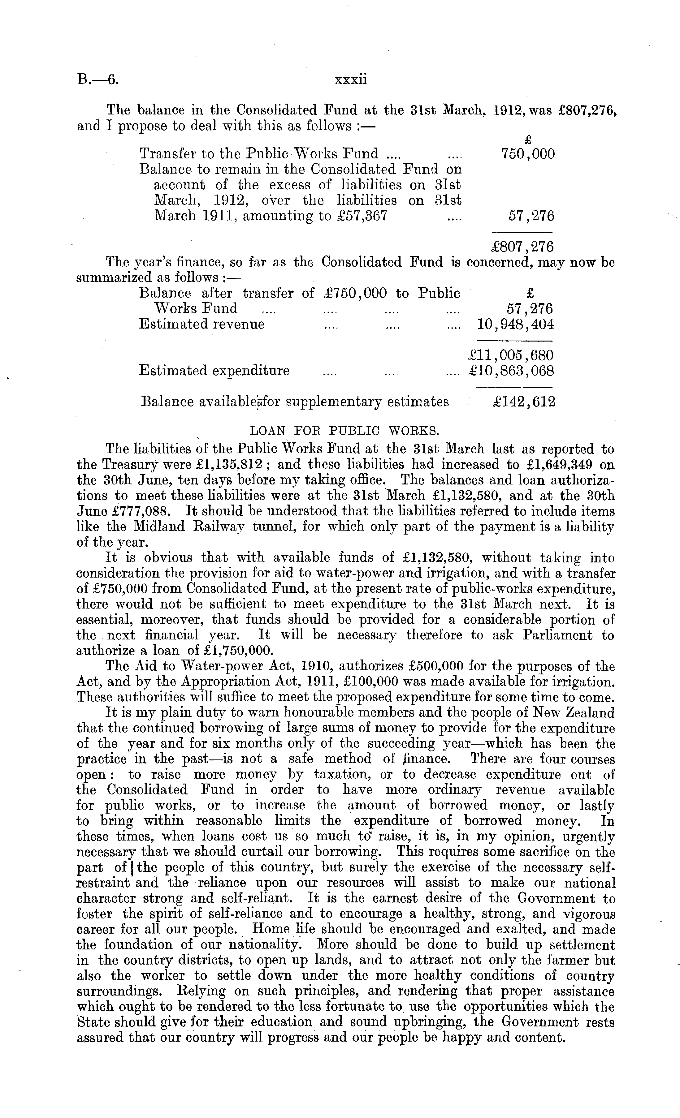 The balance in the Consolidated Fund at the 31st March, 1912, was £807,276, and I propose to deal with this as follows :— & Transfer to the Public Works Fund .... .... 750,000 Balance to remain in the Consolidated Fund on account of the excess of liabilities on 31st March, 1912, over the liabilities on 31st March 1911, amounting to £57,367 .... 57,276 £807,276 The year's finance, so far as the Consolidated Fund is concerned, may now be summarized as follows : — Balance after transfer of £750,000 to Public £ Works Fund .... .... .... .... 57,276 Estimated revenue .... .... .... 10,948,404 £11,005,680 Estimated expenditure .... .... ....£10,863,068 Balance availableafor supplementary estimates £142,612 LOAN FOR PUBLIC WOBKS. The liabilities of the Public Works Fund at the 31st March last as reported to the Treasury were £1,135.812 ; and these liabilities had increased to £1,649,349 on the 30th June, ten days before my taking office. The balances and loan authorizations to meet these liabilities were at the 31st March £1,132,580, and at the 30th June £777,088. It should be understood that the liabilities referred to include items like the Midland Eailway tunnel, for which only part of the payment is a liability of the year. It is obvious that with available funds of £1,132,580, without taking into consideration the provision for aid to water-power and irrigation, and with a transfer of £750,000 from Consolidated Fund, at the present rate of public-works expenditure, there would not be sufficient to meet expenditure to the 31st March next. It is essential, moreover, that funds should be provided for a considerable portion of the next financial year. It will be necessary therefore to ask Parliament to authorize a loan of £1,750,000. The Aid to Water-power Act, 1910, authorizes £500,000 for the purposes of the Act, and by the Appropriation Act, 1911, £100,000 was made available for irrigation. These authorities will suffice to meet the proposed expenditure for some time to come. It is my plain duty to warn honourable members and the people of New Zealand that the continued borrowing of large sums of money to provide for the expenditure of the year and for six months only of the succeeding year—which has been the practice in the past—is not a safe method of finance. There are four courses open: to raise more money by taxation, or to decrease expenditure out of the Consolidated Fund in order to have more ordinary revenue available for public works, or to increase the amount of borrowed money, or lastly to bring within reasonable limits the expenditure of borrowed money. In these times, when loans cost us so much to" raise, it is, in my opinion, urgently necessary that we should curtail our borrowing. This requires some sacrifice on the part of I the people of this country, but surely the exercise of the necessary selfrestraint and the reliance upon our resources will assist to make our national character strong and self-reliant. It is the earnest desire of the Government to foster the spirit of self-reliance and to encourage a healthy, strong, and vigorous career for all our people. Home life should be encouraged and exalted, and made the foundation of our nationality. More should be done to build up settlement in the country districts, to open up lands, and to attract not only the farmer but also the worker to settle down under the more healthy conditions of country surroundings. Relying on such principles, and rendering that proper assistance which ought to be rendered to the less fortunate to use the opportunities which the State should give for their education and sound upbringing, the Government rests assured that our country will progress and our people be happy and content.