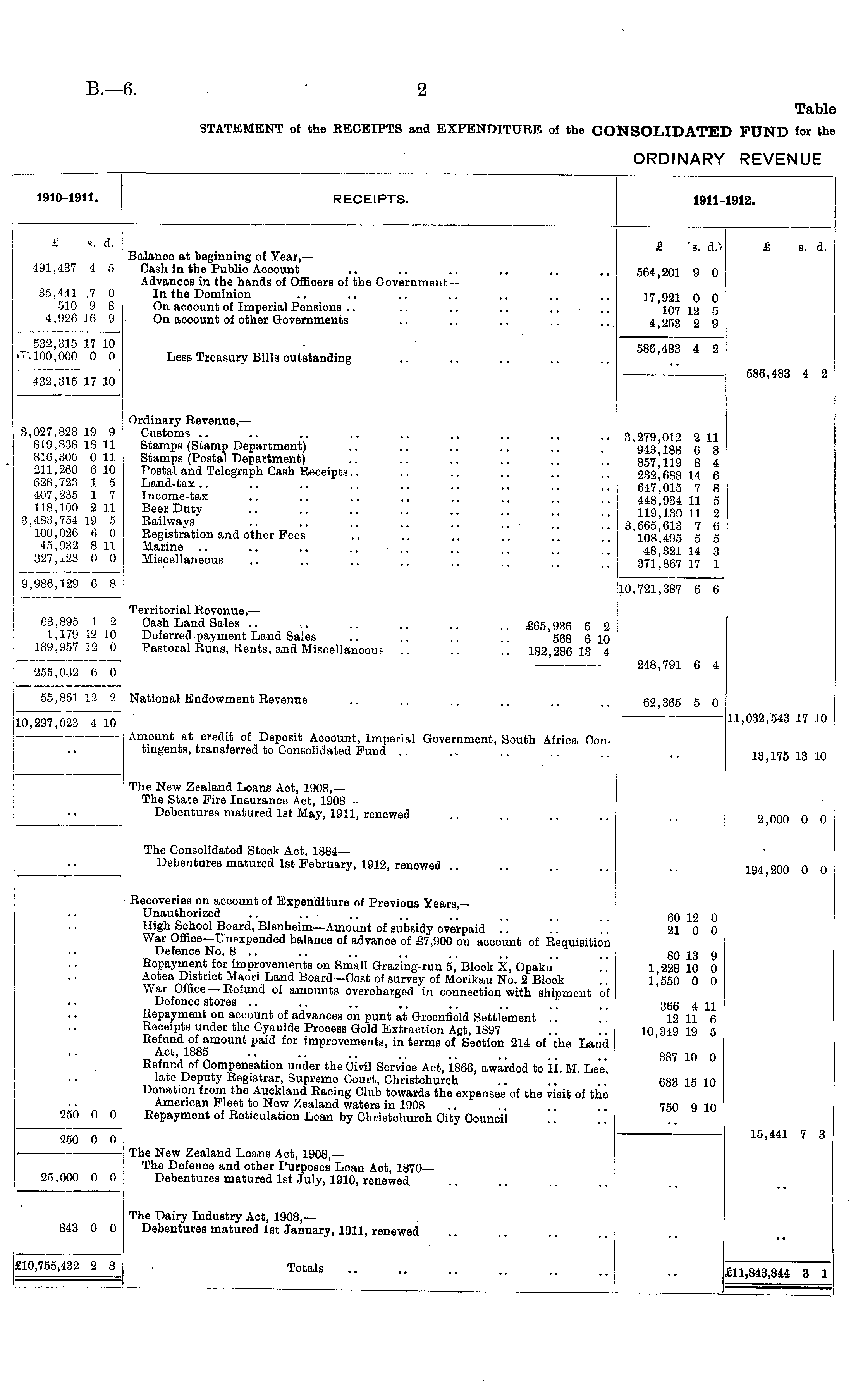 VENUE 1910-1911. RECEIPTS. 19111912. £ s. d. £ s. d.'< £ s. d. 491,437 4 5 35,441 .7 0 510 9 8 4,926 16 9 Balanoe at beginning of Year,— Cash in the Public Account Advanoes in the hands of Officers of the Government -- In the Dominion On acoount of Imperial Pensions On account of other Governments 564,201 9 0 17,921 0 0 107 12 5 4,253 2 9 532,315 17 10 »T-100,000 0 0 Less Treasury Bills outstanding 586,483 4 2 586,483 4 2 432,315 17 10 3,027,828 19 9 819,838 18 11 816,306 0 11 311,260 6 10 628,723 1 5 407,235 1 7 118,100 2 11 3,483,754 19 5 100,026 6 0 45,932 8 11 327,i23 0 0 9,986,129 6 8 Ordinary Revenue, — Customs Stamps (Stamp Department) Stamps (Postal Department) Postal and Telegraph Cash Receipts Land-tax Income-tax Beer Duty Eailways Registration and other Pees Marine Miscellaneous 3,279,012 2 11 943,188 6 3 857,119 8 4 232,688 14 6 647,015 7 8 448,934 11 5 119,130 11 2 3,665,613 7 6 108,495 5 5 48,321 14 3 371,867 17 1 Territorial Revenue, — Cash Land Sales .. ,, .. .. .. .. £65,936 6 2 Deferred-payment Land Sales .. .. .. .. 568 6 10 Pastoral Runs, Rents, and Miscellaneous .. .. .. 182,286 13 4 10,721,387 6 6 63,895 1 2 1,179 12 10 189,957 12 0 248,791 6 4 255,032 6 0 National Endowment Revenue 62,365 5 0 55,801 12 2 .0,297,023 4 10 Amount at credit of Deposit Account, Imperial Government, South Africa Contingents, transferred to Consolidated Fund 11,032,543 17 10 13,175 13 10 The New Zealand Loans Act, 1908, — The State Pire Insurance Act, 1908— Debentures matured 1st May, 1911, renewed 2,000 0 0 The Consolidated Stock Act, 1884— Debentures matured 1st February, 1912, renewed 194,200 0 0 Recoveries on account of Expenditure of Previous Years,— Unauthorized High School Board, Blenheim—Amount of subsidy overpaid .. .. .. War Offioe—Unexpended balance of advance of £7,900 on account of Requisition Defence No. 8 .. .. .. .. .. _ Repayment for improvements on Small Grazing-run 5, Block X, Opakii' Aotea District Maori Land Board—Cost of survey of Morikau No. 2 Block War Office — Refund of amounts overcharged in connection with shipment of Defence stores Repayment on account of advances on punt at Greenfield Settlement '.'. Receipts under the Cyanide Process Gold Extraction Act, 1897 Refund of amount paid for improvements, in terms of Section 214 of the Land Act, 1885 Refund of Compensation under the Civil Service Aot, 1866, awarded to H. M. Lee", late Deputy Registrar, Supreme Court, Christchuroh Donation from the Auckland Racing Club towards the expenses of the visit of the American Fleet to New Zealand waters in 1908 Repayment of Reticulation Loan by Christchurch City Council 60 12 0 21 0 0 80 13 9 1,228 10 0 1,550 0 0 366 4 11 12 11 6 10,349 19 5 387 10 0 633 15 10 250 0 0 750 9 10 250 0 0 The New Zealand Loans Act, 1908, — The Defence and other Purposes Loan Act, 1870 Debentures matured 1st July, 1910, renewed 15,441 7 3 25,000 0 0 The Dairy Industry Act, 1908,— Debentures matured 1st January, 1911, renewed 843 0 0 110,755,432 2 8 Totals £11,843,844 3 1