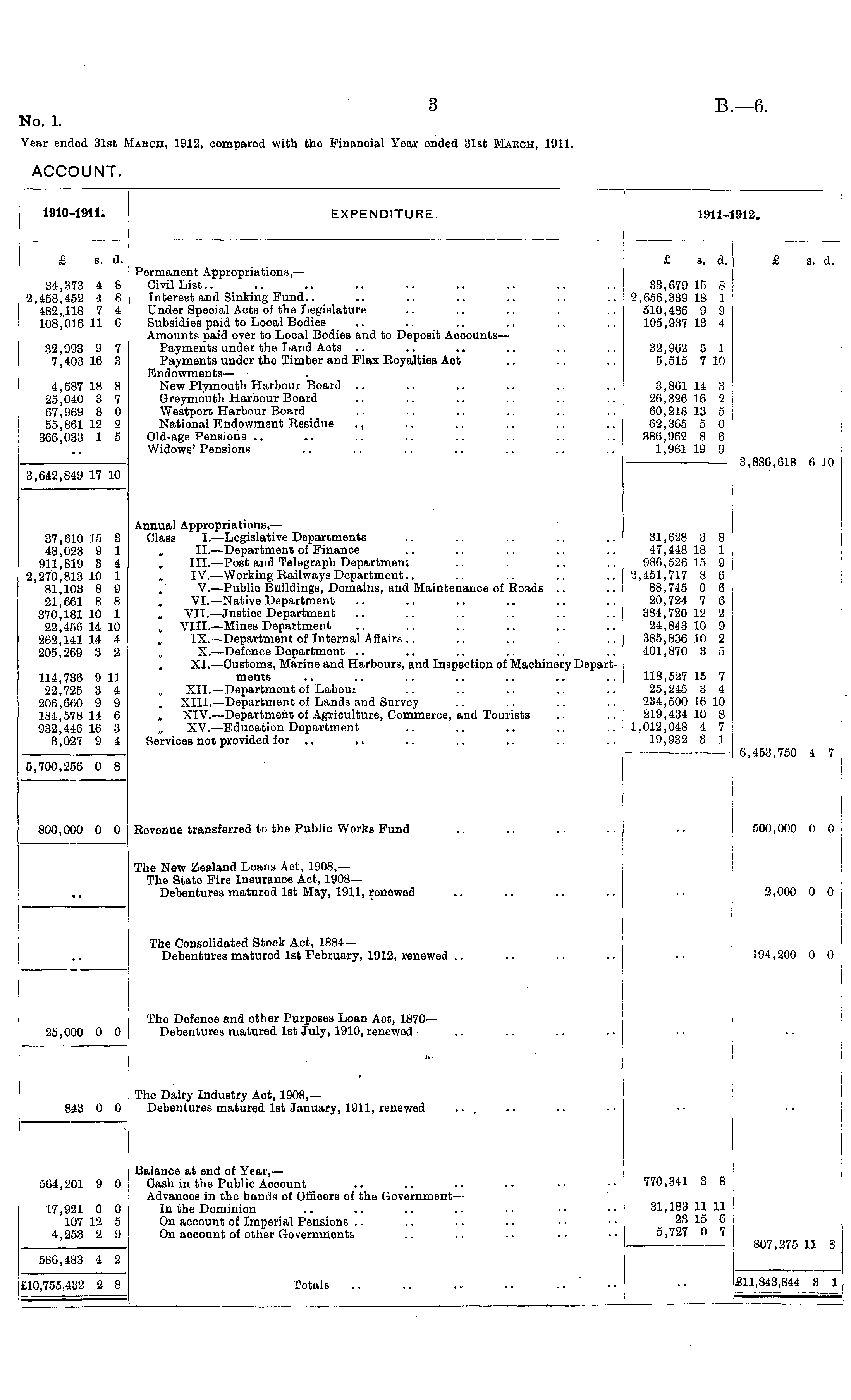 1910-1911. EXPENDITURE. 1911l912. & s. d. £ a. d. £ s. d. 34,373 4 8 2,458,452 4 8 482,118 7 4 108,016 11 6 32,993 9 7 7,403 16 3 4,587 18 8 25,040 3 7 67,969 8 0 55,861 12 2 366,033 1 5 Permanent Appropriations,— Civil List Interest and Sinking Fund.. Under Special Acts of the Legislature Subsidies paid to Local Bodies Amounts paid over to Local Bodies and to Deposit Aeeounts— Payments under the Land Acts Payments under the Timber and Flax Royalties Aot Endowments — New Plymouth Harbour Board Greymouth Harbour Board Westport Harbour Board National Endowment Besidue ., Old-age Pensions .. Widows' Pensions 33,679 15 8 2,656,339 18 1 510,486 9 9 105,937 13 4 32,962 5 1 5,515 7 10 3,861 14 3 26,326 16 2 60,218 13 5 62,365 5 0 386,962 8 6 1,961 19 9 3,886,618 6 10 3,642,849 17 10 37,610 15 3 48,023 9 1 911,819 3 4 2,270,813 10 1 81,103 8 9 21,661 8 8 370,181 10 1 22,456 14 10 262,141 14 4 205,269 3 2 Annual Appropriations, — Glass I.—Legislative Departments „ II. —Department of Finance .. .. .. ., „ III. —Post and Telegraph Department IV.—Working Railways Department.. .. V. —Publio Buildings, Domains, and Maintenance of Roads VI.—Native Department „ VII. —Justice Department VIII. —Mines Department IX.—Department of Internal Affairs .. „ X. —Defence Department XI.—Customs, Marine and Harbours, and Inspection of Maohinery Departments .. .. .. .. .. XII.—Department of Labour XIII. —Department of Lands and Survey „ XIV. —Department of Agriculture, Commerce, and Tourists .. ' .. „ XV. —Education Department Services not provided for .. .. 31,628 3 8 47,448 18 1 986,526 15 9 '2,451,717 8 6 88,745 0 6 20,724 7 6 384,720 12 2 24,843 10 9 385,836 10 2 401,870 3 5 114,736 9 11 22,725 3 4 206,660 9 9 184,578 14 6 932,446 16 3 8,027 9 4 118,527 15 7 25,245 3 4 234,500 16 10 219,434 10 8 1,012,048 4 7 19,932 3 1 6,453,750 4 7 5,700,256 0 8 Revenue transferred to the Public Works Fund 500,000 0 0 800,000 0 0 The New Zealand Loans Aot, 1908,— The State Fire Insurance Aot, 1908 — Debentures matured 1st May, 1911, renewed 2,000 0 0 The Consolidated Stook Act, 1884— Debentures matured 1st February, 1912, renewed 194,200 0 0 The Defence and other Purposes Loan Act, 1870 — Debentures matured 1st July, 1910, renewed 25,000 0 0 *- 843 0 0 The Dairy Industry Act, 1908,— Debentures matured 1st January, 1911, renewed ... 564,201 9 0 17,921 0 0 107 12 5 4,253 2 9 Balance at end of Year, — Cash in the Publio Acoount Advances in the hands of Officers of the Government — In the Dominion On account of Imperial Pensions On aocount of other Governments 770,341 3 8 31,183 11 11 23 15 6 5,727 0 7 807,275 11 8 586,483 4 2 ;i0,755,432 2 8 Totals £11,843,844 3 1