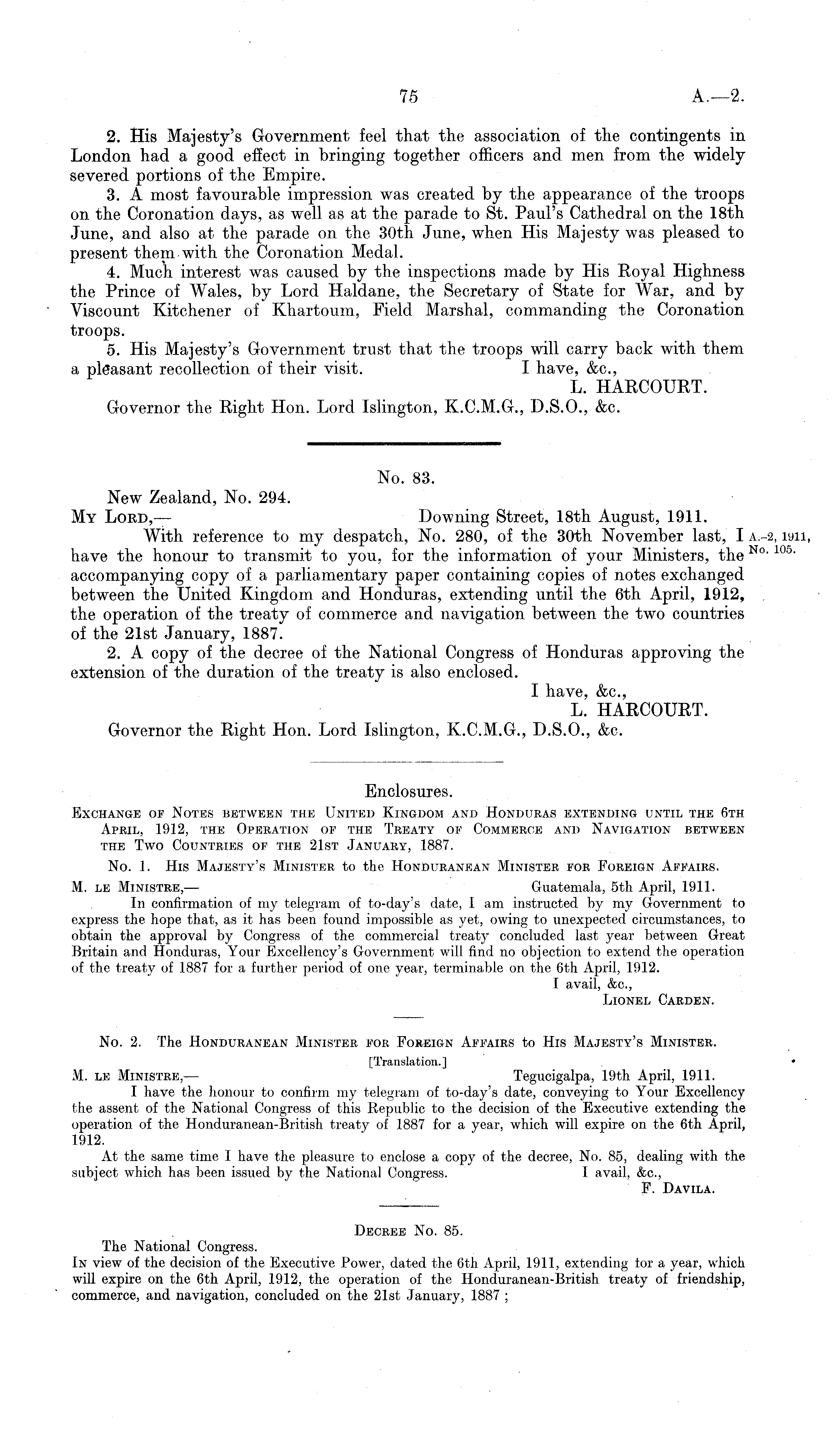 No. 83. New Zealand, No. 294. My Lord, — Downing Street, 18th August, 1911. With reference to my despatch, No. 280, of the 30th November last, I have the honour to transmit to you, for the information of your Ministers, the accompanying copy of a parliamentary paper containing copies of notes exchanged between the United Kingdom and Honduras, extending until the 6th April, 1912, the operation of the treaty of commerce and navigation between the two countries of the 21st January, 1887. 2. A copy of the decree of the National Congress of Honduras approving the extension of the duration of the treaty is also enclosed. I have, &c, L. HARCOURT. Governor the Right Hon. Lord Islington, K.C.M.G., D.5.0., &c. Enclosures. Exchange of Notes between the United Kingdom and Hondueas extending until the 6th April, 1912, the Opeeation of the Teeaty of Commeeoe and Navigation between the two counteies of the 21st januaey, 1887. No. 1. His Majesty's Minister to the Honduranean Minister for Foreign Affairs. M. le MiNisTRE,— Guatemala, sth April, 1911. In confirmation of my telegram of to-day's date, 1 am instructed by my Government to express the hope that, as it has been found impossible as yet, owing to unexpected circumstances, to obtain the approval by Congress of the commercial treaty concluded last year between Great Britain and Honduras, Your Excellency's Government will find no objection to extend the operation of the treaty of 1887 for a further period of one year, terminable on the 6th April, 1912. I avail, &c, Lionel Carden. No. 2. The Honduranean Minister for Foreign Affairs to His Majesty's Minister. [Translation.] M. le Ministee,— Tegucigalpa, 19th April, 1911. I have the honour to confirm my telegram of to-day's date, conveying to Your Excellency the assent of the National Congress of this Republic to the decision of the Executive extending the operation of the Honduranean-British treaty of 1887 for a year, which will expire on the 6th April, 1912. At the same time I have the pleasure to enclose a copy of the decree, No. 85, dealing with the subject which has been issued by the National Congress. I avail, &c, F. Davila. Decree No. 85. The National Congress. In view of the decision of the Executive Power, dated the 6th April, 1911, extending tor a year, which will expire on the 6th April, 1912, the operation of the Honduranean-British treaty of friendship, commerce, and navigation, concluded on the 21st January, 1887 ;