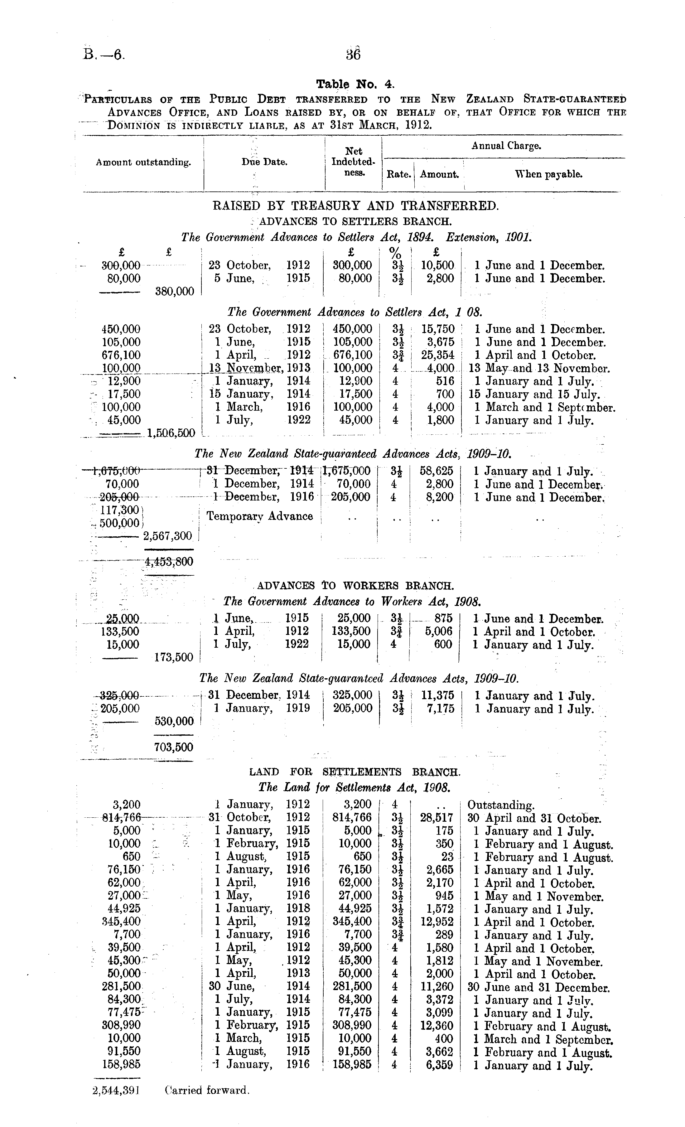 Table No. 4. Particulars of the Public Debt transferred to the New Zealand State-guaranteed Advances Office, and Loans raised by, or on behalf of, that Office for which the Dominion is indirectly liable, as at 31st March, 1912.