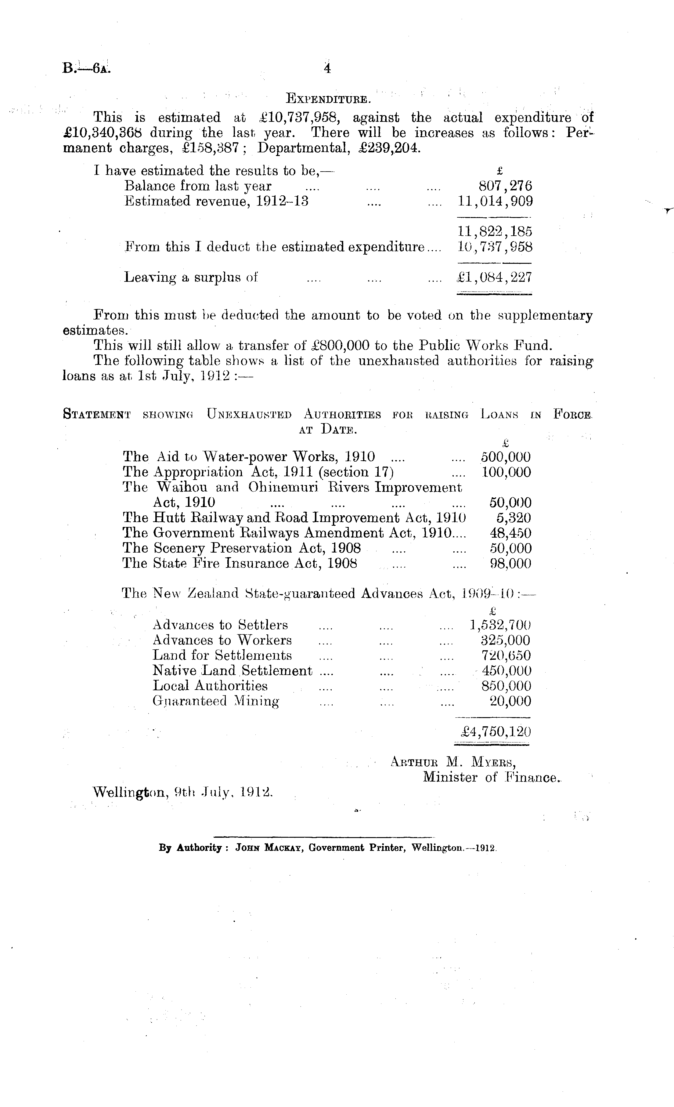 Expenditure. This is estimated at £10,737,958, against the actual expenditure of £10,340,368 during the last, year. There will be increases as follows: Permanent charges, £158,887; Departmental, .£239,204. I have estimated the results to be, — £ Balance from last year .... .... .... 807,276 Estimated revenue, 1912-13 .... .... 11,014,909 11,822,185 From this I deduct the estimated expenditure.... 10.,787,958 Leaving a surplus of .... .... .... £1,084,227 From this must be deducted the amount to be voted on the supplementary estimates. This will still allow a transfer of £800,000 to the Public Works Fund. The following table shows a list of the unexhausted authorities for raising , loans as at Ist July, 1912 :— Statement showing Unexhausted Authorities for raising Loans in Fokce at Date. The Aid to Water-power Works, 1910 .... .... 500,000 The Appropriation Act, 1911 (section 17) .... 100,000 The Waihou and Ohinemuri Rivers Improvement Act, 1910 .... .... .... .... 50,000 The Hutt Railway and Road Improvement Act, 1910 5,320 The Government Railways Amendment Act, 1910.... 48,450 The Scenery Preservation Act, 1908 .... .... 50,000 The State Fire Insurance Act, 1908 .... .... 98,000 The New Zealand State-guaranteed Advances Act, 1909-10: — ■ ■ .. ' £ Advances to Settlers .... .... .... 1,532,700 Advances to Workers .... .... .... 325,000 Land for Settlements .... .... .... 720,650 Native Land Settlement .... .... 450,000 Local Authorities .... .... :.... 850,000 Guaranteed Mining .... .... .... 20,000 £4,750,120 : Arthur M. Mtebs, Minister of "Finance. Wellington, 9th July, 1912.