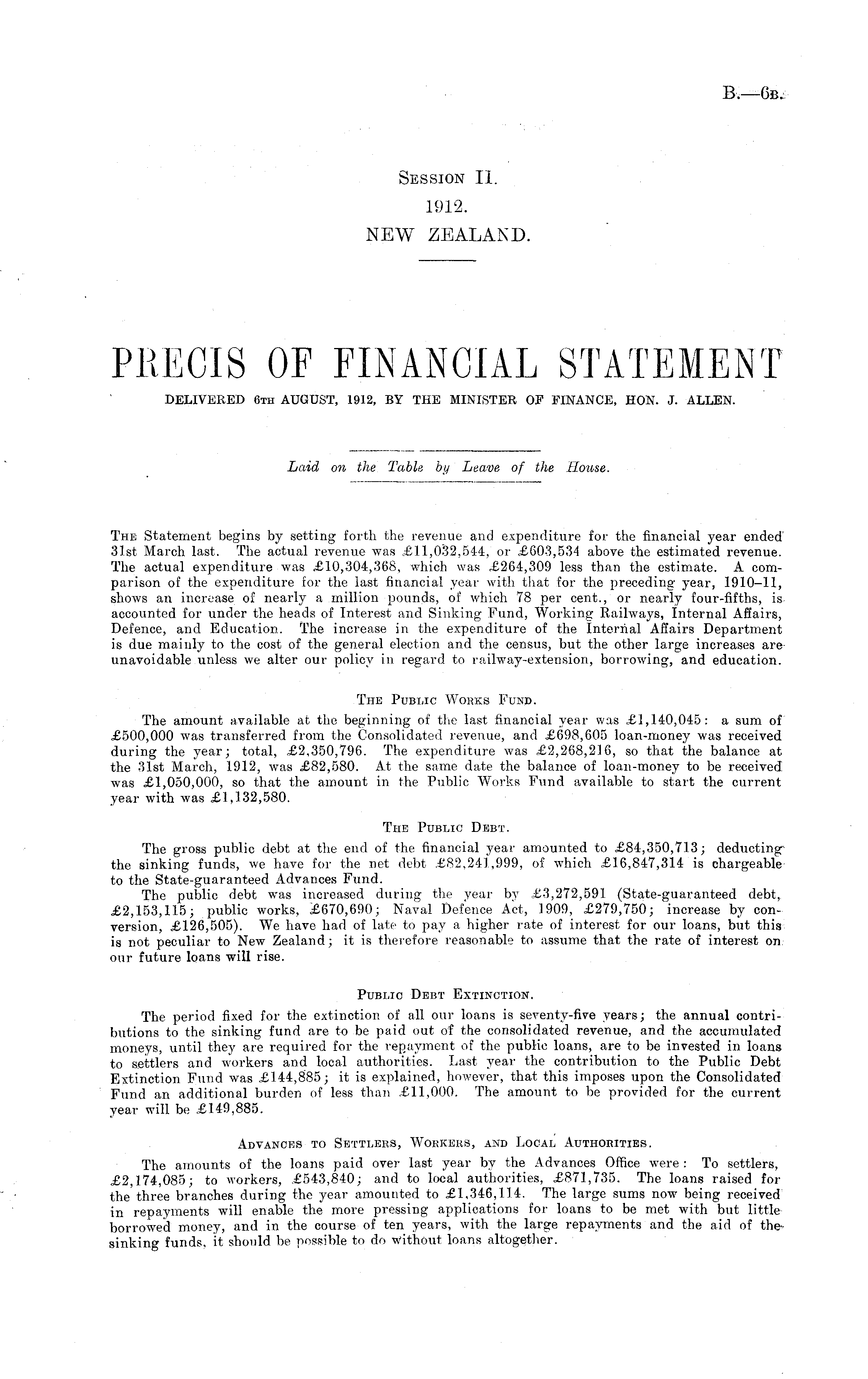 PRECIS OF FINANCIAL STATEMENT DELIVERED 6th AUGUST, 1912, BY THE MINISTER OF FINANCE, HON. J. ALLEN.