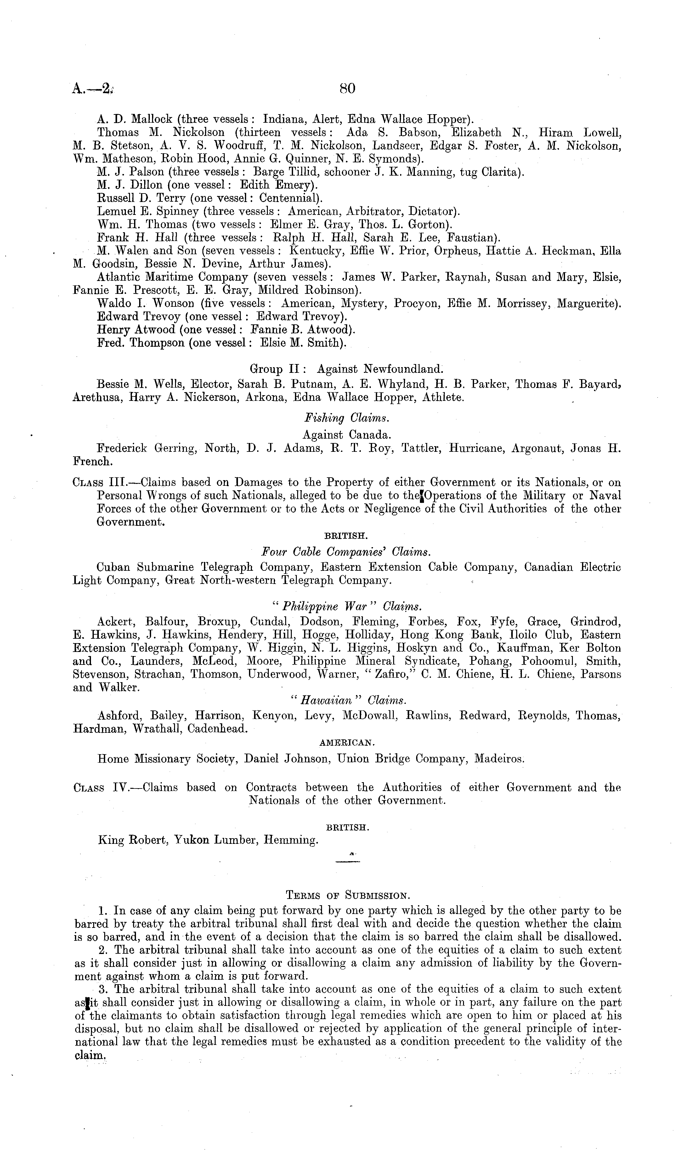 A. D. Mallock (three vessels: Indiana, Alert, Edna Wallace Hopper). Thomas M. Nickolson (thirteen vessels: Ada S. Babson, Elizabeth N., Hiram Lowell, M. B. Stetson, A. V. S. Woodruff, T. M. Nickolson, Landseer, Edgar S. Foster, A. M. Nickolson, Wm. Matheson, Robin Hood, Annie G. Quinner, N. E. Symonds). M. J. Palson (three vessels : Barge Tillid, schooner J. K. Manning, tug Clarita). M. J. Dillon (one vessel: Edith Emery). Russell D. Terry (one vessel: Centennial). Lemuel E. Spinney (three vessels : American, Arbitrator, Dictator). Wm. H. Thomas (two vessels : Elmer E. Gray, Thos. L. Gorton). Frank H. Hall (three vessels : Ralph H. Hall, Sarah E. Lee, Faustian). M. Walen and Son (seven vessels : Kentucky, Effie W. Prior, Orpheus, Hattie A. Heckman, Ella M. Goodsin, Bessie N. Devine, Arthur James). Atlantic Maritime Company (seven vessels : James W. Parker, Raynah, Susan and Mary, Elsie, Fannie E. Prescott, E. E. Gray, Mildred Robinson). Waldo I. Wonson (five vessels : American, Mystery, Procyon, Effie M. Morrissey, Marguerite). Edward Trevoy (one vessel: Edward Trevoy). Henry Atwood (one vessel: Fannie B. Atwood). Fred. Thompson (one vessel: Elsie M. Smith). Group II: Against Newfoundland. Bessie M. Wells, Elector, Sarah B. Putnam, A. E. Whyland, H. B. Parker, Thomas F. Bayard, Arethusa, Harry A. Nickerson, Arkona, Edna Wallace Hopper, Athlete. Fishing Claims. Against Canada. Frederick Gerring, North, D. J. Adams, R. T. Roy, Tattler, Hurricane, Argonaut, Jonas H. French. Class 111.—Claims based on Damages to the Property of either Government or its Nationals, or on Personal Wrongs of such Nationals, alleged to be due to theJOperations of the Military or Naval Forces of the other Government or to the Acts or Negligence of the Civil Authorities of the other Government. BRITISH. Four Cable Companies' Claims. Cuban Submarine Telegraph Company, Eastern Extension Cable Company, Canadian Electric Light Company, Great North-western Telegraph Company. " Philippine War " Claims. Ackert, Balfour, Broxup, Cundal, Dodson, Fleming, Forbes, Fox, Fyfe, Grace, Grindrod, E. Hawkins, J. Hawkins, Hendery, Hill, Hogge, Holliday, Hong Kong Bank, Iloilo Club, Eastern Extension Telegraph Company, W. Higgin, N. L. Higgins, Hoskyn and Co., Kauffman, Ker Bolton and Co., Launders, McLeod, Moore, Philippine Mineral Syndicate, Pohang, Pohoomul, Smith, Stevenson, Strachan, Thomson, Underwood, Warner, " Zafiro," C. M. Chiene, fl. L. Chiene, Parsons and Walker. " Hawaiian " Claims. Ashford, Bailey, Harrison, Kenyon, Levy, McDowall, Rawlins, Redward, Reynolds, Thomas, Hardman, Wrathall, Cadenhead. AMERICAN. Home Missionary Society, Daniel Johnson, Union Bridge Company, Madeiros. Class IV.—Claims based on Contracts between the Authorities of either Government and the Nationals of the other Government. BRITISH. King Robert, Yukon Lumber, Hemming.