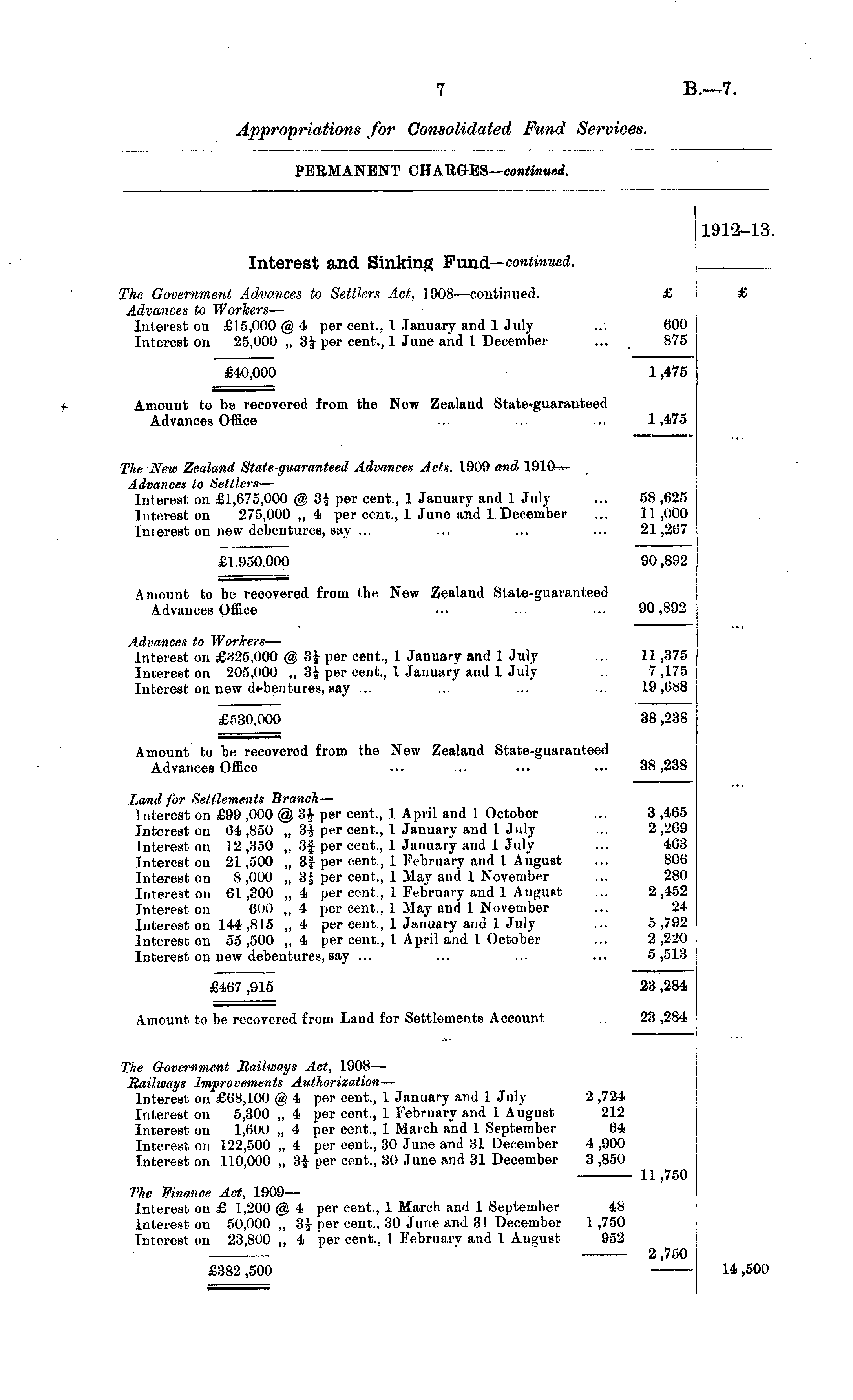 1912-1 Interest and Sinking Fund— continued. The Government Advances to Settlers Act, 1908 —continued. £ Advances to Workers — Interest on £15,000 @ 4 per cent., 1 January and 1 July ... 600 Interest on 25,000 „ 3| per cent., 1 June and I December ... , 875 £ £40,000 1,475 Amount to be recovered from the New Zealand State-guaranteed Advances Office ... ... ... 1,475 The New Zealand State-guaranteed Advances Acts, 1909 and 1910— Advances to Settlers — Interest on £1,675,000 @ per cent., 1 January and 1 July ... 58 ,625 Interest on 275,000 „ 4 per cent., 1 June and 1 December ... 11,000 Interest on new debentures, say ... ... ... ... 21,267 £1.950.000 90,892 Amount to be recovered from the New Zealand State-guaranteed Advances Office ... ... ... 90,892 Advances to Workers — Interest on £325.000 @ 3£ per cent., 1 January and 1 July ... 11 ,375 Interest on 205,000 „ 3? per cent., 1 January and 1 July ... 7,175 Interest on new debentures, say ... ... ... ... 19,688 £530,000 38,238 Amount to be recovered from the New Zealand State-guaranteed Advances Office ... ... ... ... 38,238 Land for Settlements Branch — Interest on £99 ,000 @ 3| per cent., 1 April and 1 October ... 3,465 Interest on 64 ,850 „ 3£ per cent., 1 January and 1 July ... 2 ,269 Interest on 12,350 „ 3f per cent., 1 January and 1 July ... 463 Interest on 21,500 „ 3f per cent., 1 February and 1 August ... 806 Interest on 8 ,000 „ 3| per cent., 1 May and 1 November ... 280 Interest on 61,300 „4 per cent., 1 February and 1 August ... 2,452 Interest on 600 ,, 4 per cent., 1 May and 1 November ... 24 Interest on 144,815 „ 4 per cent., 1 January and 1 July ... 5 ,792 Interest on 55 ,500 „ 4 per cent., 1 April aud 1 October ... 2 ,220 Interest on new debentures, say ... ... ... ... 5,513 £467 ,915 23 ,284 Amount to be recovered from Land for Settlements Account ... 23 ,284 The Government Hallways Act, 1908— Railways Improvements Authorization — Interest on £68,100 @ 4 per cent., 1 January and 1 July 2 ,724 Interest on 5,300 „ 4 per cent., 1 February and 1 August 212 Interest on 1,600 „ 4 per cent., 1 March and 1 September 64 Interest on 122,500 „ 4 per cent., 30 June and 31 December 4 ,900 Interest on 110,000 „ 3£ per cent., 30 June and 31 December 3 ,850 11,750 The Finance Act, 1909— Interest on £ 1,200 @ 4 per cent., 1 March and 1 September 48 Interest on 50,000 „ 3| per cent., 30 June and 31 December 1 ,750 Interest on 23,800 „ 4 per cent., 1 February and 1 August 952 2,750 £382,500 14 ,500