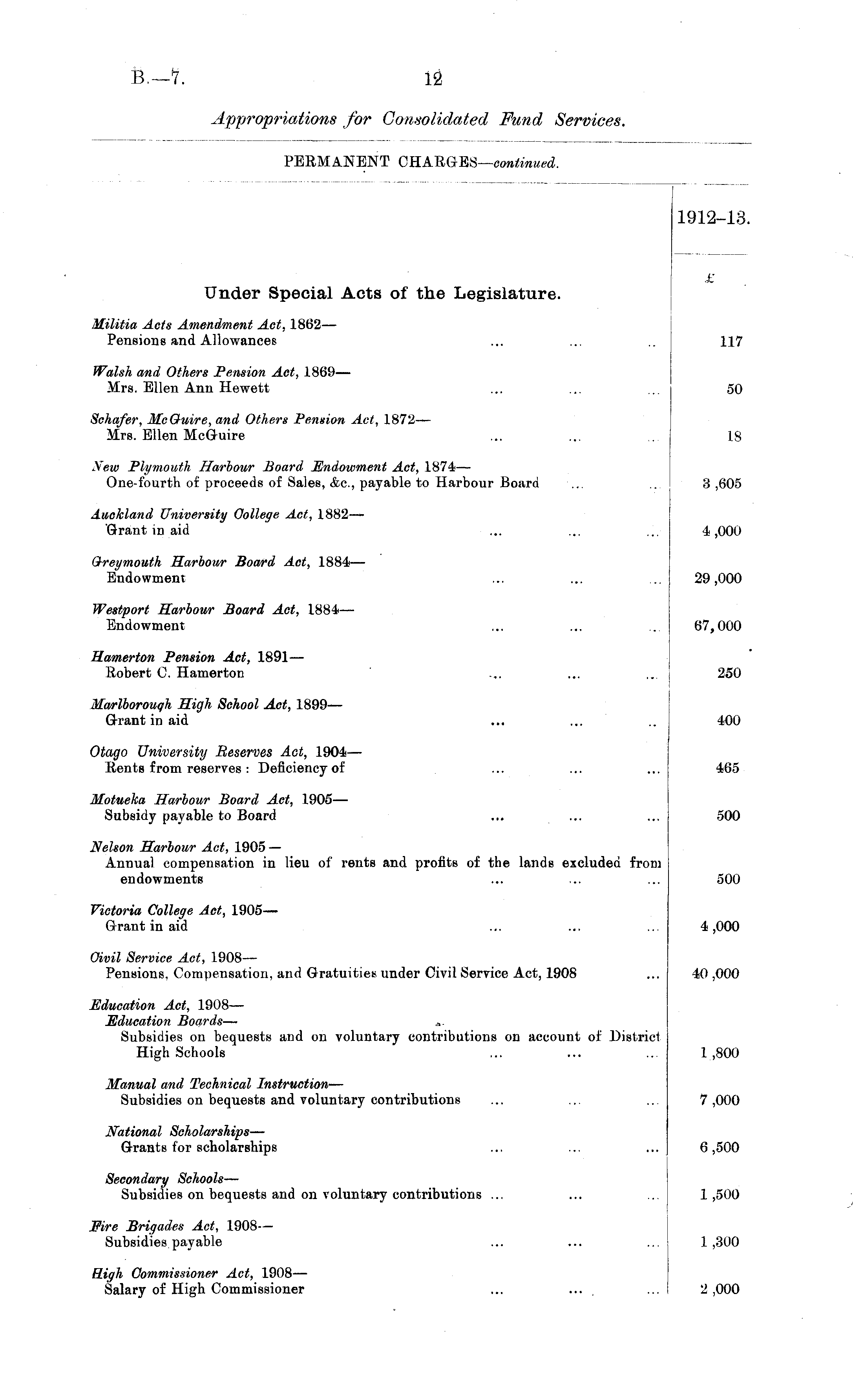 1912-18. £ Under Special Acts of the Legislature. Militia Acts Amendment Act, 1862— Pensions and Allowances 117 Walsh and Others Pension Act, 1869— Mrs. Ellen Ann Hewett 50 Schafer, McQuire, and Others Pension Act, 1872— Mrs. Ellen McGuire 18 New Plymouth Harbour Board Endowment Act, 1874— One-fourth of proceeds of Sales, &c, payable to Harbour Board 3,605 Auckland University Oollege Act, 1882— Grant in aid 4,000 Q-reymouth Harbour Board Act, 1884— Endowment 29 ,000 Westport Harbour Board Act, 1884 — Endowment 67,000 Hamerton Pension Act, 1891— Robert C. Hamerton 250 Marlborouqh High School Act, 1899 — Grant in aid 400 Otago University Reserves Act, 1904 — Rents from reserves : Deficiency of 465 Motueka Harbour Board Act, 1905— Subsidy payable to Board 500 Nelson Harbour Act, 1905 — Annual compensation in lieu of rents and profits of the lands excluded from endowments 500 Victoria College Act, 1905— Grant in aid 4,000 Oivil Service Act, 1908— Pensions. Compensation, and Gratuities under Civil Service Act, 1908 40 ,000 Education Act, 1908— Education Boards — *. Subsidies on bequests and on voluntary contributions on account of District High Schools 1,800 Manual and Technical Instruction — Subsidies on bequests and voluntary contributions 7,000 National Scholarships — Grants for scholarships 6,500 Secondary Schools — Subsidies on bequests and on voluntary contributions ... 1,500 Fire Brigades Act, 1908 — Subsidies payable 1,300 High Commissioner Act, 1908 — Salary of High Commissioner ... .... 2,000