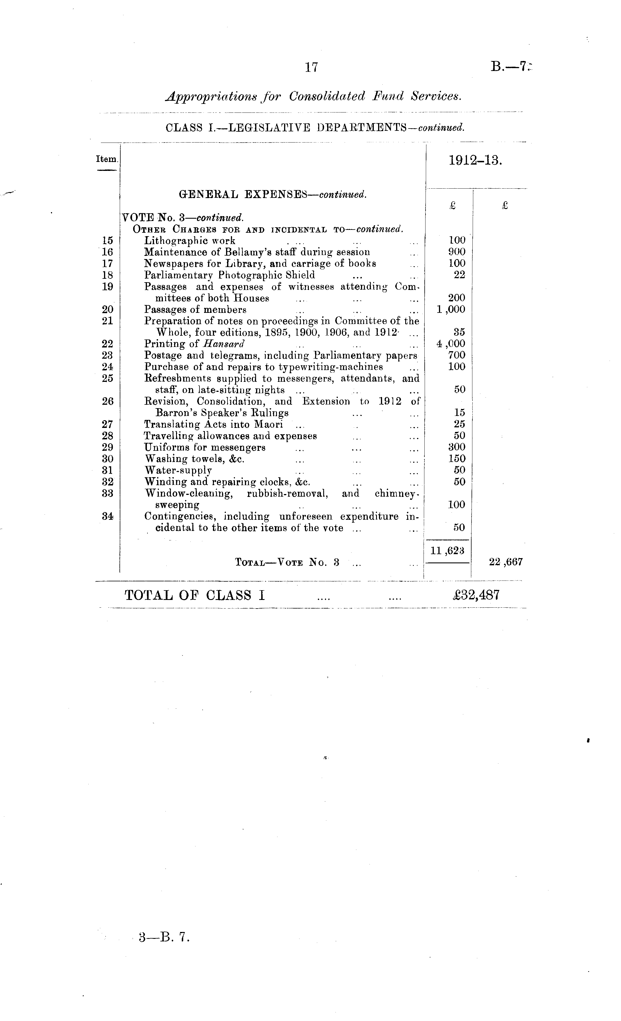 Item 191. 1-13. GENERAL EXPENSES— continued. VOTE No. 3—continued. Other Charges for and incidental to — continued. Lithographic work . ... Maintenance of Bellamy's staff during session Newspapers for Library, and carriage of books Parliamentary Photographic Shield Passages and expenses of witnesses attending Committees of both Houses Passages of members Preparation of notes on proceedings in Committee of the Whole, four editions, 1895, 1900, 1906, and 1912- ... Printing of Hansard Postage and telegrams, including Parliamentary papers Purchase of and repairs to typewriting-machines Refreshments supplied to messengers, attendants, and staff', on late-sitting nights ... Revision, Consolidation, and Extension to 1912 of Barron's Speaker's Rulings Translating Acts into Maori Travelling allowances and expenses Uniforms for messengers Washing towels, &c. Water-supply Winding and repairing clocks, &c. Window-cleaning, rubbish-removal, and chimneysweeping Contingencies, including unforeseen expenditure incidental to the other items of the vote ... £ £ 15 16 17 18 19 100 900 100 22 20 21 200 1,000 22 23 24 25 35 4,000 700 100 50 26 15 25 50 300 150 50 50 27 28 29 30 31 32 33 100 34 50 22 ,667 Total—Vote No. 3 11,623 TOTAL OF CLASS I £3 C , >,487