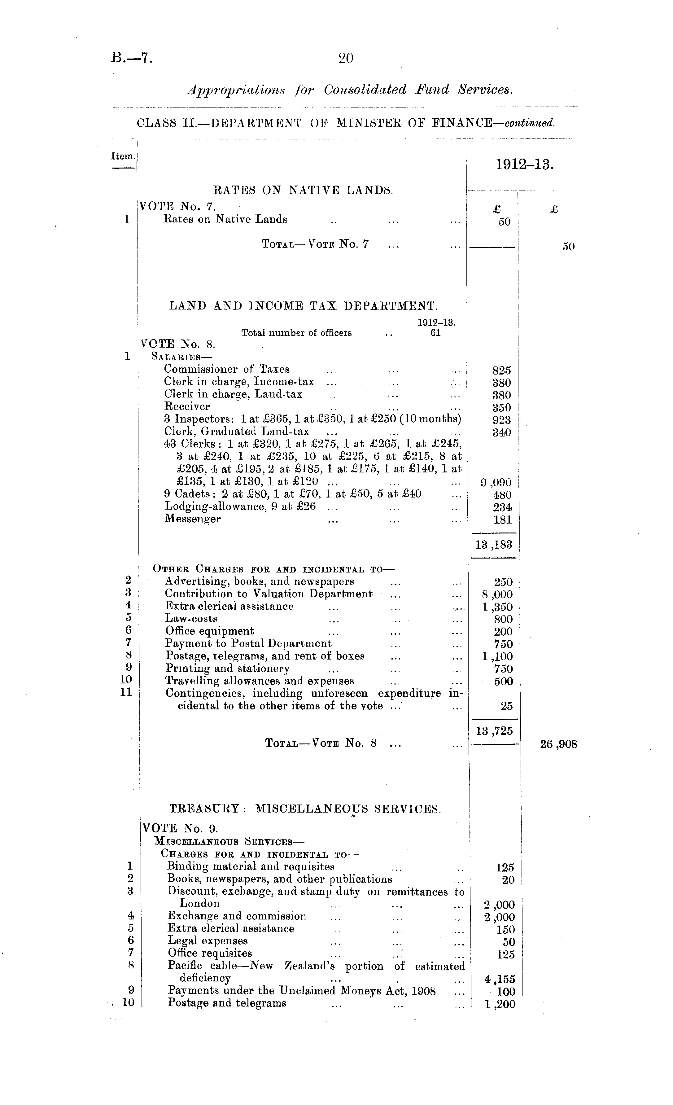 ;tem. 191 2-13. KATES ON NATIVE LANDS. VOTE No. 7. Bates on Native Lands £ 50 £ Total — Vote No. 7 50 LAND AND INCOME TAX DEPARTMENT. 1912-13. Total number of officers .. 61 VOTE No. 8. Salabies— Commissioner of Taxes ... ... .... Clerk in charge, Income-tax ... Clerk in charge, Land-tax ... ... ... Receiver 3 Inspectors: 1 at £365,1 at £350, 1 at £250 (10 months) Clerk, Graduated Land-tax 43 Clerks : 1 at £320, 1 at £275, 1 at £265, 1 at £245, 3 at £240, 1 at £235, 10 at £225, 6 at £215, 8 at £205, 4 at £195, 2 at £185, 1 at £175, 1 at £140, 1 at £135, 1 at £130, 1 at £120 ... 9 Cadets: 2 at £80, 1 at £70, 1 at £50, 5 at £40 Lodging-allowance, 9 at £26 ... Messenger 825 380 380 350 923 340 i 9,090 I 480 234 181 Othee Chahges foe and incidental to — Advertising, books,, and newspapers Contribution to Valuation Department Extra clerical assistance Law-costs Office equipment Payment to Postal Department Postage, telegrams, and rent of boxes Printing and stationery Travelling allowances and expenses Contingencies, including unforeseen expenditure incidental to the other items of the vote ... 13 ,183 2 3 4 5 6 7 8 9 10 11 250 8,000 1,350 800 200 750 1,100 750 500 25 Total —Vote No. 8 ... 13 ,725 26 ,90i TREASURY : MISCELLANEOUS SERVICES 1 2 8 4 5 6 7 8 VOTE No. 9. Miscellaneous Services — Chaeges foe and incidental to — Binding material and requisites Books, newspapers, and other publications Discount, exchange, and stamp duty on remittances to London Exchange and commission Extra clerical assistance Legal expenses ... ... ... Office requisites Pacific cable —New Zealand's portion of estimated deficiency Payments under the Unclaimed Moneys Act, 1908 Postage and telegrams 125 20 2 ,000 2,000 150 50 125 9 10 4,155 100 1,200