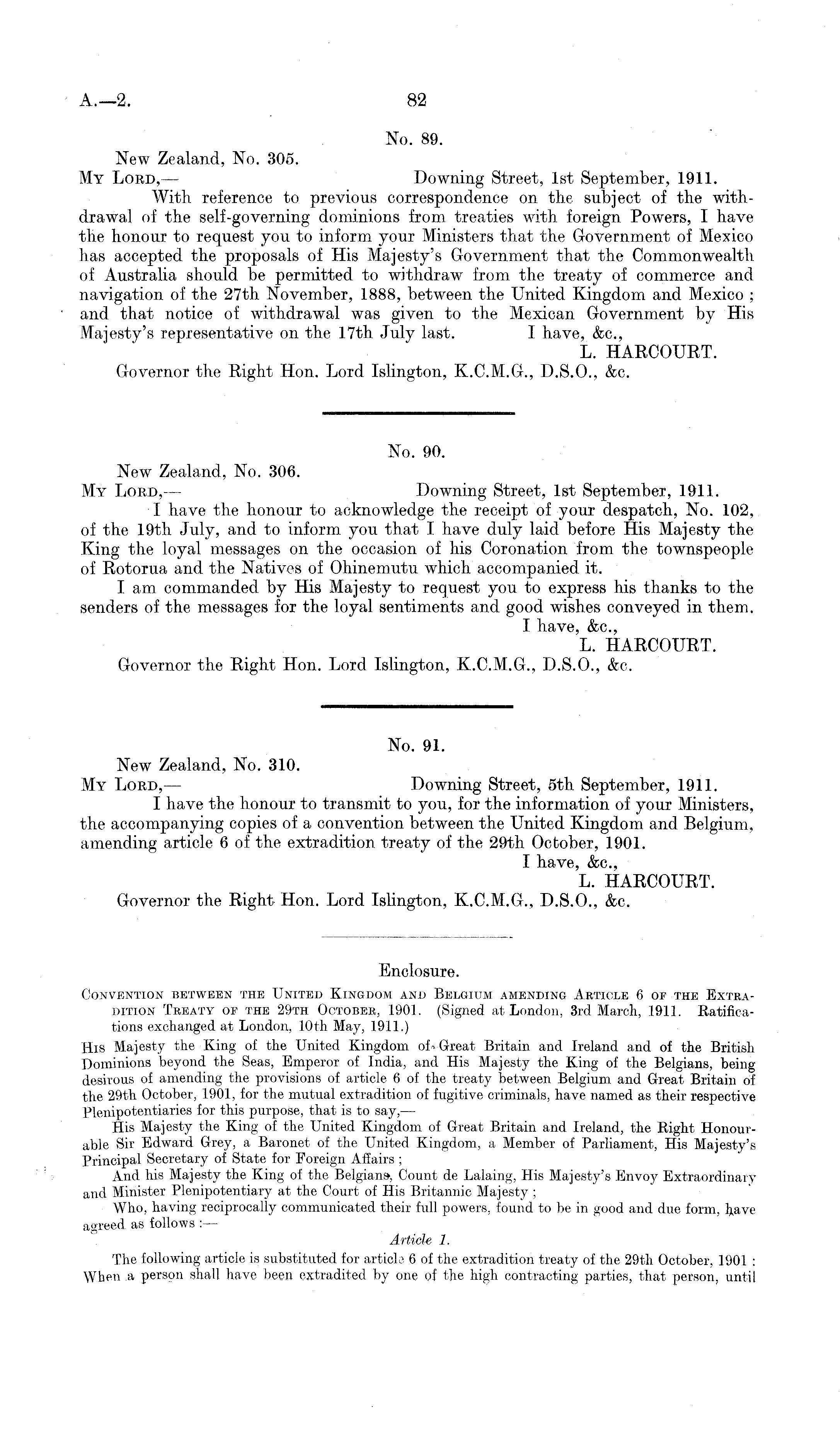 No. 90. New Zealand, No. 306. My Lord, — Downing Street, Ist September, 1911. I have the honour to acknowledge the receipt of your despatch, No. 102, of the 19th July, and to inform you that I have duly laid before His Majesty the King the loyal messages on the occasion of his Coronation from the townspeople of Rotorua and the Natives of Ohinemutu which accompanied it. I am commanded by His Majesty to request you to express his thanks to the senders of the messages for the loyal sentiments and good wishes conveyed in them. I have, &c, L. HARCOURT. Governor the Right Hon. Lord Islington, K.C.M.G., D.5.0., &c. No. 91. New Zealand, No. 310. My Lord,— Downing Street, sth September, 1911. I have the honour to transmit to you, for the information of your Ministers, the accompanying copies of a convention between the United Kingdom and Belgium, amending article 6 of the extradition treaty of the 29th October, 1901. I have, &c, L. HARCOURT. Governor the Right Hon. Lord Islington, K.C.M.G., D.5.0., &c. Enclosure. Convention between the United Kingdom and Belgium amending Article 6 of the Extradition Treaty of the 29th October, 1901. (Signed at London, 3rd March, 1911. Ratifications exchanged at London, 10th May, 1911.) His Majesty the King of the United Kingdom of-. Great Britain and Ireland and of the British Dominions beyond the Seas, Emperor of India, and His Majesty the King of the Belgians, being desirous of amending the provisions of article 6 of the treaty between Belgium and Great Britain of the 29th October, 1901, for the mutual extradition of fugitive criminals, have named as their respective Plenipotentiaries for this purpose, that is to say,— His Majesty the King of the United Kingdom of Great Britain and Ireland, the Right Honourable Sir Edward Grey, a Baronet of the United Kingdom, a Member of Parliament, His Majesty's Principal Secretary of State for Foreign Affairs ; And his Majesty the King of the Belgians-, Count de Lalaing, His Majesty's Envoy Extraordinary and Minister Plenipotentiary at the Court of His Britannic Majesty ; Who, having reciprocally communicated their full powers, found to be in good and due form, have agreed, as follows :— Article 1. The following article is substituted for articla 6 of the extradition treaty of the 29th October, 1901 : When .a person shall have been extradited by one of the high contracting parties, that person, until