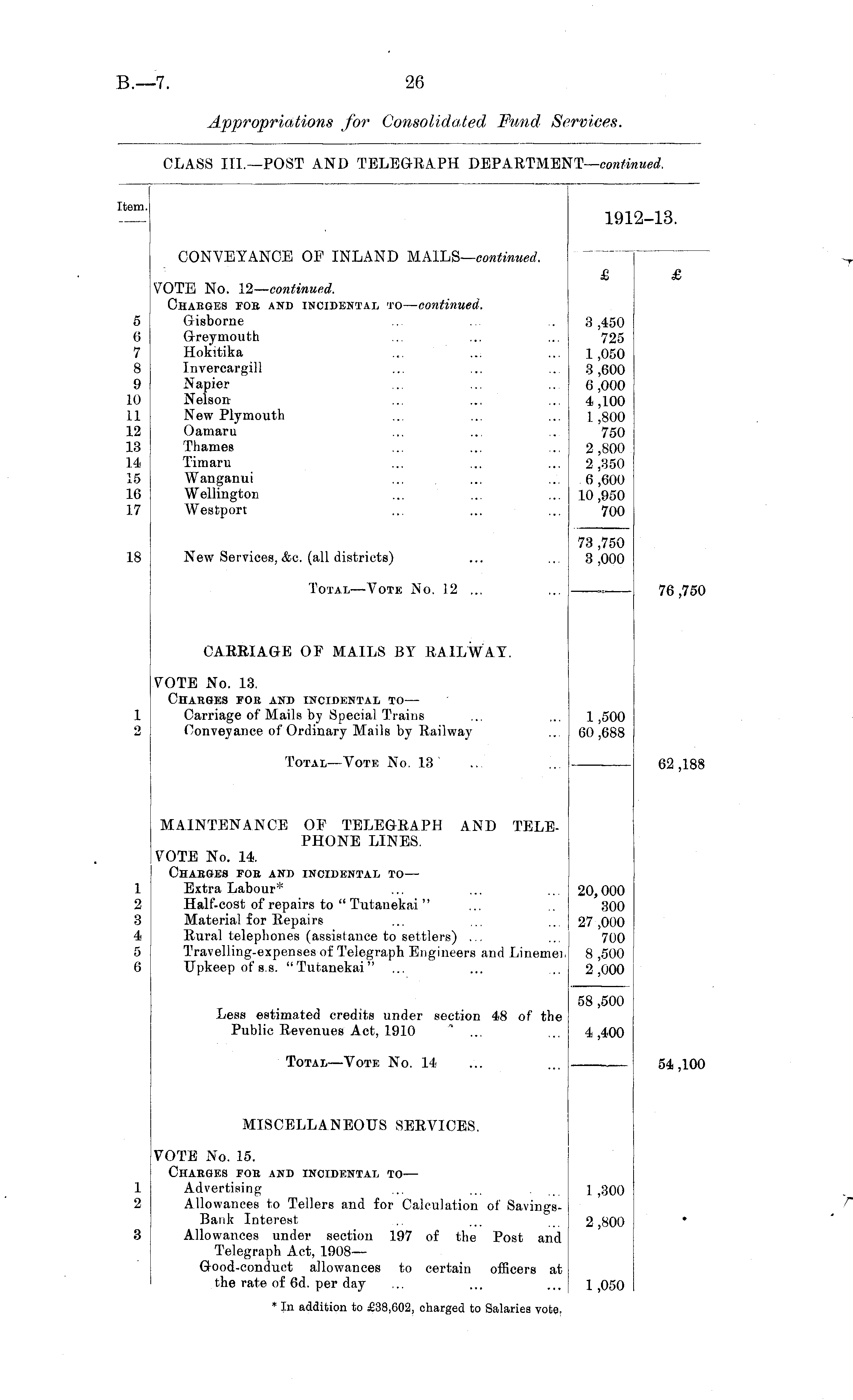 item. 191 1-13. CONVEYANCE OP INLAND MAILS— continued. VOTE No. 12— continued. Charges for and incidental to — continued. Gisborne Greymouth Hokitika Invercargill Napier Nelson New Plymouth Oamaru Thames Timaru Wanganui ... ... Wellington Westport £ £ 5 6 7 8 9 10 1.1 12 13 14 15 16 17 3,450 725 1,050 3 ,600 6,000 4,100 1,800 750 2,800 2 ,350 6 ,600 10 ,950 700 18 New Services, &c. (all districts) 73 ,750 3,000 Total —Vote No. 12 ... 76 ,75' CARRIAGE OF MAILS BY RAILWAY. VOTE No. 18. Charges for and incidental to — Carriage of Mails by Special Trains Conveyance of Ordinary Mails by Railway 1 2 1,500 60 ,688 Total—Vote No. 13 62 ,18: MAINTENANCE OP TELEGRAPH AND TELEPHONE LINES. 1 2 3 4 5 6 VOTE No. 14. Chaeges fob and incidental to — Extra Labour* Half-cost of repairs to " Tutanekai " Material for Repairs Rural telephones (assistance to settlers) ... Travelling-expenses of Telegraph Engineers and Linemei. Upkeep of s.s. "Tutanekai" 20,000 300 27 ,000 700 8,500 2,000 Less estimated credits under section 48 of the Public Revenues Act, 1910 ... 58 ,500 4,400 Total—Vote No. 14 54 ,10i MISCELLANEOUS SERVICES. 1 2 VOTE No. 15. Charges for and incidental to — Advertising Allowances to Tellers and for Calculation of SavingsBank Interest Allowances under section 197 of the Post and Telegraph Act, 1908— Good-conduct allowances to certain officers at the rate of 6d. per day 1 ,300 2,800 3 1,050 * In addition to £38,602, charged to Salaries vote.