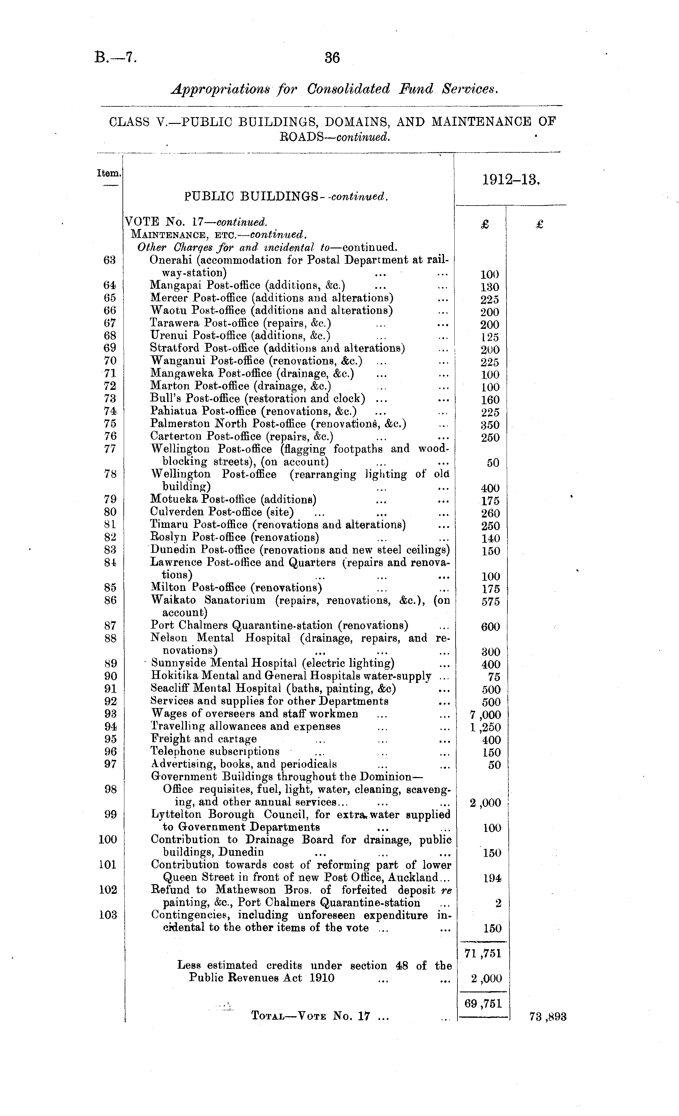 item. 191 1-18. PUBLIC BUILDINGS- -continued. 63 64 65 66 67 68 69 70 71 72 73 74 75 76 77 78 79 80 81 82 83 81 85 86 VOTE No. 17— continued. Maintenance, etc. — continued. Other Charges for and incidental to —continued. Onerahi (accommodation for Postal Department at rail-way-station) Mangapai Post-office (additions, &c.) Mercer Post-office (additions and alterations) Waotu Post-office (additions and alterations) Tarawera Post-office (repairs, &c.) Urenui Post-office (additions, &c.) Stratford Post-office (additions and alterations) Wanganui Post-office (renovations, &c.) Mangaweka Post-office (drainage, &c.) Marton Post-office (drainage, <fec.) Bull's Post-office (restoration and clock) ... Pahiatua Post-office (renovations, &c.) Palmerston North Post-office (renovations, &c.) Carterton Post-office (repairs, &c.) Wellington Post-office (flagging footpaths and woodblocking streets), (on account) Wellington Post-office (rearranging lighting of old building) Motueka Post-office (additions) Cuiverden Post-office (site) Timaru Post-office (renovations and alterations) Roslyn Post-office (renovations) Dunedin Post-office (renovations and new steel ceilings) Lawrence Post-office and Quarters (repairs and renovations) Milton Post-office (renovations) Waikato Sanatorium (repairs, renovations, &c), (on account) Port Chalmers Quarantine-station (renovations) Nelson Mental Hospital (drainage, repairs, and renovations) Sunnyside Mental Hospital (electric lighting) Hokitika Mental and General Hospitals water-supply .., Seacliff Mental Hospital (baths, painting, &c) Services and supplies for other Departments Wages of overseers and staff workmen Travelling allowances and expenses Freight and cartage Telephone subscriptions Advertising, books, and periodicals Government Buildings throughout the Dominion— Office requisites, fuel, light, water, cleaning, scavenging, and other annual services... Lyttelton Borough Council, for extra, water supplied to Government Departments Contribution to Drainage Board for drainage, public buildings, Dunedin Contribution towards cost of reforming part of lower Queen Street in front of new Post Office, Auckland... Refund to Mathewson Bros, of forfeited deposit re painting, &c, Port Chalmers Quarantine-station Contingencies, including unforeseen expenditure incidental to the other items of the vote ... £ 100 130 225 200 200 125 200 225 100 100 160 225 350 250 50 400 175 260 250 140 150 100 175 575 87 88 600 89 90 91 92 93 94 95 96 97 300 400 75 500 500 7,000 1,250 400 150 50 98 2,000 99 100 100 101 150 102 194 103 2 150 Less estimated credits under section 48 of the Public Revenues Act 1910 71,751 2,000 69 ,751 Total—Vote No. 17 ...
