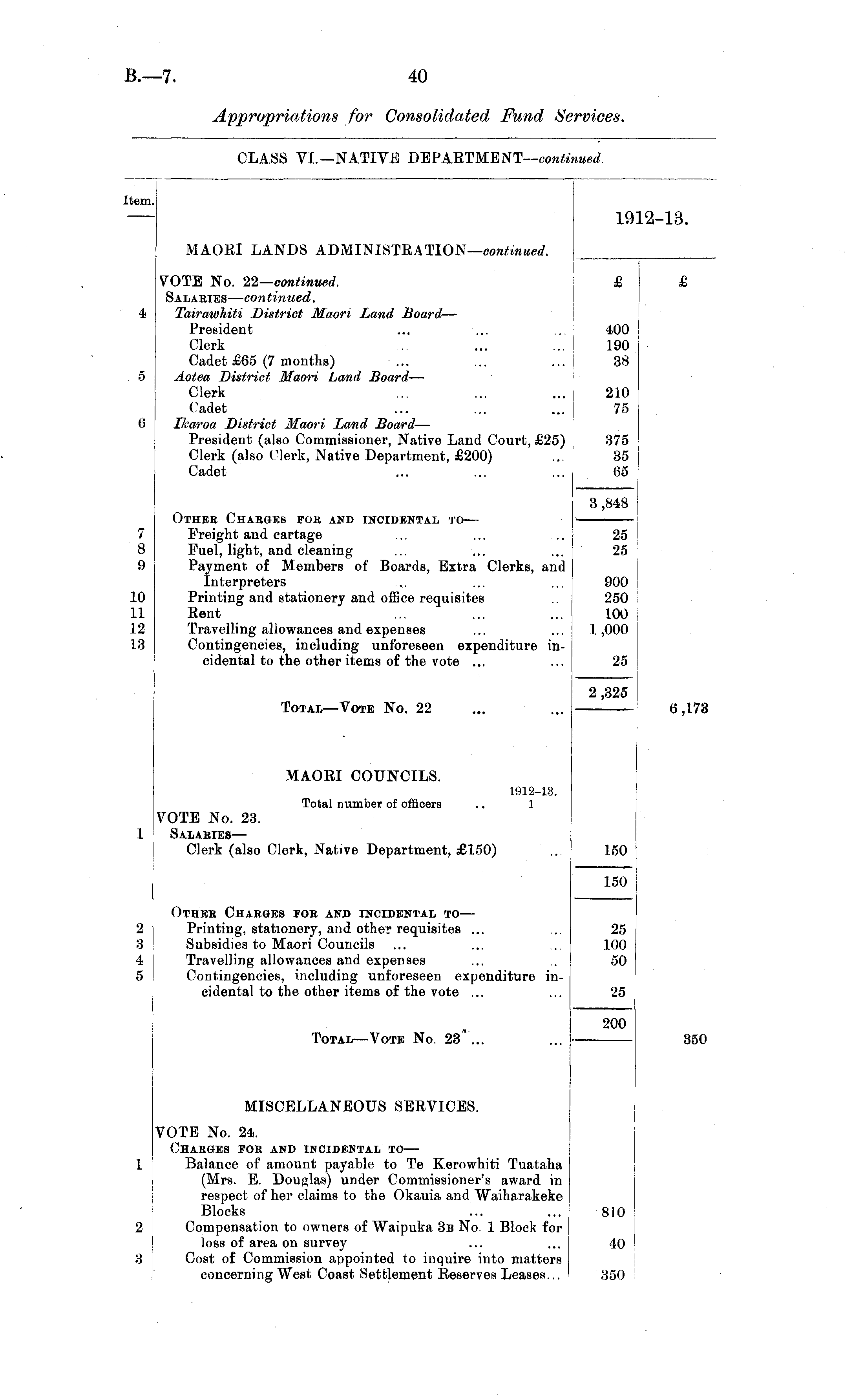 Item. 19 2-13. MAOEI LANDS ADMINISTRATION— continued. VOTE No. 22— continued, Salabies— continued. Tairawhiti District Maori Land Board — President Clerk Cadet £65 (7 months) Aotea District Maori Land Board — Clerk Cadet Ikaroa District Maori Land Board — President (also Commissioner, Native Land Court, £25) Clerk (also Clerk, Native Department, £200) Cadet £ 400 190 38 210 75 6 375 35 65 Other Chabges for and incidental to — Freight and cartage Fuel, light, and cleaning Payment of Members of Boards, Extra Clerks, and Interpreters Printing and stationery and office requisites Rent Travelling allowances and expenses Contingencies, including unforeseen expenditure incidental to the other items of the vote ... 3,848 7 8 9 25 25 10 11 12 L3 900 250 100 1,000 25 Total—Vote No. 22 2,325 MAORI COUNCILS. 1912-13. Total number of officers .. 1 6,173 VOTE No. 23. Salaries — Clerk (also Clerk, Native Department, £150) 150 Otheb Charges fob and incidental to — Printing, stationery, a)id other requisites ... Subsidies to Maori Councils Travelling allowances and expenses Contingencies, including unforeseen expenditure incidental to the other items of the vote ... 150 350 2 3 4 5 25 100 50 25 Total—Vote No. 23 ... 200 MISCELLANEOUS SERVICES. VOTE No. 24. Charges foe and incidental to — Balance of amount payable to Te Kerowhiti Tuataha (Mrs. E. Douglas) under Commissioner's award in respect of her claims to the Okauia and Waiharakeke Blocks Compensation to owners of Waipuka 3b No. 1 Block for loss of area on survey Cost of Commission appointed to inquire into matters concerning West Coast Settlement Eeserves Leases... 810 2 40 3 350