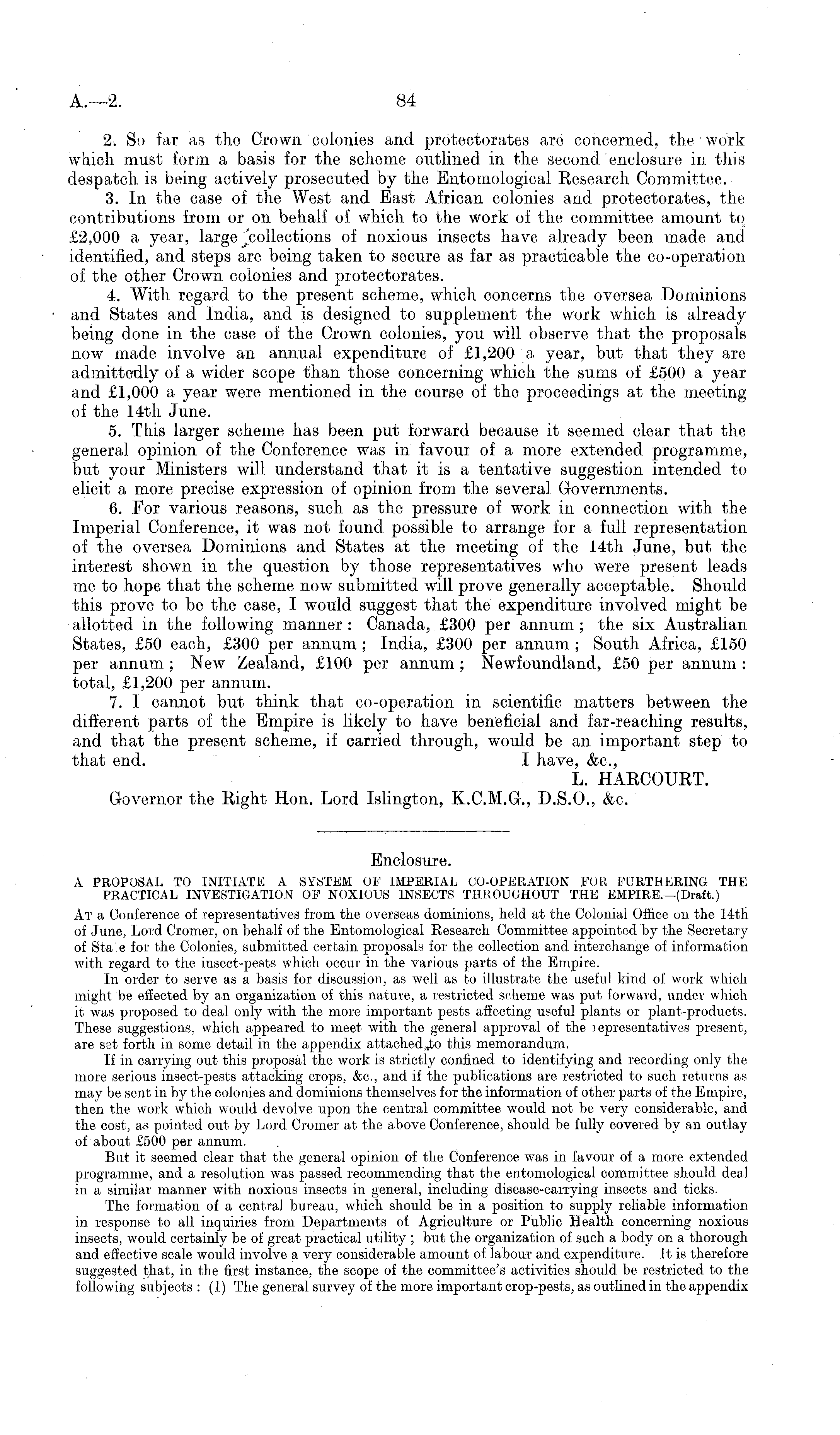2. So far as the Crown colonies and protectorates are concerned, the work which mast form a basis for the scheme outlined in the second enclosure in this despatch is being actively prosecuted by the Entomological Research Committee. 3. In the case of the West and East African colonies and protectorates, the contributions from or on behalf of which to the work of the committee amount to £2,000 a year, large of noxious insects have already been made and identified, and steps are being taken to secure as far as practicable the co-operation of the other Crown colonies and protectorates. 4. With regard to the present scheme, which concerns the oversea Dominions and States and India, and is designed to supplement the work which is already being done in the case of the Crown colonies, you will observe that the proposals now made involve an annual expenditure of £1,200 a year, but that they are admittedly of a wider scope than those concerning which the sums of £500 a year and £1,000 a year were mentioned in the course of the proceedings at the meeting of the 14th June. 5. This larger scheme has been put forward because it seemed clear that the general opinion of the Conference was in favour of a more extended programme, but your Ministers will understand that it is a tentative suggestion intended to elicit a more precise expression of opinion from the several Governments. 6. For various reasons, such as the pressure of work in connection with the Imperial Conference, it was not found possible to arrange for a full representation of the oversea Dominions and States at the meeting of the 14th June, but the interest shown in the question by those representatives who were present leads me to hope that the scheme now submitted will prove generally acceptable. Should this prove to be the case, I would suggest that the expenditure involved might be allotted in the following manner : Canada, £300 per annum ; the six Australian States, £50 each, £300 per annum ; India, £300 per annum ; South Africa, £150 per annum ; New Zealand, £100 per annum ; Newfoundland, £50 per annum : total, £1,200 per annum. 7. I cannot but think that co-operation in scientific matters between the different parts of the Empire is likely to have beneficial and far-reaching results, and that the present scheme, if carried through, would be an important step to that end. I have, &c, L. HARCOURT. Governor the Right Hon. Lord Islington, K.C.M.G., D.5.0., &c.
