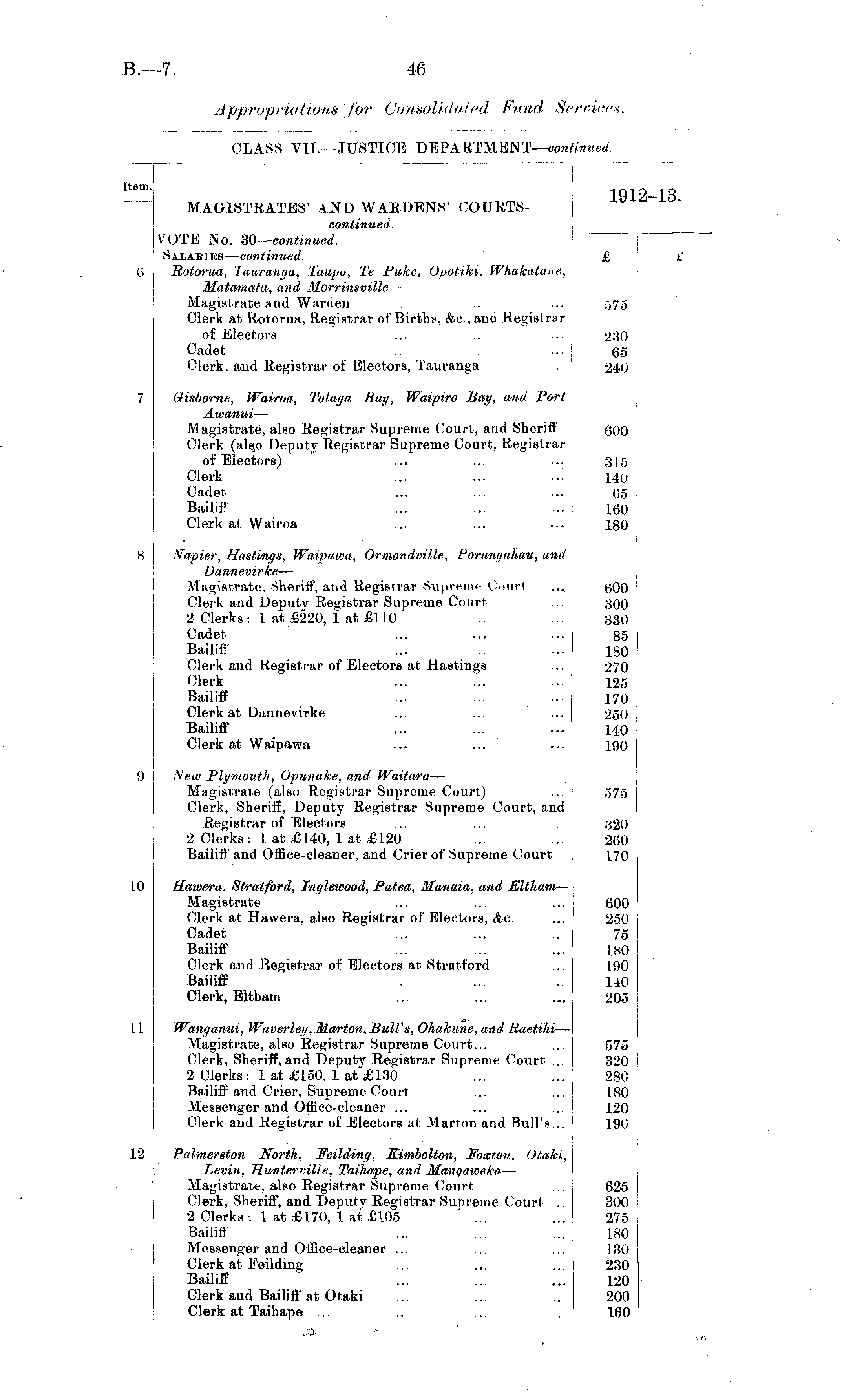 [tern. MAGISTRATES' AND WARDENS' COURTS— continued VOTE No. 30— continued. Sa.la.bibs — continued, Botorua, Tauranga, Taupo, Te Puke, Opotiki, Whakatane, JKatamata, and Morrinsville — Magistrate and Warden Clerk at Rotorua, Registrar of Births, &c, and Registrar of Electors Cadet Clerk, and Registrar of Electors, Tauranga 1912-13. £ £ (J 575 230 65 240 Qisborne, Wairoa, Tolaga Bay, Waipiro Bay, and Port Awanui — Magistrate, also Registrar Supreme Court, and Sheriff' Clerk (als.o Deputy Registrar Supreme Court, Registrar of Electors) Clerk Cadet Bailiff Clerk at Wairoa 600 315 140 65 160 180 Napier, Hastings, Waipauoa, Ormondville, Poraw/ahau, and Dannevirke — Magistrate, Sheriff, and Registrar Supreme Court Clerk and Deputy Registrar Supreme Court 2 Clerks: 1 at £220, 1 at £110 Cadet Bailiff Clerk and Registrar of Electors at Hastings Clerk Bailiff Clerk at Dannevirke Bailiff Clerk at Waipawa 600 300 330 85 180 270 125 170 250 140 190 9 New Plymouth, Opunake, and Waitara — Magistrate (also Registrar Supreme Court) Clerk, Sheriff, Deputy Registrar Supreme Court, and Registrar of Electors 2 Clerks: 1 at £140, 1 at £120 Bailiff and Office-cleaner, and Crier of Supreme Court 575 320 260 170 10 Hawera, Stratford, Inglewood, Patea, Manaia, and JEltham — Magistrate Clerk at Hawera, also Registrar of Electors, <fcc. Cadet Bailiff Clerk and Registrar of Electors at Stratford Bailiff Clerk, Eltham 600 250 75 180 190 140 205 I 11 Wanganui, Waverley, Marion, Bull's, Ohakwne, and Raetihi — Magistrate, also Registrar Supreme Court... Clerk, Sheriff, and Deputy Registrar Supreme Court ... 2 Clerks: 1 at £150, 1 at £130 Bailiff and Crier, Supreme Court Messenger and Office-cleaner ... Clerk and Registrar of Electors at Marton and Bull's... 575 320 280 180 120 190 12 Palmerston North, Feilding, Kimbolton, Foxton, Otaki, Levin, Hunterville, Taihape, and Manqaweka — Magistrate, also Registrar Supreme Court Clerk, Sheriff, and Deputy Registrar Supreme Court .. 2 Clerks : 1 at £170, 1 at £105 Bailiff Messenger and Office-cleaner ... Clerk at Feilding Bailiff Clerk and Bailiff at Otaki Clerk at Taihape ... 625 300 275 180 130 230 120 200 160 fc. v>