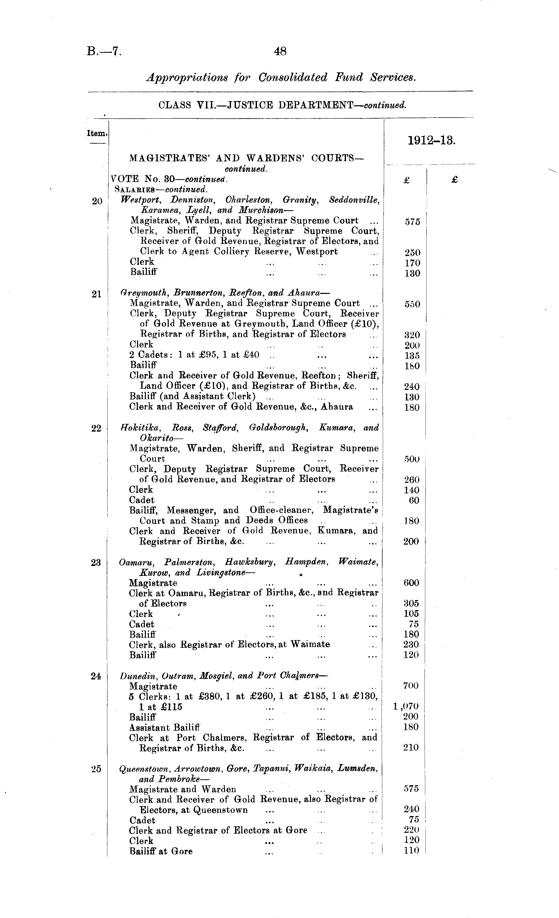 Item. 1912-13. 20 MAGISTRATES' AND WARDENS' COURTS— continued. VOTE No. 30— continued. Salaries — continued. Westport, Denniston, Charleston, Granity, Seddonville, Raramea, Lyell, and Murehison — Magistrate, Warden, and Registrar Supreme Court Clerk, Sheriff, Deputy Registrar Supreme Court, Receiver of Gold Revenue, Registrar of Electors, and Clerk to Agent Colliery Reserve, Westport Clerk Bailiff £ £ 575 250 170 130 21 Greymouth, Brunnerton, Reefton, and Ahaura — Magistrate, Warden, and Registrar Supreme Court ... Clerk, Deputy Registrar Supreme Court, Receiver of Gold Revenue at Greymouth, Land Officer (£10), Registrar of Births, and Registrar of Electors Clerk 2 Cadets : 1 at £95, 1 at £40 .. Bailiff Clerk and Receiver of Gold Revenue, Reefton ; Sheriff, Land Officer (£10), and Registrar of Births, &c. Bailiff (and Assistant Clerk) ... Clerk and Receiver of Gold Revenue, <fec, Ahaura 550 320 200 135 180 240 130 180 22 Ffokitika, Ross, Stafford, Goldsborough, Kumara, and Okarito — Magistrate, Warden, Sheriff, and Registrar Supreme Court Clerk, Deputy Registrar Supreme Court, Receiver of Gold Revenue, and Registrar of Electors Clerk • ... Cadet Bailiff, Messenger, and Office-cleaner, Magistrate's Court and Stamp and Deeds Offices .. Clerk and Receiver of Gold Revenue, Kumara, and Registrar of Births, &c. 500 260 140 60 180 200 23 Oamaru, Palmerston, Hawksbury, Hampden, Waimate, Kurow, and Livingstone — „ Magistrate Clerk at Oamaru, Registrar of Births, <fec, and Registrar of Electors Clerk Cadet Bailiff Clerk, also Registrar of Electors, at Waimate Bailiff 600 305 105 75 180 230 120 24 Dunedin, Outram, Mosgiel, and Port Chalmers — Magistrate 5 Clerks: 1 at £380, 1 at £260, 1 at £185, 1 at £130, 1 at £115 Bailiff Assistant Bailiff Clerk at Port Chalmers, Registrar of Electors, and Registrar of Births, &c. 700 1,070 200 180 210 25 Queenstown, Arrowtown, Gore, Tapanui, Waikaia, Lumsden, and Pembroke — Magistrate and Warden Clerk and Receiver of Gold Revenue, also Registrar of Electors, at Queenstown Cadet Clerk and Registrar of Electors at Gore ... Clerk u 'Kir „v. n 575 240 75 220 120 110 Bailiff at Gore