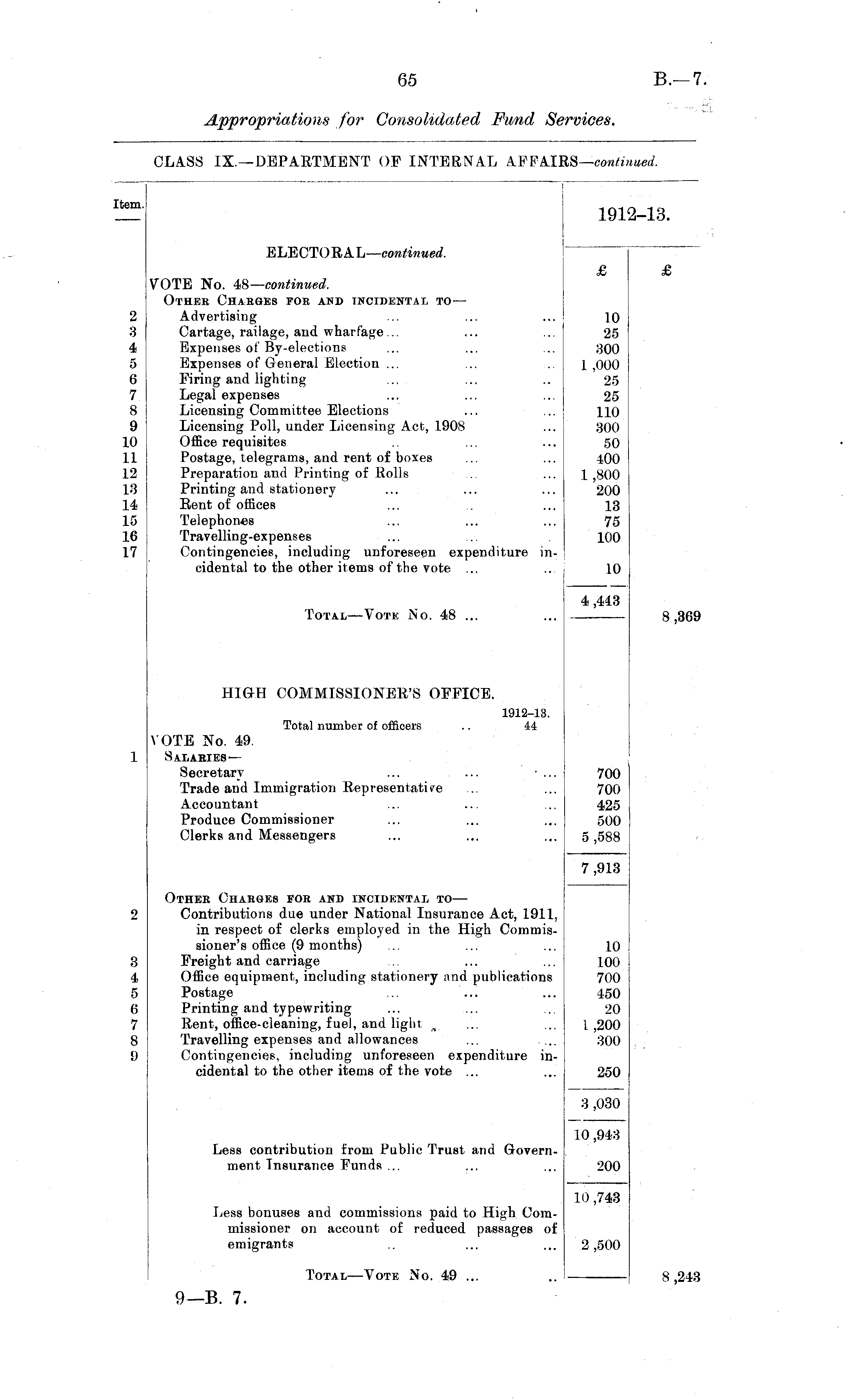 Item. 191 1-13. ELECTORAL— continued. VOTE No. 4&—continued. Other Charges tor and incidental to— Advertising Cartage, railage, and wharfage ... Expenses of By-elections Expenses of General Election ... Firing and lighting Legal expenses Licensing Committee Elections Licensing Poll, under Licensing Act, 1908 Office requisites Postage, telegrams, and rent of boxes Preparation and Printing of Rolls .. ... Printing and stationery Rent of offices Telephones Travelling-expenses Contingencies, including unforeseen expenditure incidental to the other items of the vote ... £ 2 3 4 5 6 7 8 9 10 11 L2 18 14 15 16 17 10 25 300 1,000 25 25 110 300 50 400 1 ,800 200 13 75 100 10 Total —Vote No. 48 ... 4,443 8,369 HIGH COMMISSIONER'S OFFICE. 1912-13. Total number of officers .. 44 VOTE No. 49. Salaeies— Secretary ... ... ■ ... Trade and Immigration Representati r e Accountant Produce Commissioner Clerks and Messengers 700 700 425 500 5,588 Othee Charges for and incidental to — Contributions due under National Insurance Act, 1911, in respect of clerks employed in the High Commissioner's office (9 months) Freight and carriage Office equipment, including stationery and publications Postage Printing and typewriting Rent, office-cleaning, fuel, and light Travelling expenses and allowances ... ... Contingencies, including unforeseen expenditure incidental to the other items of the vote ... 7,913 3 4 5 6 7 8 9 10 100 700 450 20 I ,200 300 250 3 ,030 Less contribution from Public Trust and Government Insurance Funds? ... 10 ,943 200 8 ,243 Less bonuses and commissions paid to High Commissioner on account of reduced passages of emigrants 10 ,743 2,500 Total —Vote No. 49 ...