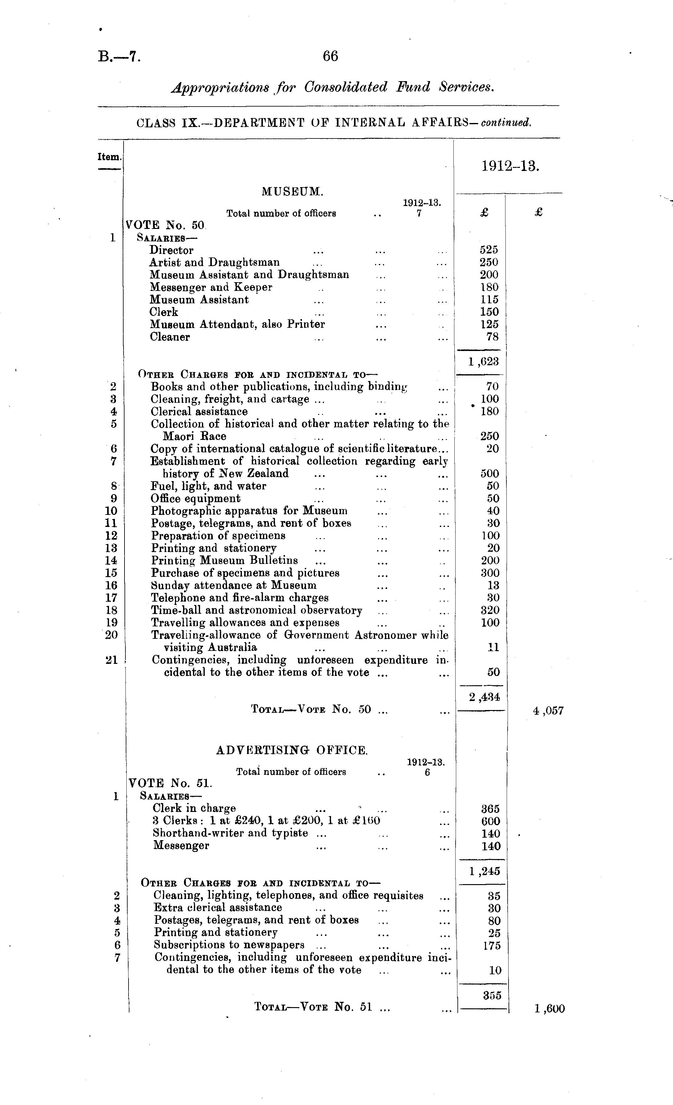 Item. 191 !-13. MUSEUM. 1912-13. Total number of officers .. 7 £ VOTE No. 50 Salaries — Director Artist and Draughtsman Museum Assistant and Draughtsman Messenger and Keeper Museum Assistant Clerk Museum Attendant, also Printer Cleaner 525 250 200 180 115 150 125 78 2 3 4 5 6 7 S 9 10 11 12 13 14 15 16 17 18 19 20 Otheb Charges fob and incidental to — Books and other publications, including binding Cleaning, freight, and cartage ... Clerical assistance Collection of historical and other matter relating to the Maori Bace . ... Copy of international catalogue of scientific literature... Establishment of historical collection regarding early history of New Zealand Fuel, light, and water Office equipment Photographic apparatus for Museum Postage, telegrams, and rent of boxes Preparation of specimens Printing and stationery Printing Museum Bulletins Purchase of specimens and pictures Sunday attendance at Museum Telephone and fire-alarm charges Time-ball and astronomical observatory Travelling allowances and expenses Travelling-allowance of Government Astronomer while visiting Australia Contingencies, including unforeseen expenditure incidental to the other items of the vote ... 1,623 70 100 ' 180 250 20 500 50 50 40 30 100 20 200 300 13 30 320 100 11 21 50 Total—Vote No. 50 ... 2,434 4,057 ADVERTISING OFFICE. 1912-13. Total number of officers .. 6 VOTE No. 51. Salaries — Clerk in charge 3 Clerks : 1 at £240, 1 at £200, 1 at £1(50 Shorthand-writer and typiste ... Messenger 365 600 140 140 Other Charges fob and incidental to — Cleaning, lighting, telephones, and office requisites Extra clerical assistance Postages, telegrams, and rent of boxes Printing and stationery Subscriptions to newspapers ... Contingencies, including unforeseen expenditure incidental to the other items of the vote 1 ,245 2 8 4 5 6 7 35 30 80 25 175 10 Total —Vote No. 51 ... 355 1,601