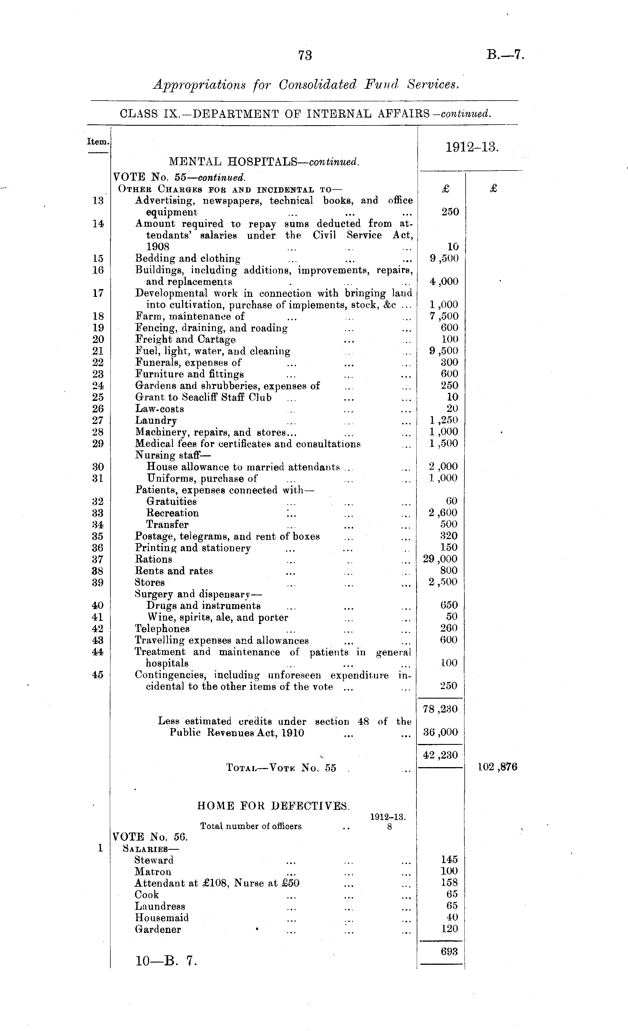 Item. 1912-13. MENTAL HOSPITALS— continued. 15 16 17 18 19 20 21 22 23 24 25 26 27 28 29 13 14 VOTE No. 55— continued. Other Chakges for and incidental to — Advertising, newspapers, technical books, and office equipment Amount required to repay sums deducted from attendants' salaries under the Civil Service Act, 1908 Bedding and clothing Buildings, including additions, improvements, repairs, and replacements Developmental work in connection with bringing land into cultivation, purchase of implements, stock, &c ... Farm, maintenance of Fencing, draining, and roading Freight and Cartage Fuel, light, water, and cleaning ... ... Funerals, expenses of Furniture and fittings Gardens and shrubberies, expenses of Grant to Seacliff Staff Club ... Law-costs Laundry Machinery, repairs, and stores... Medical fees for certificates and consultations Nursing staff— House allowance to married attendants ... Uniforms, purchase of Patients, expenses connected with — Gratuities ... ... Recreation Transfer Postage, telegrams, and rent of boxes Printing and stationery Rations Eents and rates Stores Surgery and dispensary — Drugs and instruments Wine, spirits, ale, and porter Telephones Travelling expenses and allowances Treatment and maintenance of patients in general hospitals Contingencies, including unforeseen expenditure incidental to the other items of the vote ... £ 250 10 9,500 4,000 1 ,000 7,500 600 100 9 ,500 300 600 250 10 20 1 ,250 1,000 1 ,500 30 31 2,000 1 ,000 32 33 34 35 36 37 38 39 60 2 ,600 500 320 150 29 ,000 800 2 ,500 40 41 42 43 44 650 50 260 600 100 45 250 Less estimated credits under section 48 of the Public Revenues Act, 1910 78 ,230 36 ,000 42 ,230 Total—Votk No. 55 . 102 ,876 HOME FOR DEFECTIVES. 1912-13. Total number of offioers .. 8 VOTE No. 56. Salaries — Steward Matron Attendant at £108, Nurse at £50 Cook Laundress Housemaid Gardener 145 100 158 65 65 40 120 693