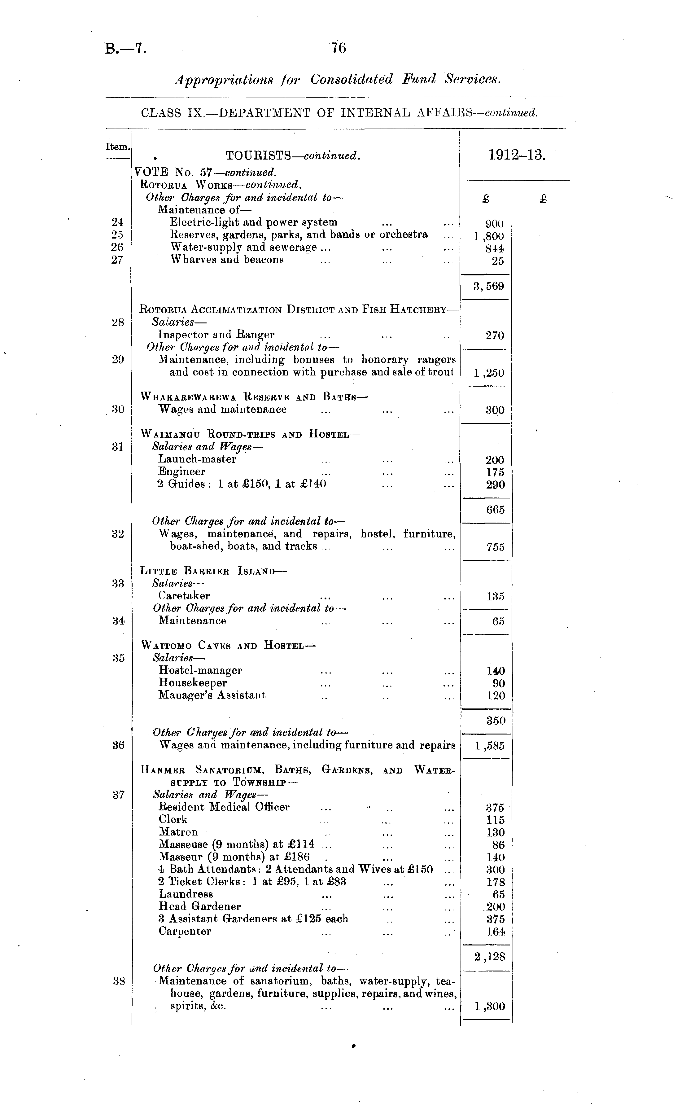 item. TOURISTS— continued. 1912-13. 24 25 20 27 VOTE No. 57— continued. Rotorua Works — continued. Other Charges for and incidental to — Maintenance of — Electric-light and power system Reserves, gardens, parks, and bands or orchestra Water-supply and sewerage ... Wharves and beacons £ 900 1 ,800 814 25 Rotorua Acclimatization District and Fish Hatchery— Salaries — Inspector and Ranger Other Charges for arid incidental to — Maintenance, including bonuses to honorary rangers and cost in connection with purchase and sale of trout 3,569 28 270 29 1 ,250 Whakahewarewa Reserve and Baths — Wages and maintenance 300 30 31 Waimangu Round-trips and Hostel— Salaries and Wages — Launch-master Engineer 2 Guides : 1 at £150, 1 at £140 200 175 290 I 32 Other Charges for and incidental to — Wages, maintenance, and repairs, hostel, furniture, boat-shed, boats, and tracks ... 665 755 33 Little Barrier Island — Salaries — Caretaker Other Charges for and incidental to — Maintenance 135 34 65 35 Waitomo Caves and Hostel— Salaries — Hostel-manager Housekeeper Manager's Assistant 140 90 120 Other Charges for and incidental to — Wages and maintenance, including furniture and repairs 350 36 1,585 37 Hanmer Sanatorium, Baths, Gardens, and Watersupply to Township — Salaries and Wages — Resident Medical Officer Clerk Matron Masseuse (9 months) at £114 ... Masseur (9 months) at £186 ... 4 Bath Attendants : 2 Attendants and Wives at £150 2 Ticket Clerks: 1 at £95, 1 at £83 Laundress Head Gardener 3 Assistant Gardeners at, £125 each Carpenter 375 115 130 86 140 300 178 65 200 375 164 38 Other Charges for and incidental to — Maintenance of sanatorium, baths, water-supply, teahouse, gardens, furniture, supplies, repairs, and wines, spirits, &c. 2,128 1,300