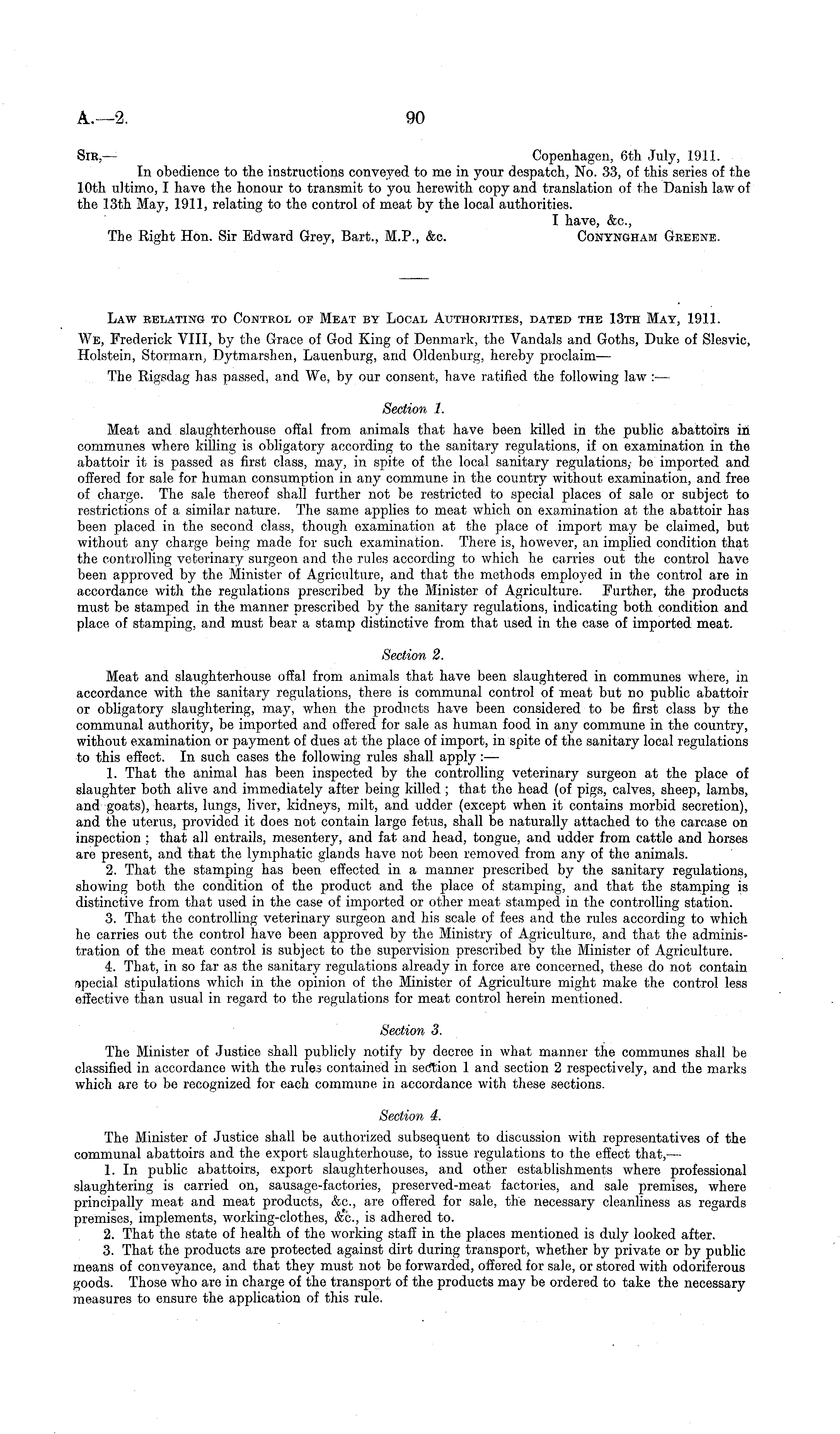 Sir, — Copenhagen, 6th July, 1911. In obedience to the instructions conveyed to me in your despatch, No. 33, of this series of the 10th ultimo, I have the honour to transmit to you herewith copy and translation of the Danish law of the 13th May, 1911, relating to the control of meat by the local authorities. I have, &c, The Right Hon. Sir Edward Grey, Bart., M.P., &c. Cqnyngham Greene.