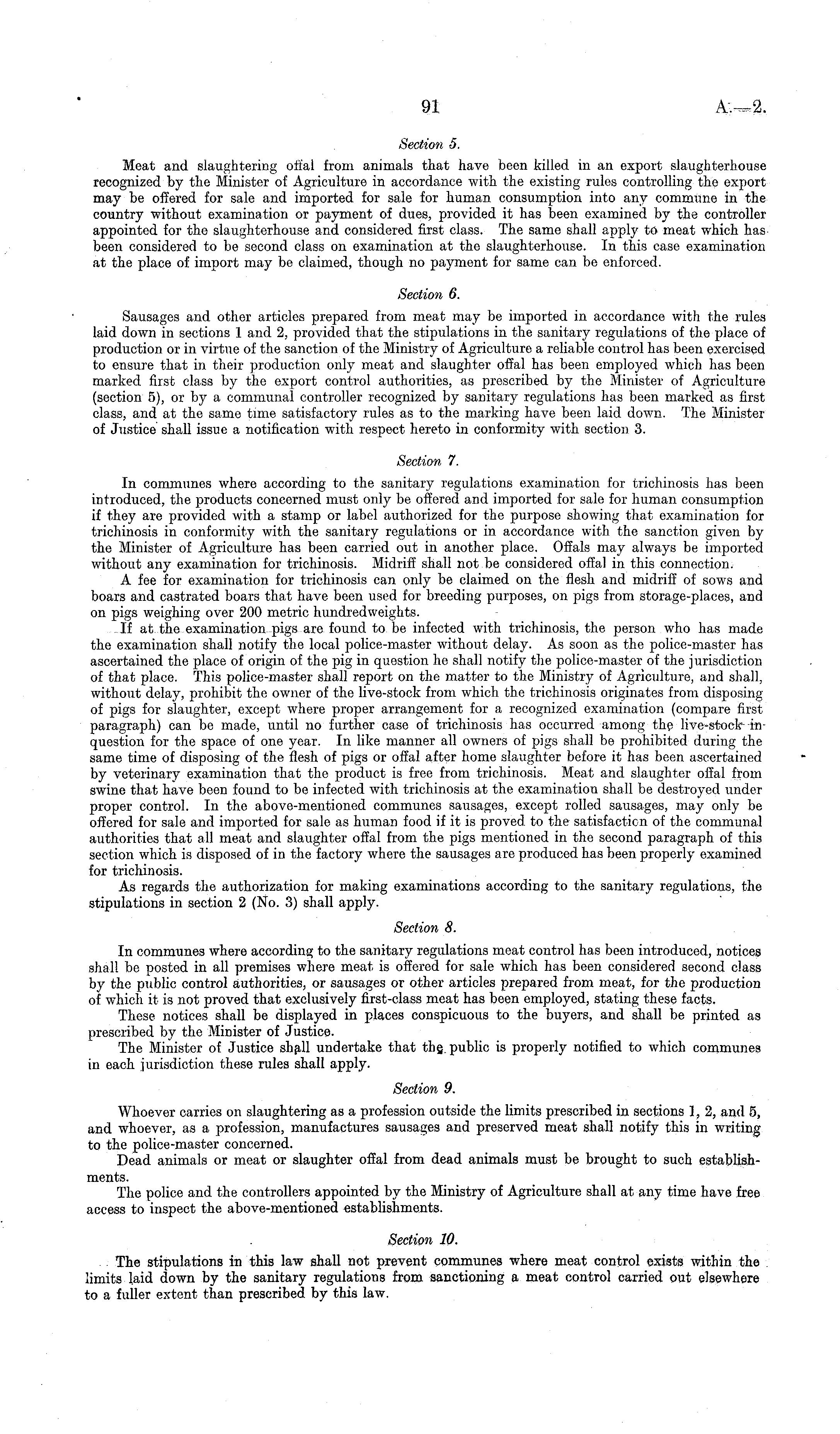 Section 5, Meat and slaughtering offal from animals that have been killed in an export slaughterhouse recognized by the Minister of Agriculture in accordance with the existing rules controlling the export may be offered for sale and imported for sale for human consumption into any commune in the country without examination or payment of dues, provided it has been examined by the controller appointed for the slaughterhouse and considered first class. The same shall apply to meat which has been considered to be second class on examination at the slaughterhouse. In this case examination at the place of import may be claimed, though no payment for same can be enforced. Section 6. Sausages and other articles prepared from meat may be imported in accordance with the rules laid down in sections 1 and 2, provided that the stipulations in the sanitary regulations of the place of production or in virtue of the sanction of the Ministry of Agriculture a reliable control has been exercised to ensure that in their production only meat and slaughter offal has been employed which has been marked first class by the export control authorities, as prescribed by the Minister of Agriculture (section 5), or by a communal controller recognized by sanitary regulations has been marked as first class, and at the same time satisfactory rules as to the marking have been laid down. The Minister of Justice shall issue a notification with respect hereto in conformity with section 3. Section 7. In communes where according to the sanitary regulations examination for trichinosis has been introduced, the products concerned must only be offered and imported for sale for human consumption if they are provided with a stamp or label authorized for the purpose showing that examination for trichinosis in conformity with the sanitary regulations or in accordance with the sanction given by the Minister of Agriculture has been carried out in another place. Offals may always be imported without any examination for trichinosis. Midriff shall not be considered offal in this connection. A fee for examination for trichinosis can only be claimed on the flesh and midriff of sows and boars and castrated boars that have been used for breeding purposes, on pigs from storage-places, and on pigs weighing over 200 metric hundredweights. If at. the examination pigs are found to be infected with trichinosis, the person who has made the examination shall notify the local police-master without delay. As soon as the police-master has ascertained the place of origin of the pig in question he shall notify the police-master of the jurisdiction of that place. This police-master shall report on the matter to the Ministry of Agriculture, and shall, without delay, prohibit the owner of the live-stock from which the trichinosis originates from disposing of pigs for slaughter, except where proper arrangement for a recognized examination (compare first paragraph) can be made, until no further case of trichinosis has occurred among the live-stock-in-question for the space of one year. In like manner all owners of pigs shall be prohibited during the same time of disposing of the flesh of pigs or offal after home slaughter before it has been ascertained by veterinary examination that the product is free from trichinosis. Meat and slaughter offal from swine that have been found to be infected with trichinosis at the examination shall be destroyed under proper control. In the above-mentioned communes sausages, except rolled sausages, may only be offered for sale and imported for sale as human food if it is proved, to the satisfaction of the communal authorities that all meat and slaughter offal from the pigs mentioned in the second paragraph of this section which is disposed of in the factory where the sausages are produced has been properly examined for trichinosis. As regards the authorization for making examinations according to the sanitary regulations, the stipulations in section 2 (No. 3) shall apply. Section 8. In communes where according to the sanitary regulations meat control has been introduced, notices shall be posted in all premises where meat is offered for sale which has been considered second class by the public control authorities, or sausages or other articles prepared from meat, for the production of which it is not proved that exclusively first-class meat has been employed, stating these facts. These notices shall be displayed in places conspicuous to the buyers, and shall be printed as prescribed by the Minister of Justice. The Minister of Justice shall undertake that the. public is properly notified to which communes in each jurisdiction these rules shall apply. Section 9. Whoever carries on slaughtering as a profession outside the limits prescribed in sections 1, 2, and 5, and whoever, as a profession, manufactures sausages and preserved meat shall notify this in writing to the police-master concerned. Dead animals or meat or slaughter offal from dead animals must be brought to such establishments. The police and the controllers appointed by the Ministry of Agriculture shall at any time have free access to inspect the above-mentioned establishments. Section 10. The stipulations in this law shall not prevent communes where meat control exists within the limits laid down by the sanitary regulations from sanctioning a meat control carried out elsewhere to a fuller extent than prescribed by this law.