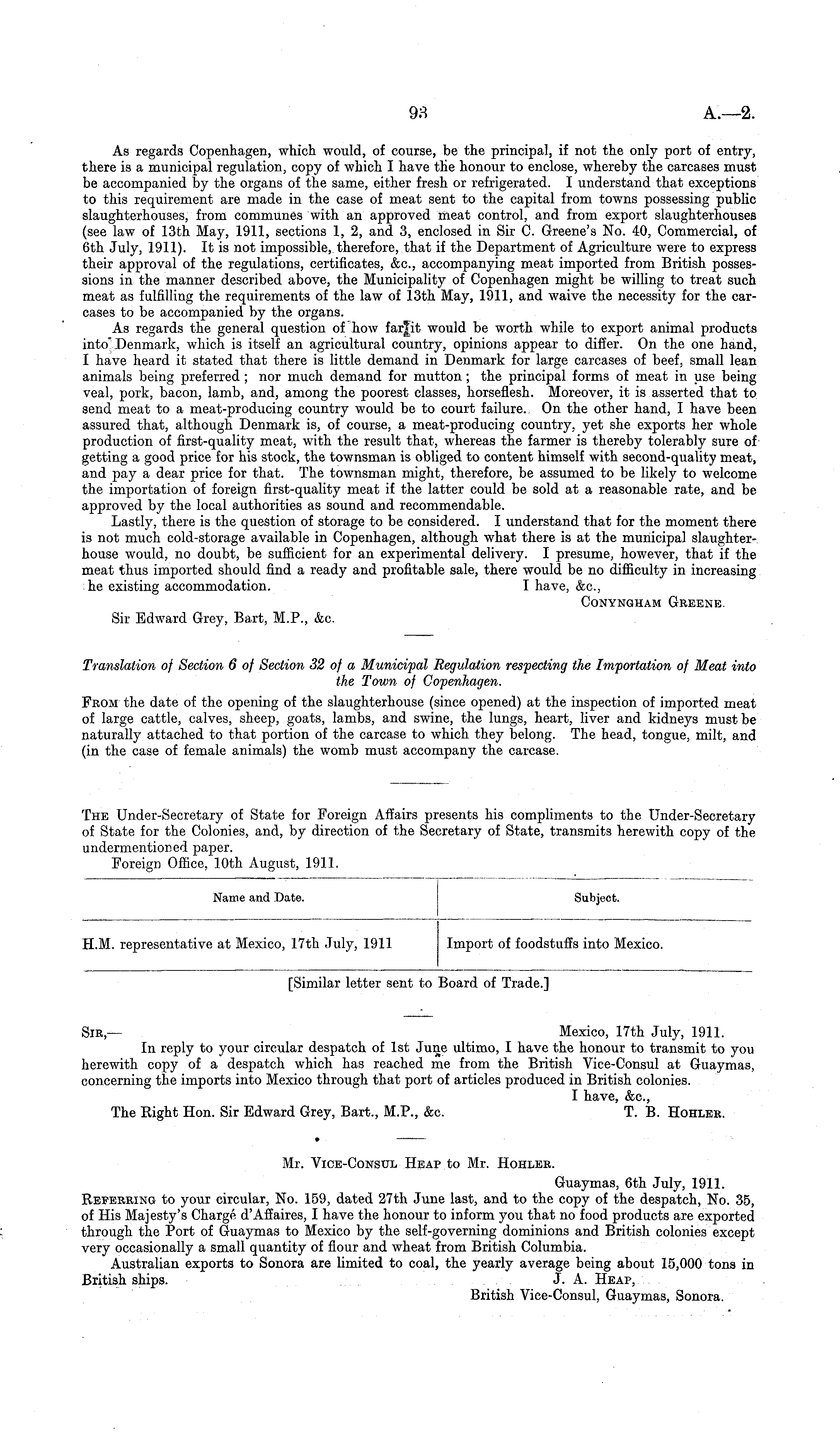 • Mr. Vice-Consul Heap to Mr. Hohler. Guaymas, 6th July, 1911. Referring to your circular, No. 159, dated 27th June last, and to the copy of the despatch, No. 35, of His Majesty's Charge d'Affaires, I have the honour to inform you that no food products are exported through the Port of Guaymas to Mexico by the self-governing dominions and British colonies except very occasionally a small quantity of flour and wheat from British Columbia. Australian exports to Sonora are limited to coal, the yearly average being about 15,000 tons in British ships. J. A. Heap, British Vice-Consul, Guaymas, Sonora.