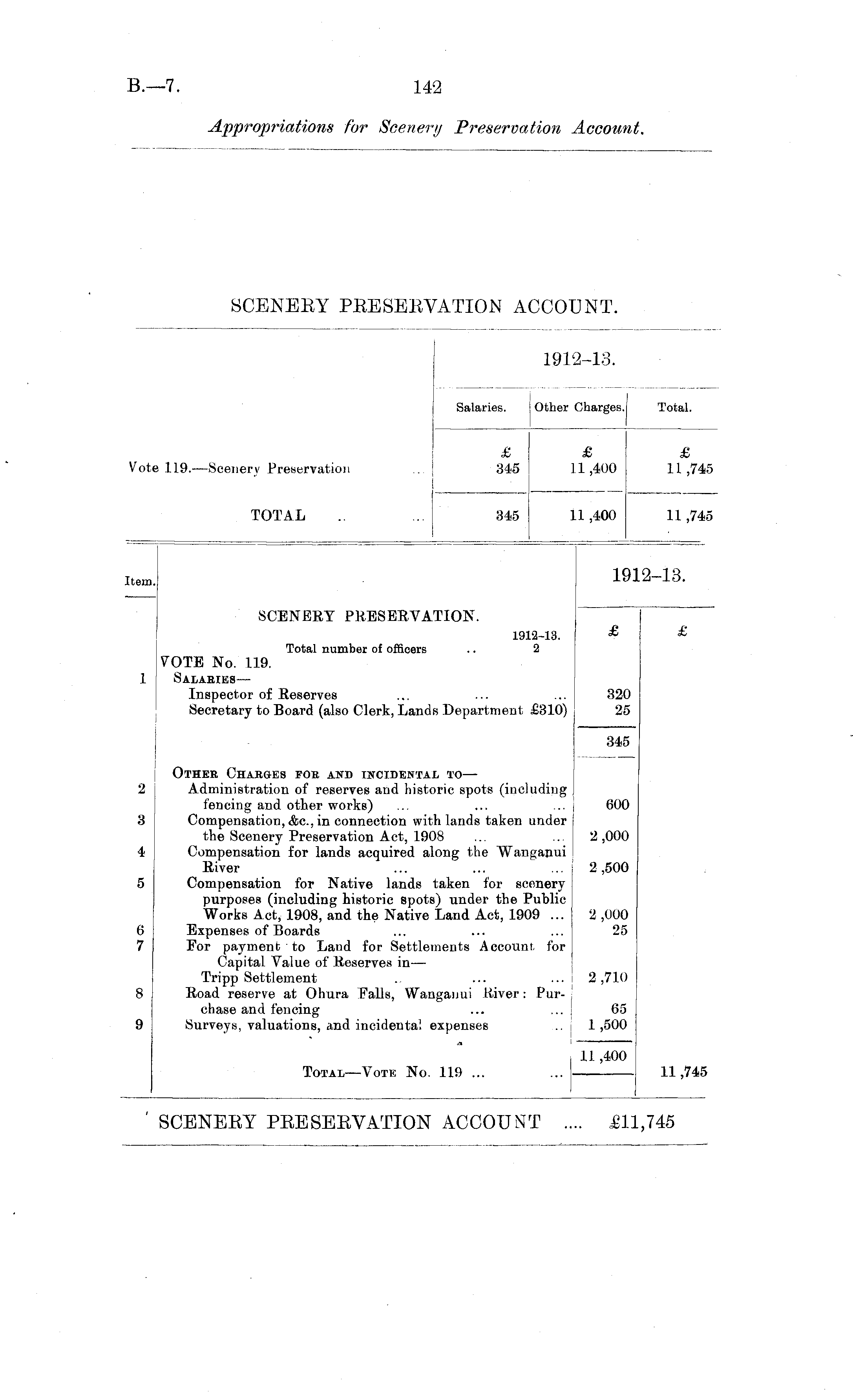 1912-13. Salaries. Other Charges. Total. £ 345 £ 1,400 £ 11,745 Vote 119.—Scenery Preservation TOTAL 345 1,400 11,745 12-13. ;tem. SCENERY PRESERVATION. 1912-13. Total number of officers .. 2 ! £ £ VOTE No. 119. Salaries— Inspector of Reserves Secretary to Board (also Clerk, Lands Department £310) 320 25 345 2 3 4 5 Other Charges for and incidental to — Administration of reserves and historic spots (including fencing and other works) Compensation, <fcc, in connection with lands taken under the Scenery Preservation Act, 1908 Compensation for lands acquired along the Wanganui River Compensation for Native lands taken for scenery purposes (including historic spots) under the Public Works Act, 1908, and the Native Land Act, 1909 ... Expenses of Boards For payment to Laud for Settlements Account, for Capital Value of Reserves in— Tripp Settlement Road reserve at Ohura Falls, Wanganui River: Purchase and fencing Surveys, valuations, and incidental expenses 600 2 ,000 2,500 2,000 25 6 7 2 ,710 8 65 1,500 9 Total—Vote No. 119 ... ! 11 ,400 11,745 ' SCENEKY PEESEEVATION ACCOUNT Ml ,745