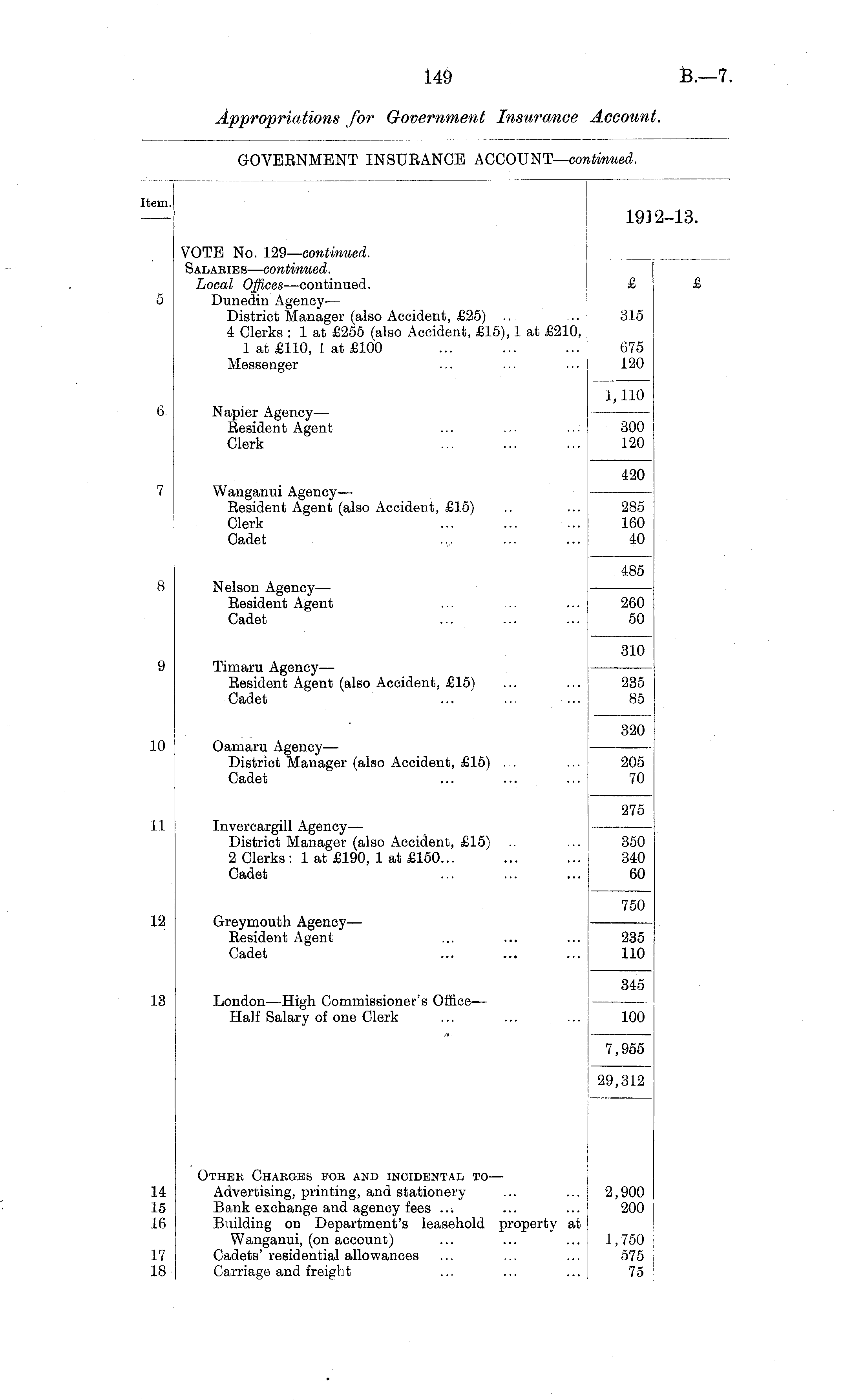 !tem. VOTE No. 129— continued. S al arie s— continued. Local Offices —continued. Dunedin Agency— District Manager (also Accident, £25) .. 4 Clerks : 1 at £255 (also Accident, £15), 1 at £210, 1 at £110, 1 at £100 Messenger 1912-13. £ £ 5 315 675 120 Napier Agency — Resident Agent Clerk 1,110 6 300 120 Wanganui Agency — Resident Agent (also Accident, £15) Clerk Cadet .... 420 285 160 40 Nelson Agency — Resident Agent Cadet 485 260 50 Timaru Agency— Resident Agent (also Accident, £15) Cadet 310 235 85 320 10 Oamaru Agency — District Manager (also Accident, £15) ... Cadet 205 70 Invercargill Agency— District Manager (also Accident, £15) .. 2 Clerks : 1 at £190, 1 at £150... Cadet 275 11 350 340 60 12 Greymouth Agency — Resident Agent Cadet 750 235 110 13 London—High Commissioner's OfficeHalf Salary of one Clerk 345 100 7,955 29,312 14 15 16 Other Charges for and incidental to — Advertising, printing, and stationery Bank exchange and agency fees ... Building on Department's leasehold property at Wanganui, (on account) Cadets' residential allowances Carriage and freight 2,900 200 1,750 575 75 17 18