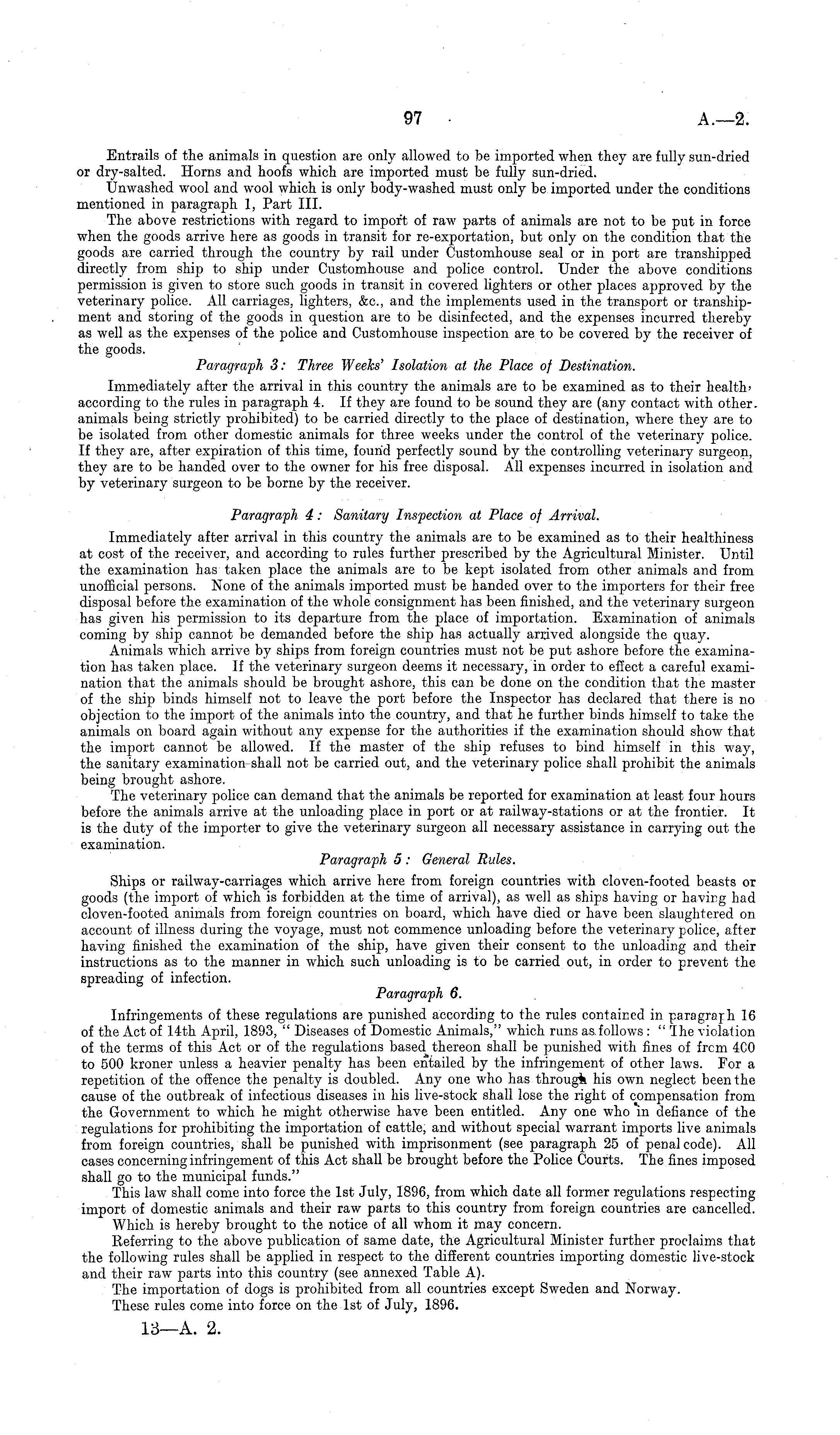 Entrails of the animals in question are only allowed to be imported when they are fully sun-dried or dry-salted. Horns and hoofs which are imported must be fully sun-dried. Unwashed wool and wool which is only body-washed must only be imported under the conditions mentioned in paragraph 1, Part 111. The above restrictions with regard to import of raw parts of animals are not to be put in force when the goods arrive here as goods in transit for re-exportation, but only on the condition that the goods are carried through the country by rail under Customhouse seal or in port are transhipped directly from ship to ship under Customhouse and police control. Under the above conditions permission is given to store such goods in transit in covered lighters or other places approved by the veterinary police. All carriages, lighters, &c, and the implements used in the transport or transhipment and storing of the goods in question are to be disinfected, and the expenses incurred thereby as well as the expenses of the police and Customhouse inspection are to be covered by the receiver of the goods. Paragraph 3: Three Weeks' Isolation at the Place of Destination. Immediately after the arrival in this country the animals are to be examined as to their health' according to the rules in paragraph 4. If they are found to be sound they are (any contact with other, animals being strictly prohibited) to be carried directly to the place of destination, where they are to be isolated from other domestic animals for three weeks under the control of the veterinary police. If they are, after expiration of this time, found perfectly sound by the controlling veterinary surgeon, they are to be handed over to the owner for his free disposal. All expenses incurred in isolation and by veterinary surgeon to be borne by the receiver. Paragraph 4: Sanitary Inspection at Place of Arrival. Immediately after arrival in this country the animals are to be examined as to their healthiness at cost of the receiver, and according to rules further prescribed by the Agricultural Minister. Until the examination has taken place the animals are to be kept isolated from other animals and from unofficial persons. None of the animals imported must be handed over to the importers for their free disposal before the examination of the whole consignment has been finished, and the veterinary surgeon has given his permission to its departure from the place of importation. Examination of animals coming by ship cannot be demanded before the ship has actually arrived alongside the quay. Animals which arrive by ships from foreign countries must not be put ashore before the examination has taken place. If the veterinary surgeon deems it necessary, in order to effect a careful examination that the animals should be brought ashore, this can be done on the condition that the master of the ship binds himself not to leave the port before the Inspector has declared that there is no objection to the import of the animals into the country, and that he further binds himself to take the animals on board again without any expense for the authorities if the examination should show that the import cannot be allowed. If the master of the ship refuses to bind himself in this way, the sanitary examination shall not be carried out, and the veterinary police shall prohibit the animals being brought ashore. The veterinary police can demand that the animals be reported for examination at least four hours before the animals arrive at the unloading place in port or at railway-stations or at the frontier. It is the duty of the importer to give the veterinary surgeon all necessary assistance in carrying out the examination. Paragraph 5 : General Rules. Ships or railway-carriages which arrive here from foreign countries with cloven-footed beasts or goods (the import of which is forbidden at the time of arrival), as well as ships having or having had cloven-footed animals from foreign countries on board, which have died or have been slaughtered on account of illness during the voyage, must not commence unloading before the veterinary police, after having finished the examination of the ship, have given their consent to the unloading and their instructions as to the manner in which such unloading is to be carried out, in order to prevent the spreading of infection. Paragraph 6. Infringements of these regulations are punished according to the rules contained in paragraph 16 of the Act of 14th April, 1893, " Diseases of Domestic Animals," which runs as.follows : " The violation of the terms of this Act or of the regulations based thereon shall be punished with fines of frcm 4CO to 500 kroner unless a heavier penalty has been entailed by the infringement of other laws. For a repetition of the offence the penalty is doubled. Any one who has through his own neglect been the cause of the outbreak of infectious diseases in his live-stock shall lose the right of compensation from the Government to which he might otherwise have been entitled. Any one who in defiance of the regulations for prohibiting the importation of cattle, and without special warrant imports live animals from foreign countries, shall be punished with imprisonment (see paragraph 25 of penal code). All cases concerning infringement of this Act shall be brought before the Police Courts. The fines imposed shall go to the municipal funds." This law shall come into force the Ist July, 1896, from which date all former regulations respecting import of domestic animals and their raw parts to this country from foreign countries are cancelled. Which is hereby brought to the notice of all whom it may concern. Referring to the above publication of same date, the Agricultural Minister further proclaims that the following rules shall be applied in respect to the different countries importing domestic live-stock and their raw parts into this country (see annexed Table A). The importation of dogs is prohibited from all countries exc