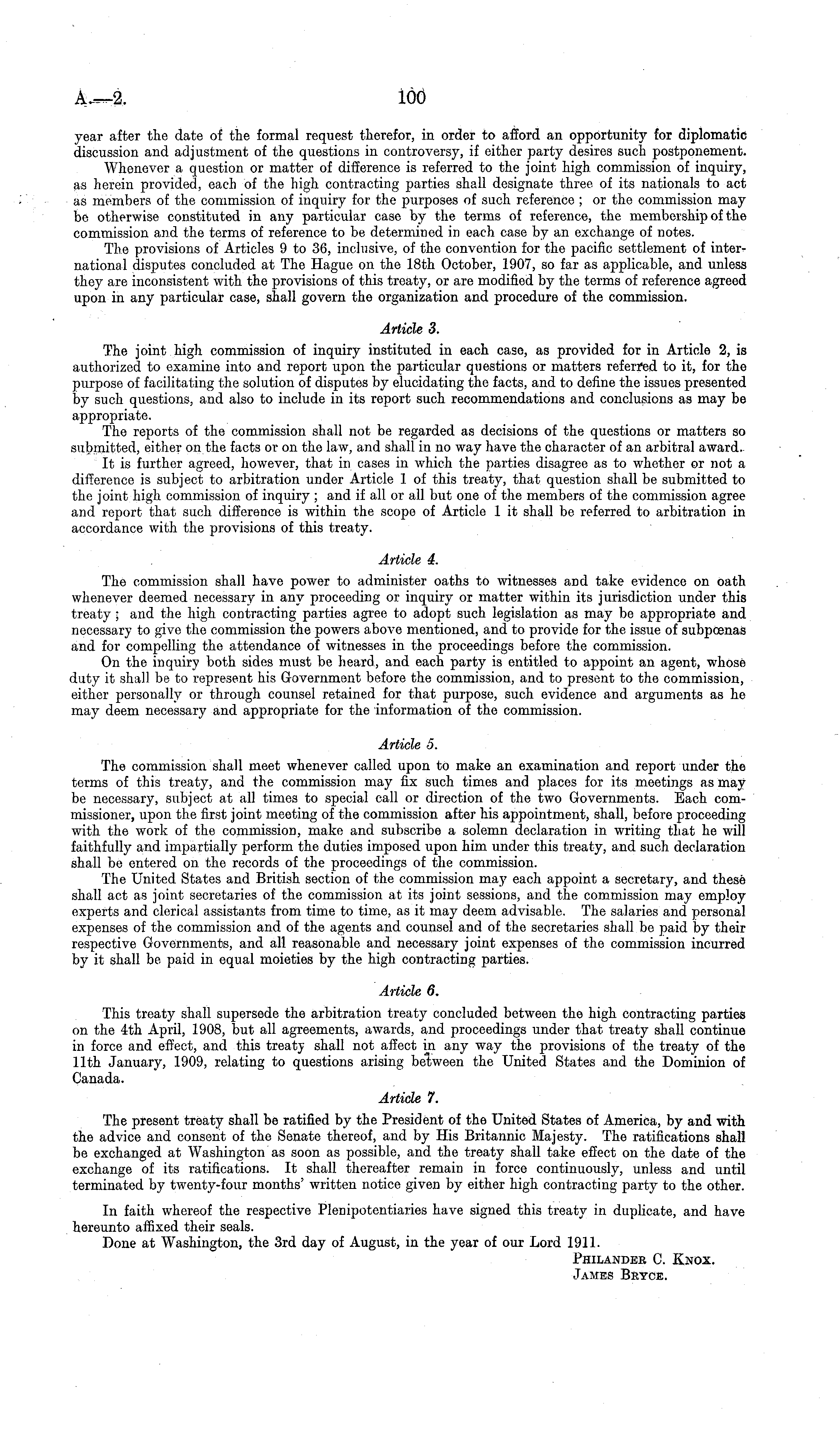 year after the date of the formal request therefor, in order to afford an opportunity for diplomatic discussion and adjustment of the questions in controversy, if either party desires such postponement. Whenever a question or matter of difference is referred to the joint high commission of inquiry, as herein provided, each of the high contracting parties shall designate three of its nationals to act as members of the commission of inquiry for the purposes of such reference ; or the commission may be otherwise constituted in any particular case by the terms of reference, the membership of the commission and the terms of reference to be determined in each case by an exchange of notes. The provisions of Articles 9 to 36, inclusive, of the convention for the pacific settlement of international disputes concluded at The Hague on the 18th October, 1907, so far as applicable, and unless they are inconsistent with the provisions of this treaty, or are modified by the terms of reference agreed upon in any particular case, shall govern the organization and procedure of the commission. Article 3. The joint high commission of inquiry instituted in each case, as provided for in Article 2, is authorized to examine into and report upon the particular questions or matters referred to it, for the purpose of facilitating the solution of disputes by elucidating the facts, and to define the issues presented by such questions, and also to include in its report such recommendations and conclusions as may be appropriate. The reports of the commission shall not be regarded as decisions of the questions or matters so submitted, either on the facts or on the law, and shall in no way have the character of an arbitral award. It is further agreed, however, that in cases in which the parties disagree as to whether or not a difference is subject to arbitration under Article 1 of this treaty, that question shall be submitted to the joint high commission of inquiry ; and if all or all but one of the members of the commission agree and report that such difference is within the scope of Article 1 it shall be referred to arbitration in accordance with the provisions of this treaty. Article 4. The commission shall have power to administer oaths to witnesses and take evidence on oath whenever deemed necessary in any proceeding or inquiry or matter within its jurisdiction under this treaty; and the high contracting parties agree to adopt such legislation as may be appropriate and necessary to give the commission the powers above mentioned, and to provide for the issue of subpoenas and for compelling the attendance of witnesses in the proceedings before the commission. On the inquiry both sides must be heard, and each party is entitled to appoint an agent, whose duty it shall be to represent his Government before the commission, and to present to the commission, either personally or through counsel retained for that purpose, such evidence and arguments as he may deem necessary and appropriate for the information of the commission. Article 5. The commission shall meet whenever called upon to make an examination and report under the terms of this treaty, and the commission may fix such times and places for its meetings as may be necessary, subject at all times to special call or direction of the two Governments. Each commissioner, upon the first joint meeting of the commission after his appointment, shall, before proceeding with the work of the commission, make and subscribe a solemn declaration in writing that he will faithfully and impartially perform the duties imposed upon him under this treaty, and such declaration shall be entered on the records of the proceedings of the commission. The United States and British section of the commission may each appoint a secretary, and these shall act as joint secretaries of the commission at its joint sessions, and the commission may employ experts and clerical assistants from time to time, as it may deem advisable. The salaries and personal expenses of the commission and of the agents and counsel and of the secretaries shall be paid by their respective Governments, and all reasonable and necessary joint expenses of the commission incurred by it shall be paid in equal moieties by the high contracting parties. Article 6. This treaty shall supersede the arbitration treaty concluded between the high contracting parties on the 4th April, 1908, but all agreements, awards, and proceedings under that treaty shall continue in force and effect, and this treaty shall not affect in any way the provisions of the treaty of the 11th January, 1909, relating to questions arising between the United States and the Dominion of Canada. Article 7. The present treaty shall be ratified by the President of the United States of America, by and with the advice and consent of the Senate thereof, and by His Britannic Majesty. The ratifications shall be exchanged at Washington as soon as possible, and the treaty shall take effect on the date of the exchange of its ratifications. It shall thereafter remain in force continuously, unless and until terminated by twenty-four months' written notice given by either high contracting party to the other. In faith whereof the respective Plenipotentiaries have signed this treaty in duplicate, and have hereunto affixed their seals. Done at Washington, the 3rd day of August, in the year of our Lord 1911. Philander C. Knox. James Bryce.