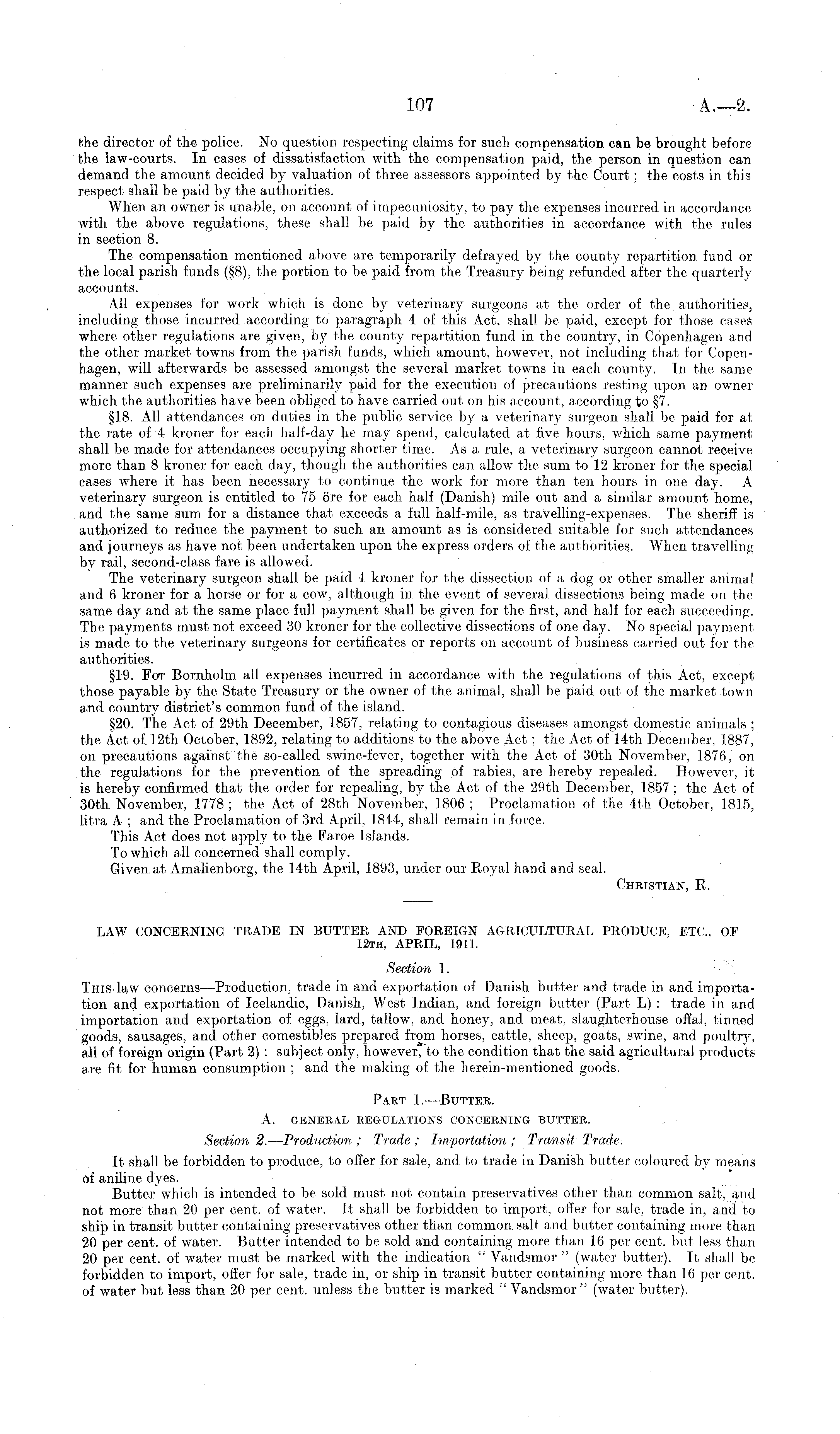 the director of the police. No question respecting claims for such compensation can be brought, before, the, law-courts. In cases of dissatisfaction with the compensation paid, the person in question can demand the amount decided by valuation of three assessors appointed by the Court; the costs in this respect shall be paid by the authorities. When an owner is unable, on account of impecuniosity, to pay the expenses incurred in accordance with the above regulations, these shall be paid by the authorities in accordance with the rules in section 8. The compensation mentioned above are temporarily defrayed by the county repartition fund or the local parish funds (§8), the portion to be paid from the, Treasury being refunded after the quarterly accounts. All expenses for work which is done by veterinary surgeons at the order of the authorities, including those incurred according to paragraph 4 of this Act, shall be paid, except for those cases where other regulations are given, by the county repartition fund in the country, in Copenhagen and the other market towns from the parish funds, which amount, however, not including that for Copenhagen, will afterwards be assessed amongst the several market towns in each county 7 . In the same manner such expenses are preliminarily paid for the execution of precautions resting upon an owner which the authorities have been obliged to have carried out on his account, according to §7. §18. All attendances on duties in the public service by a veterinary surgeon shall be paid for at the rate of 4 kroner for each half-day he may spend, calculated at five hours, which same payment shall be made for attendances occupying shorter time. As a rule, a veterinary surgeon cannot receive more than 8 kroner for each day, though the authorities can allow the sum to 12 kroner for the special cases where it has been necessary to continue the work for more than ten hours in one, day. A veterinary surgeon is entitled to 75 ore for each half (Danish) mile out a.nd a similar amount home, and the same sum for a distance that exceeds a full half-mile, as travelling-expenses. The sheriff is authorized to reduce the payment to such an amount as is considered suitable for such attendances and journeys as have not been undertaken upon the express orders of the authorities. When travelling by rail, second-class fare is allowed. The veterinary surgeon shall be paid 4 kroner for the dissection of a dog or other smaller animal and 6 kroner for a horse or for a cow, although in the event of several dissections being made on the same day and at the same place full payment shall be given for the first, and half for each succeeding. The payments must not exceed 30 kroner for the collective dissections of one, day. No special paymenl is made to the veterinary surgeons for certificates or reports < ccount of business carried out for the authorities. §19. For Bornholm all expenses incurred in accordance with the regulations of this Act, except those payable by the State Treasury or the owner of the animal, shall be paid out of the market town and country district's common fund of the island. §20. The Act of 29th December, 1.857, relating to contagious diseases amongst domestic animals ; the Act of 12th October, 1892, relating to additions to the above Act : the Act of 14th December, 1887, on precautions against the so-called swine-fever, together with the Act of 30th November, 1876, on the regulations for the prevention of the spreading of rabies, are hereby repealed. However, it is hereby confirmed that the order for repealing, by the Act of the 29th December, 1857; the Act of 30th November, 1778; the Act of 28th November, 1806; Proclamation of the 4th October, 1815, litra A ; and the Proclamation of 3rd April, 1844, shall remain in force. This Act does not apply to the Faroe Islands. To which all concerned shall comply. Given at Amalienborg, the 14th April, 1893, under our Royal hand and seal. Christian, R.