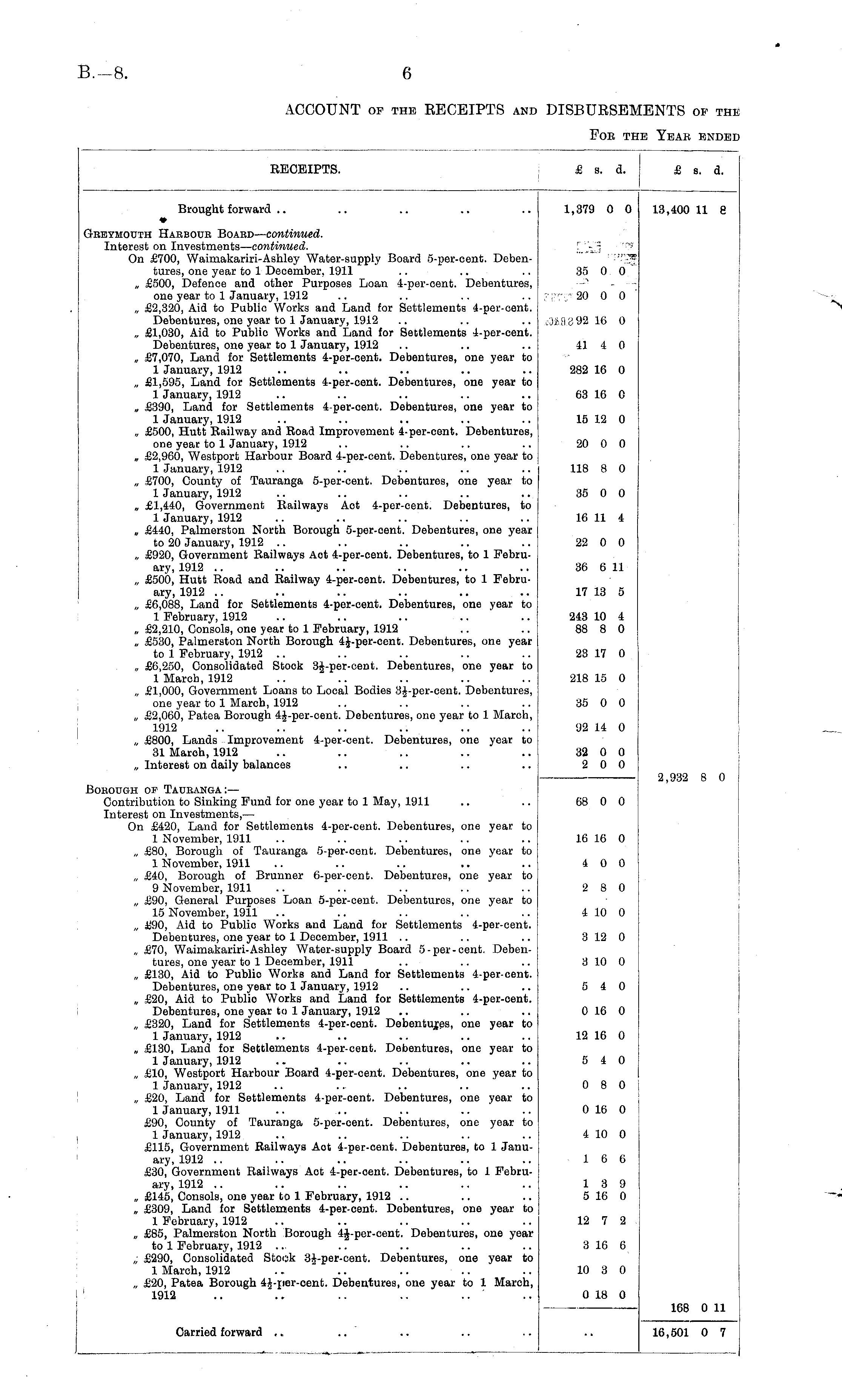 RECEIPTS. £ s. d. £ s. d. Brought forward .. 1,379 0 0 13,400 11 8 Greymouth Harbour Board— continued. Interest on Investments — continued. On £700, Waimakariri-Ashley Water-supply Board 5-per-cent. Debentures, one year to 1 December, 1911 „ £500, Defence and other Purposes Loan 4-per-cent. Debentures, one year to 1 January, 1912 „ £2,320, Aid to Public Works and Land for Settlements 4-per-cent. Debentures, one year to 1 January, 1912 „ £1,030, Aid to Public Works and Land for Settlements 4-per-cent. Debentures, one year to 1 January, 1912 „ £7,070, Land for Settlements 4-per-cent. Debentures, one year to 1 January, 1912 „ £1,595, Land for Settlements 4-per-cent. Debentures, one year to 1 January, 1912 „ £390, Land for Settlements 4-per-oent. Debentures, one year to 1 January, 1912 „ £500, Hutt Railway and Road Improvement 4-per-cent. Debentures, one year to 1 January, 1912 „ £2,960, Westport Harbour Board 4-per-cent. Debentures, one year to 1 January, 1912 „ £700, County of Tauranga 5-per-cent. Debentures, one year to 1 January, 1912 „ £1,440, Government Railways Act 4-per-cent. Debentures, to 1 January, 1912 „ £440, Palmerston North Borough 5-per-cent. Debentures, one year to 20 January, 1912 .. „ £920, Government Railways Aot 4-per-cent. Debentures, to 1 February, 1912 .. „ £500, Hutt Road and Railway 4-per-cent. Debentures, to 1 February, 1912 .. „ £6,088, Land for Settlements 4-per-cent. Debentures, one year to 1 February, 1912 „ £2,210, Consols, one year to 1 February, 1912 „ £530, Palmerston North Borough 4J-per-cent. Debentures, one year to 1 February, 1912 .. „ £6,250, Consolidated Stock 3J-per-cent. Debentures, one year to 1 March, 1912 .. .. „ £1,000, Government Loans to Local Bodies 3J-per-cent. Debentures, one year to 1 March, 1912 „ £2,060, Patea Borough 4J-per-cent. Debentures, one year to 1 March, 1912 „ £800, Lands Improvement 4-per-cent. Debentures, one year to 31 March, 1912 „ Interest on daily balances ■■".•a? 35 0 o7* ,-;-:;'20 0 0 .o3j8.8.392 16 0 41 4 0 282 16 0 63 16 C 15 12 0 20 0 0 118 8 0 35 0 0 16 11 4 22 0 0 36 6 11 17 13 5 243 10 4 88 8 0 23 17 0 218 15 0 35 0 0 92 14 0 32 0 0 2 0 0 2,932 8 0 Borough oe Tauranga:— Contribution to Sinking Fund for one year to 1 May, 1911 Interest on Investments, — On £420, Land for Settlements 4-per-cent. Debentures, one year to 1 November, 1911 „ £80, Borough of Tauranga 5-per-cent. Debentures, one year to 1 November, 1911 „ £40, Borough of Brunner 6-per-cent. Debentures, one year to 9 November, 1911 „ £90, General Purposes Loan 5-per-cent. Debentures, one year to 15 November, 1911 .. „ £90, Aid to Publio Works and Land for Settlements 4-per-cent. Debentures, one year to 1 December, 1911 .. „ £70, Waimakariri-Ashley Water-supply Board 5-per-cent. Debentures, one year to 1 December, 1911 „ £130, Aid to Publio Works and Land for Settlements 4-per-cent. Debentures, one year to 1 January, 1912 „ £20, Aid to Publio Works and Land for Settlements 4-per-oent. Debentures, one year to 1 January, 1912 „ £320, Land for Settlements 4-per-cent. Debentures, one year to 1 January, 1912 „ £130, Land for Settlements 4-per-cent. Debentures, one year to 1 January, 1912 „ £10, Westport Harbour Board 4-per-cent. Debentures, one year to 1 January, 1912 „ £20, Land for Settlements 4-per-oent. Debentures, one year to 1 January, 1911 £90, County of Tauranga 5-per-cent. Debentures, one year to 1 January, 1912 £115, Government Railways Aot 4-per-cent. Debentures, to 1 January, 1912 £30, Government Railways Act 4-per-oent. Debentures, to 1 February, 1912 .. „ £145, Consols, one year to 1 February, 1912 .. „ £309, Land for Settlements 4-per-cent. Debentures, one year to 1 February, 1912 „ £85, Palmerston North Borough 4J-per-cent. Debentures, one year to 1 February, 1912 .. „ £290, Consolidated Stook 3J-per-cent. Debentures, one year to 1 March, 1912 „ £20, Patea Borough Debentures, one year to 1 March, 1912 .. .. .. .. .. ' 68 0 0 16 16 0 4 0 0 2 8 0 4 10 0 3 12 0 3 10 0 5 4 0 0 16 0 12 16 0 5 4 0 0 8 0 0 16 0 4 10 0 16 6 13 9 5 16 0 12 7 2 3 16 6 10 3 0 0 18 0 168 0 11 Carried forward 16,501 0 7