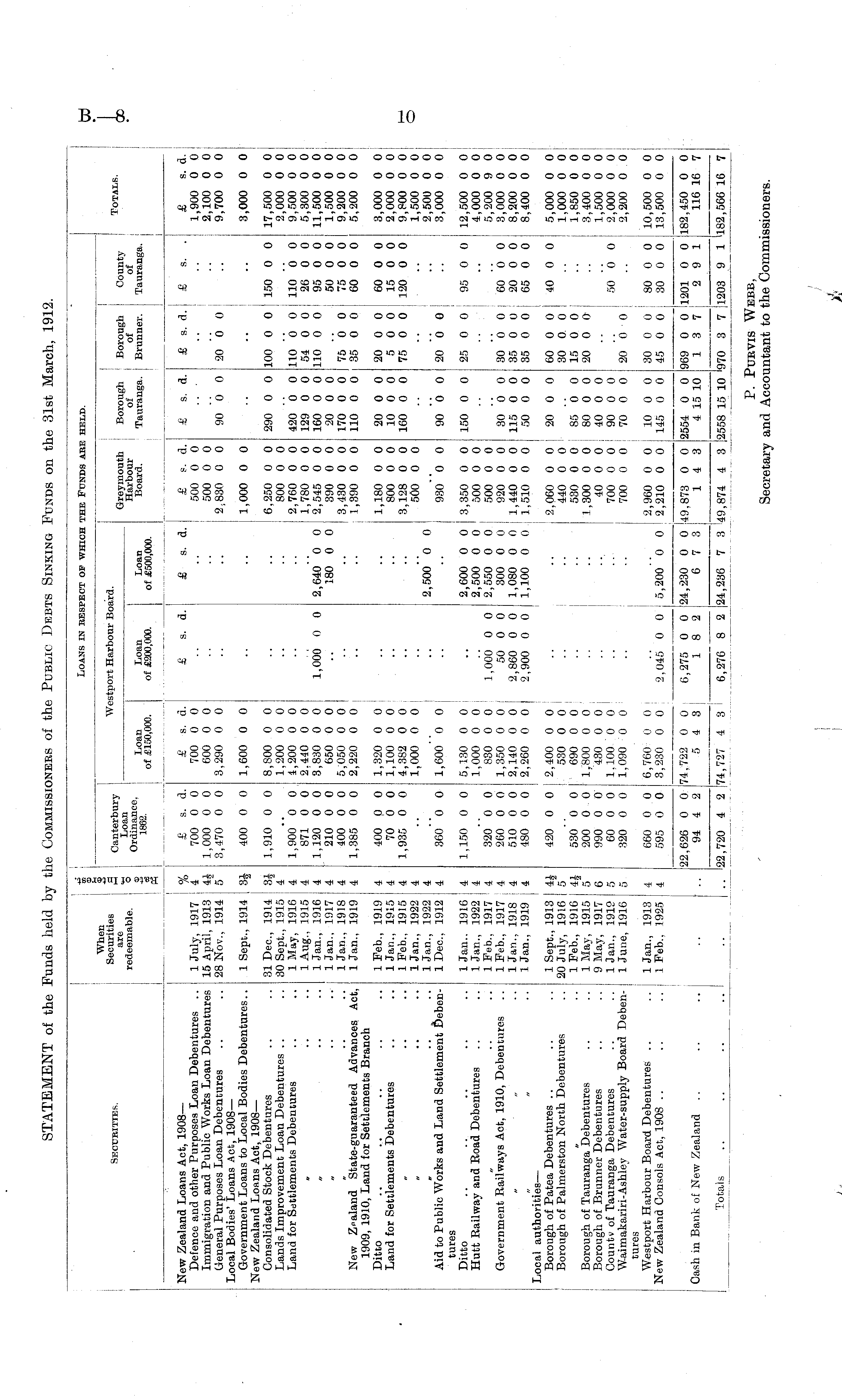 tn Loans in bespect of which the Funds are held. ! 0> Securities, When Securities are redeemable. o j © ! M Canterbury Loan Ordinance. 1862. sstport Harbour Board. rreymouth : Borough Harbour of Board. Tauranga. Borough County of of Brunner. Tauranga. Totals. Loan of £150,000. Loan of £200,000. Loan of £500,000. New Zealand Loans Act, 1908 — Defence and other Purposes Loan Debentures .. Immigration and Public Works Loan Debentures General Purposes Loan Debentures Local Bodies' Loans Act, 1908 — Government Loans to Local Bodies Debentures.. New Zealand Loans Act, 1908 — Consolidated Stock Debentures Lands Improvement Loan Debentures Land for Settlements Debentures 1 July, 1917 15 April, 1913 28 Nov., 1914 ' 1 Sept., 1914 | o/ /o 4 i 8J £ s. d. 700 0 0 1,000 0 0 3,470 0 0 400 0 0 £ s. d. 700 0 0 600 0 0 3,290 0 0 1,600 0 0 £ s. d. £ s. d. £ s. d. 500 0 0 500 0 0 2 S 830 0 0 1,000 0 0 £ s. d. 90 0 0 £ s. d. i £ s. . 20 6 0 £ s. d. 1,900 0 0 ' 2,100 0 0 9,700 0 0 j 3,000 0 0 31 Dec, 1914 30 Sept., 1915 1 May, 1916 lAug., 1915 1 Jan., 1916 1 Jan., 1917 1 Jan., 1918 j 1 Jan., 1919 j 3* 4 4 4 4 i 4 I 4 1,910 0 0 1,900 0 0 871 0 0 1,120 0 0 210 0 0 400 0 0 1,385 0 0 8,800 0 0 1,200 0 0 4,200 0 0 2.440 0 0 3,830 0 0 650 0 0 5,050 0 0 2,220 0 0 1,000 0 0 2,640 0 0 180 0 0 6,250 0 0 800 0 0 2,760 0 0 1,780 0 0 2,545 0 0 390 0 0 3,430 0 0 1,390 0 0 290 0 0 420 0 0 129 0 0 160 0 0 20 0 0 170 0 0 110 0 0 100 0 0 j 150 0 0 110 6 0 i 110 0 0 54 0 0 : 26 0 0 110 0 0 95 0 0 50 0 0 75 0 0 75 0 0 35 0 0 60 0 0 20 0 0 j 60 0 0 5 0 0 1 15 0 0 75 0 0 120 0 0 17,500 0 0 i 2,000 0 0 : 9,500 0 0 5,300 0 0 11,500 0 0 1,500 0 0 9,200 0 0 5,200 0 0 New Zealand State-guaranteed Advances Act, 1909, 1910, Land for Settlements Branch Ditto Land for Settlements Debentures 1 Feb., 1919 1 Jan., 1915 1 Feb., 1915 Uan., 1922 1 Jan., 1922 1 Dec, 1912 4 4 4 4 4 4 400 0 0 70 0 0 1,935 0 0 1,320 0 0 1,100 0 0 4,382 0 0 1,000 0 0 1,600 0 0 1,180 0 0 800 0 0 3,128 0 0 500 0 0 20 0 0 10 0 0 160 0 0 3,000 0 0 , 2,000 0 0; 9,800 0 0 1,500 0 0 2,500 0 0 3,000 0 0 Aid to Public Works and Land Settlement Debentures Ditto Hutt Railway and Road Debentures 360 0 0 2,50o"o 0 93o"o 0 90 "6 0 20 0 0 '.'. Government Railways Act, 1910, Debentures Uan.. 1916 1 Jan., 1922 1 Feb., 1917 '■ 1 Feb., 1917 Uan., 1918 Uan., 1919 j 4 4 4 4 4 1,150 0 0 320 0 0 260 0 0 510 0 0 480 0 0 5,130 0 0 1,000 0 0 830 0 0 1,350 0 0 2,140 0 0 | 2,260 0 0 1,000 0 0 50 0 0 2,860 0 0 2,900 0 0 2,600 0 0 2,500 0 0 2,550 0 0 300 0 0 1,080 0 0 1,100 0 0 3,350 0 0 500 0 0 500 0 0 920 0 0 1,440 0 0 1,510 0 0 150 0 0 30 0 0 115 0 0 50 0 0 25 0 0 95 0 0 30 0 0 : 60 0 0 35 0 0 ; 20 0 0 35 0 0 ; 65 0 0 12,500 0 0 4,000 0 0 5,200 9 0 3,000 0 0 8,200 0 0 8,400 0 0 Local authorities — Borough of Patea Debentures Borough of Palmerston North Debentures 1 Sept., 1913 20 July, 1916 1 Feb., 1916 1 May, 1915 9 May, 1917 1 Jan., 1919 1 June, 1916 5 5 6 5 5 420 0 0 2,400 0 0 530 0 0 690 0 0 1,800 0 0 430 0 0 1,100 0 0 1,090 0 0 2,060 0 0 440 0 0 530 0 0 1,300 0 0 40 0 0 700 0 0 700 0 0 20 0 0 i 60 0 0 [ 40 0 0 30 0. 0 I 15 0 0 j 20 0 0 j 5,000 0 0 1,000 0 0 1,850 0 0 3,400 0 0 1,500 0 0' 2,000 0 0 2,200 0 0 ! Borough of Tauranga Debentures Borough of Brunner Debentures Counts' of Tauranga Debentures Waimakariri-Ashley Water-supply Board Debentures Westport Harbour Board Debentures New Zealand Consols Act, 1908 530 0 0 200 0 0 990 0 0 60 0 0 320 0 0 85 0 0 80 0 0 40 0 0 90 0 0 70 0 0 j 50 0 0 20 00 1 Jan., 1913 1 Feb., 1925 4 4 660 0 0 595 0 0 6,760 0 0 3,230 0 0 2,045 0 0 5,200 0 0 2,960 0 0 2,210 0 0 10 0 0 145 0 0 30 0 0 80 0 0 45 0 0 i 30 0 0 10,500 0 0 : 13,500 0 0 ; Cash in Bank of New Zealand Totals 22.626 0 0 94 4 2 74,722 0 0 6,275 0 0 5 4 3 | 18 2 74,727 4 8 i 6,276 8 2 124,230 0 0 6 7 3 149.873 0 0 14 3 2554 0 0 4 15 10 969 0 0 11201 0 0 1 3 7 | 2 9 1 182,450 0 0 116 16 7 22,720 4 2 |24,236 7 3 9,874 4 3 12558 15 10 W0 3 7 1203 9 1 '182,566 16 7