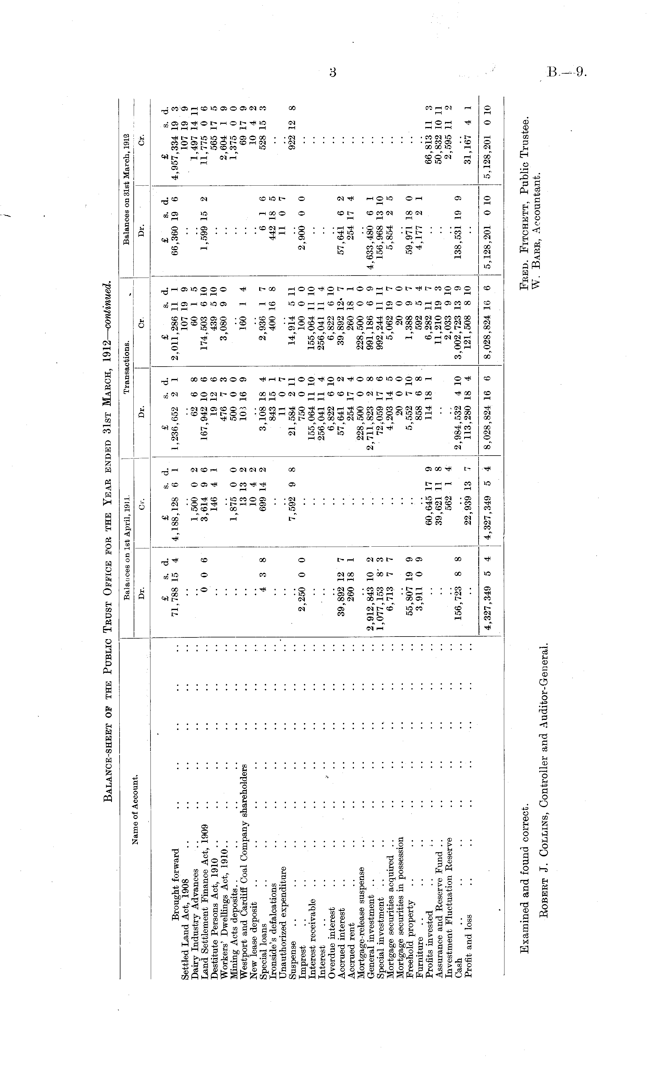 Balances on 1st April, 1911. I Transactions. Balances on 31st March, 1912 Name of Account. Dr. Cr. Dr. Cr. Dr. Cγ. Brought forward Settled Land Act, 1908 Dairy Industry Advances Land Settlement Finance Act, 1909 Destitute Persons Act, 1910 Workers' Dwellings Act, 1910.. Mining Acts deposits Westport and Cardiff Coal Company shareholders New lease deposit Special loans Ironside's defalcations Unauthorized expenditure Suspense Imprest Interest receivable Interest .. .. .. .. Overdue interest .. .. .. Accrued interest .. .. Accrued rent Mortgage-release suspense General investment Special investment Mortgage securities acquired Mortgage securities in possession Freehold property .. .. Furniture Profits invested Assurance and Reserve Fund Investment Fluctuation Reserve Cash Profit and loss .. .. £ s. d. 71,788 15 4 £ s. d. 4,188,128 6 1 £ s. d. 1,236,652 2 1 £ s. d. 2,011,286 11 1 107 19 9 60 1 5 174,503 6 10 439 5 10 3,080 9 0 £ s. d. 66,360 19 6 £ s. d. 4,957,334 19 3 107 19 9 1,497 14 11 11,775 0 6 565 17 5 2,604 1 9 1,375 0 0 69 17 9 10 4 2 528 15 3 0 0 6 1,500 0 2 3,614 9 6 146 4 1 62 6 8 167,942 10 6 19 12 6 476 7 3 500 0 0 103 16 9 1,599 15 2 .. 1,875 0 0 13 13 2 10 4 2 699 14 2 160 1 4 •• •• 4 3 8 3,108 18 4 843 15 1 11 0 7 21,584 2 11 750 0 0 155,064 11 10 256,041 11 4 6,822 6 10 57,641 6 2 254 17 4 228,500 0 0 2,711,823 2 8 72,059 17 6 4,203 14 5 20 0 0 5,552 7 10 858 6 8 114 18 1 2,936 1 7 400 16 8 j 6 1 6 442 18 5 11 0 7 2,250 0 0 39,892 12 7 260 18 1 2,912,843 10 2 1,077,153 8' 3 6,713 7 7 7,592 9 8 14,914 5 11 100 0 0 155,064 11 10 256,041 11 4 6,822 6 10 39,892 12- 7 260 18 1 228,500 0 0 991,186 6 9 992,244 11 11 5,062 19 7 20 0 0 1,388 9 7 592 5 4 6,282 11 7 11,210 19 3 2,033 9 10 3,002,723 13 9 121,508 8 10 2,900 0 0 57,641 6 2 254 17 4 4,633,480 6 1 156,968 13 10 5,854 2 5 922 12 8 * • " " 55,807 19 9 3,911 0 9 59,971 18 0 4,177 2 1 60,645 17 9 39,621 11 8 562 1 4 •• ■■ •• 66,8i3 11 3 50,832 10 11 2,595 11 2 156,723 8 8 ! 22,939 13 7 2,984,532 4 10 113,280 18 4 138,531 19 9 31,167 4 1 4,327,349 5 4 4,327,349 5 4 8,028,824 16 6 8,028,824 16 6 5,128,201 0 10 5,128,201 0 10