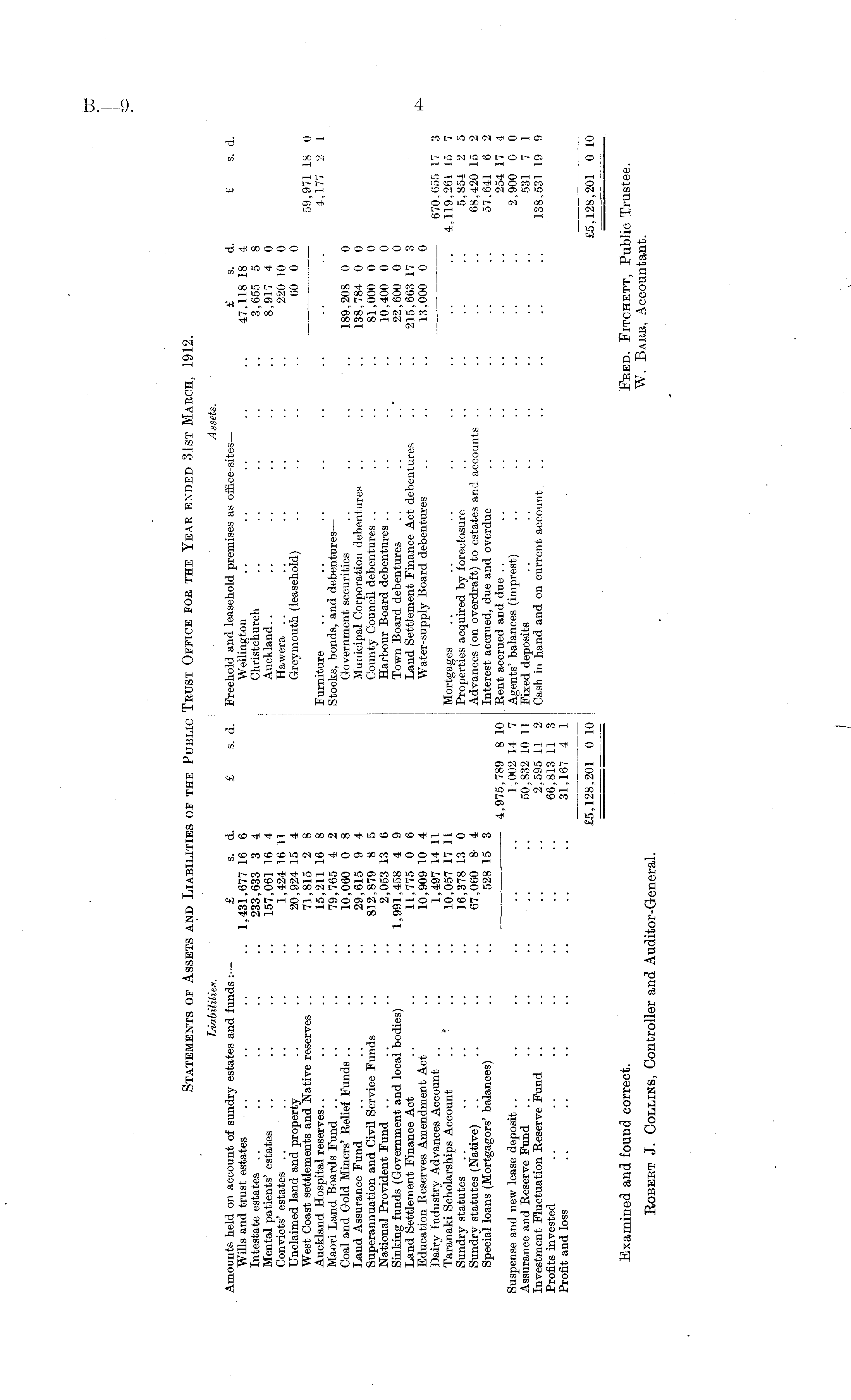 Statements of Assets and Liabilities of the Public Trust Office for the Year ended 31st March, 1912. Liabilities. Assets. Amounts held on account of sundry estates and funds:— £ s. d. £ s. d. j Freehold and leasehold premises as office-sites— £ s. d. E s. d. Wills and trust estates .. .. .. .. 1,431,677 16 6 Wellington .. .. .. .. .. 47,118 18 4 Intestate estates .. .. .. 233, 633 3 4 Christchurch .. .. .. .. .. 3,655 5 8 Mental patients' estates .. .. .. .. 157,061 16 4 Auckland.. .. .. .. .. .. 8,917 4 0 Convicts' estates .. .. .. .. .. 1,424 16 11 Hawera .. .. .. .. .. .. 220 10 0 Unclaimed land and property .. .. .. 20,924 15 4 Greymouth (leasehold) .. .. .. .. 60 0 0 West Coast settlements and Native reserves .. .. 71,815 2 8 59,971 18 0 Auckland Hospital reserves.. .. .. .. 15,211 16 8 Furniture .. .. .. .. .. .. .. .. 4,177 2 1 Maori Land Boards Fund .. .. .. .. 79,765 4 2 Stocks, bonds, and debentures— Coal and Gold Miners' Relief Funds .. .. .. 10,060 0 8 Government securities .. .. .. '.. 189,208 0 0 Land Assurance Fund .. .. .. .. 29,615 9 4 Municipal Corporation debentures .. .. .. 138,784 0 0 Superannuation and Civil Service Funds .. .. 812,879 8 5 County Council debentures .. .. .. .. 81,000 0 0 National Provident Fund .. .. .. .. 2,053 13 6 Harbour Board debentures .. .. .. .. 10,400 0 0 Sinking funds (Government and local bodies) .. 1,991,458 4 9 Town Board debentures .. .. ..' .. 22,600 0 0 Land Settlement Finance Act .. .. .. 11,775 0 6 Land Settlement Finance Act debentures .. .. 215,663 17 3 Education Reserves Amendment Act .. .. 10,909 10 4 Water-supply Board debentures .. .. .. 13,000 0 0 Dairy Industry Advances Account .. .. .. 1,497 14 11 670,655 17 3 Taranaki Scholarships Account .. .. .. 10,057 17 11 Mortgages .. .. .. .. .. .. .. .. 4,119,261 15 7 Sundry statutes .. .. .. .. .. 16,378 13 0 Properties acquired by foreclosure .. .. .. .. .. 5,854 2 5 Sundry statutes (Native) .. .. .. .. 67,060 8- 4 Advances (on overdraft) to estates and accounts .. .. .. .. 68,420 15 2 Special loans (Mortgagors' balances) .. .. 528 15 3 Interest accrued, due and overdue .. .. .. .. .. 57,641 6 2 4,975,789 810 Rent accrued and due .. .. .. .. .. .. .. 254 17 4 Suspense and new lease deposit .. .. .. .. .. .. 1,002 14 7 Agents' balances (imprest) .. .. .. .. .. .. 2,900 0 0 Assurance and Reserve Fund .. .. .. .. .. .. 50,832 10 11 Fixed deposits .. .. .. .. .. .. .. 531 7 1 Investment Fluctuation Reserve Fund .. .. .. .. .. 2,595 11 2 Cash in hand and on current account .. .. .. .. .. 138,531 19 fl Profits invested .. .. .. .. .. .. .. 66,813 11 3 Profit and loss .. .. .. .. .. .. .. 31,167 4 1 £5,128,201 0 10 £5,128,201 0 10 Examined and found correct. Feed. Fitchett, Public Trustee. „ T „ r. „ , . ... „ , W. Bare, Accountant. Robert J. Collins, Controller and Auditor-General.