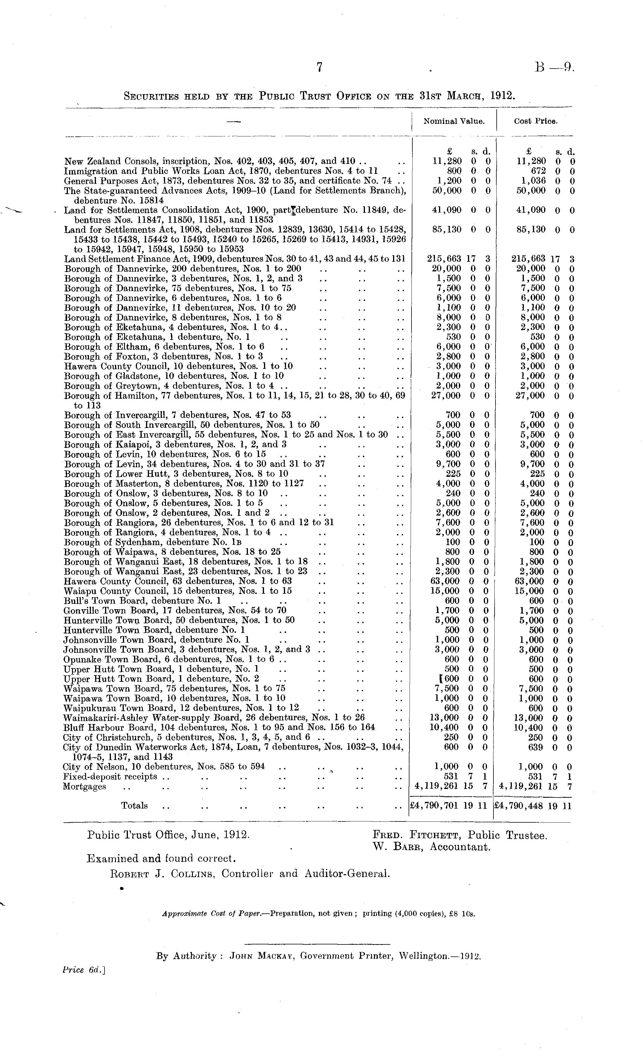 Nominal Value. Cost Price. New Zealand Consols, inscription, Nos. 402, 403, 405, 407, and 410 Immigration and Public Works Loan Act, 1870, debentures Nos. 4 to 11 General Purposes Act, 1873, debentures Nos. 32 to 35, and certificate No. 74 .. The State-guaranteed Advances Acts, 1909-10 (Land for Settlements Branch), debenture No. 15814 Land for Settlements Consolidation Act, 1900, No. 11849, debentures Nos. 11847, 11850, 11851, and 11853 Land for Settlements Act, 1908, debentures Nos. 12839, 13630, 15414 to 15428, 15433 to 15438, 15442 to 15493, 15240 to 15265, 15269 to 15413, 14931, 15926 to 15942, 15947, 15948, 15950 to 15953 Land Settlement Finance Act, 1909, debentures Nos. 30 to 41, 43 and 44, 45 to 131 Borough of Dannevirke, 200 debentures, Nos. 1 to 200 Borough of Dannevirke, 3 debentures, Nos. 1, 2, and 3 Borough of Dannevirke, 75 debentures, Nos. 1 to 75 Borough of Dannevirke, 6 debentures, Nos. 1 to 6 Borough of Dannevirke, 11 debentures, Nos. 10 to 20 Borough of Dannevirke, 8 debentures, Nos. 1 to 8 Borough of Eketahuna, 4 debentures, Nos. 1 to 4.. Borough of Eketahuna, 1 debenture, No. 1 Borough of Eltham, 6 debentures, Nos. 1 to 6 Borough of Foxton, 3 debentures, Nos. 1 to 3 Hawera County Council, 10 debentures, Nos. 1 to 10 Borough of Gladstone, 10 debentures, Nos. 1 to 10 Borough of Greytown, 4 debentures, Nos. 1 to 4 .. Borough of Hamilton, 77 debentures, Nos. 1 to 11, 14, 15, 21 to 28, 30 to 40, 69 to 113 Borough of Invercargill, 7 debentures, Nos. 47 to 53 Borough of South Invercargill, 50 debentures, Nos. 1 to 50 .. Borough of East Invercargill, 55 debentures, Nos. 1 to 25 and Nos. 1 to 30 Borough of Kaiapoi, 3 debentures, Nos. 1, 2, and 3 Borough of Levin, 10 debentures, Nos. 6 to 15 Borough of Levin, 34 debentures, Nos. 4 to 30 and 31 to 37 Borough of Lower Hutt, 3 debentures, Nos. 8 to 10 Borough of Masterton, 8 debentures, Nos. 1120 to 1127 Borough of Onslow, 3 debentures, Nos. 8 to 10 Borough of Onslow, 5 debentures, Nos. 1 to 5 Borough of Onslow, 2 debentures, Nos. 1 and 2 .. Borough of Rangiora, 26 debentures, Nos. 1 to 6 and 12 to 31 Borough of Rangiora, 4 debentures, Nos. 1 to 4 .. Borough of Sydenham, debenture No. 1b Borough of Waipawa, 8 debentures, Nos. 18 to 25 Borough of Wanganui East, 18 debentures, Nos. 1 to 18 .. Borough of Wanganui East, 23 debentures, Nos. 1 to 23 Hawera County Council, 63 debentures, Nos. 1 to 63 Waiapu County Council, 15 debentures, Nos. 1 to 15 Bull's Town Board, debenture No. 1 Gonville Town Board, 17 debentures, Nos. 54 to 70 Hunterville Town Board, 50 debentures, Nos. 1 to 50 Hunterville Town Board, debenture No. 1 Johnsonville Town Board, debenture No. 1 Johnsonville Town Board, 3 debentures, Nos. 1, 2, and 3 .. Opunake Town Board, 6 debentures, Nos. 1 to 6 .. Upper Hutt Town Board, 1 debenture, No. 1 Upper Hutt Town Board, 1 debenture, No. 2 Waipawa Town Board, 75 debentures, Nos. 1 to 75 Waipawa Town Board, 10 debentures, Nos. 1 to 10 Waipukurau Town Board, 12 debentures, Nos. 1 to 12 Waimakariri-Ashley Water-supply Board, 26 debentures, Nos. 1 to 26 Bluff Harbour Board, 104 debentures, Nos. 1 to 95 and Nos. 156 to 164 City of Christchurch, 5 debentures, Nos. 1, 3, 4, 5, and 6 .. City of Dunedin Waterworks Act, 1874, Loan, 7 debentures, Nos. 1032-3, 1044, 1074-5, 1137, and 1143 City of Nelson, 10 debentures, Nos. 585 to 594 Fixed-deposit receipts Mortgages £ s. d. 11,280 0 0 800 0 0 1,200 0 0 50,000 0 0 £ s. d. 11,280 0 0 672 0 0 1,036 0 0 50,000 0 0 £ s 11,280 C 672 C 1,036 C 50,000 C 41,090 0 0 41,090 0 0 41,090 C 85,130 0 0 85,130 0 0 85,130 C 215,663 17 3 20,000 0 0 1,500 0 0 7,500 0 0 6,000 0 0 1,100 0 0 8,000 0 0 2,300 0 0 530 0 0 6,000 0 0 2,800 0 0 3,000 0 0 1,000 0 0 2,000 0 0 27,000 0 0 215,663 17 3 20,000 0 0 1,500 0 0 7,500 0 0 6,000 0 0 1,100 0 0 8,000 0 0 2,300 0 0 530 0 0 6,000 0 0 2,800 0 0 3,000 0 0 1,000 0 0 2,000 0 0 27,000 0 0 215,663 17 20,000 C 1,500 0 7,500 0 6,000 0 1,100 0 8,000 0 2,300 0 530 0 6,000 0 2,800 0 3,000 0 1,000 0 2,000 0 27,000 0 700 0 0 5,000 0 0 5,500 0 0 3,000 0 0 600 0 0 9,700 0 0 225 0 0 4,000 0 0 240 0 0 5,000 0 0 2,600 0 0 7,600 0 0 2,000 0 0 100 0 0 800 0 0 1,800 0 0 2,300 0 0 63,000 0 0 15,000 0 0 600 0 0 1,700 0 0 5,000 0 0 500 0 0 1,000 0 0 3,000 0 0 600 0 0 500 0 0 [600 0 0 7,500 0 0 1,000 0 0 600 0 0 13,000 0 0 10,400 0 0 250 0 0 600 0 0 700 0 0 5,000 0 0 5,500 0 0 3,000 0 0 600 0 0 9,700 0 0 225 0 0 4,000 0 0 240 0 0 5,000 0 0 2,600 0 0 7,600 0 0 2,000 0 0 100 0 0 800 0 0 1,800 0 0 2,300 0 0 63,000 0 0 15,000 0 0 600 0 0 1,700 0 0 5,000 0 0 500 0 0 1,000 0 0 3,000 0 0 600 0 0 500 0 0 600 0 0 7,500 0 0 1,000 0 0 600 0 0 13,000 0 0 10,400 0 0 250 0 0 639 0 0 700 0 5,000 0 5,500 0 3,000 0 600 0 9,700 0 225 0 4,000 0 240 0 5,000 0 2,600 0 7,600 0 2,000 0 100 0 800 0 1,800 0 2,300 0 63,000 0 15,000 0 600 0 1,700 0 5,000 0 500 0 1,000 0 3,000 0 600 0 500 0 600 0 7,500 0 1,000 0 600 0 13,000 0 10,400 0 250 0 639 0 1,000 0 0 531 7 1 4,119,261 15 7 4, 1,000 0 0 531 7 1 4,119,261 15 7 1,000 0 531 7 ,119,261 15 Totals £4,790,701 19 11 i £4, £4,790,448 19 11 ,790,448 19