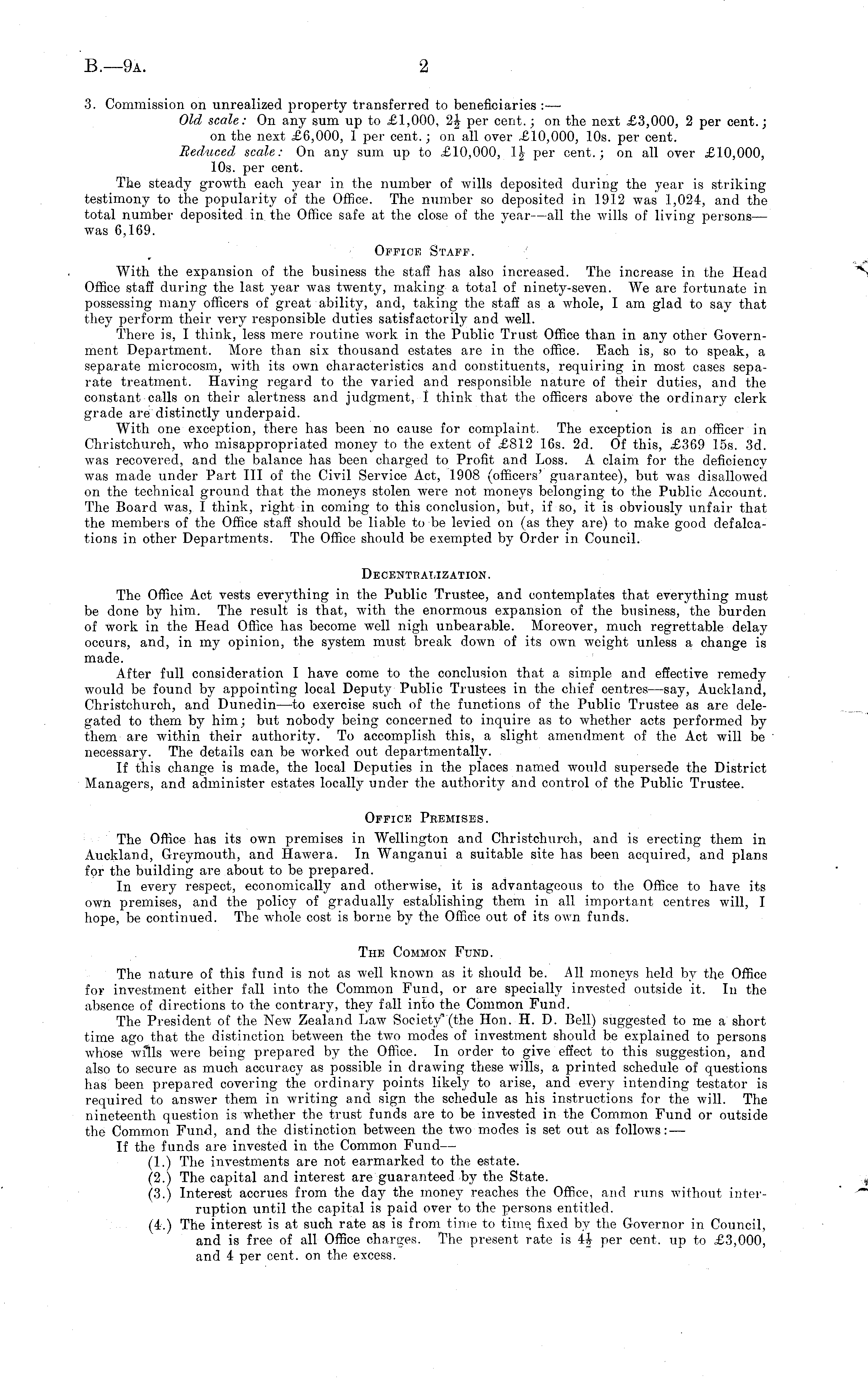 3. Commission on unrealized property transferred to beneficiaries : — Old scale: On any sum up to £1,000, 2J per cent.; on the next £3,000, 2 per cent.; on the next £6,000, 1 per cent.; on all over £10,000, 10s. per cent. Reduced scale: On any sum up to £10,000, \\ per cent.; on all over £10,000, 10s. per cent. The steady growth each year in the number of wills deposited during the year is striking testimony to the popularity of the Office. The number so deposited in 1912 was 1,024, and the total number deposited in the Office safe at the close of the year —all the wills of living persons— was 6,169. Office Staff. With the expansion of the business the staff has also increased. The increase in the Head Office staff during the last year was twenty, making a total of ninety-seven. We are fortunate in possessing many officers of great ability, and, taking the staff as a whole, I am glad to say that they perform their very responsible duties satisfactorily and well. There is, I think, less mere routine work in the Public Trust Office than in any other Government Department. More than six thousand estates are in the office. Each is, so to speak, a separate microcosm, with its own characteristics and constituents, requiring in most cases separate treatment. Having regard to the varied and responsible nature of their duties, and the constant calls on their alertness and judgment, 1 think that the officers above the ordinary clerk grade are distinctly underpaid. With one exception, there has been no cause for complaint. The exception is an officer in Christchurch, who misappropriated money to the extent of £812 16s. 2d. Of this, £369 15s. 3d. was recovered, and the balance has been charged to Profit and Loss. A claim for the deficiency was made under Part 111 of the Civil Service Act, 1908 (officers' guarantee), but was disallowed on the technical ground that the moneys stolen were not moneys belonging to the Public Account. The Board was, I think, right in coming to this conclusion, but, if so, it is obviously unfair that the members of the Office staff should be liable to be levied on (as they are) to make good defalcations in other Departments. The Office should be exempted by Order in Council. Decentralization. The Office Act vests everything in the Public Trustee, and contemplates that everything must be done by him. The result is that, with the enormous expansion of the business, the burden of work in the Head Office has become well nigh unbearable. Moreover, much regrettable delay occurs, and, in my opinion, the system must break down of its own weight unless a change is made. After full consideration I have come to the conclusion that a simple and effective remedy would be found by appointing local Deputy Public Trustees in the chief centres —say, Auckland, Christchurch, and Dunedin —to exercise such of the functions of the Public Trustee as are delegated to them by him; but nobody being concerned to inquire as to whether acts performed by them are within their authority. To accomplish this, a slight amendment of the Act will be necessary. The details can be worked out departmentally. If this change is made, the local Deputies in the places named would supersede the District Managers, and administer estates locally under the authority and control of the Public Trustee. Office Premises. The Office has its own premises in Wellington and Christchurch, and is erecting them in Auckland, Greymouth, and Hawera. In Wanganui a suitable site has been acquired, and plans for the building are about to be prepared. In every respect, economically and otherwise, it is advantageous to the Office to have its own premises, and the policy of gradually establishing them in all important centres will, I hope, be continued. The whole cost is borne by the Office out of its own funds. The Common Fund. The nature of this fund is not as well known as it should be. All moneys held by the Office for investment either fall into the Common Fund, or are specially invested outside it. In the absence of directions to the contrary, they fall into the Common Fund. The President of the New Zealand Law Society'(the Hon. H. D. Bell) suggested to me a short time ago that the distinction between the two modes of investment should be explained to persons whose wills were being prepared by the Office. In order to give effect to this suggestion, and also to secure as much accuracy as possible in drawing these wills, a printed schedule of questions has been prepared covering the ordinary points likely to arise, and every intending testator is required to answer them in writing and sign the schedule as his instructions for the will. The nineteenth question is whether the trust funds are to be invested in the Common Fund or outside the Common Fund, and the distinction between the two modes is set out as follows: — If the funds are invested in the Common Fund— (1.) The investments are not earmarked to the estate. (2.) The capital and interest are guaranteed by the State. (3.) Interest accrues from the day the money reaches the Office, and runs without interruption until the capital is paid over to the persons entitled. (4.) The interest is at such rate as is from time to time, fixed by the Governor in Council, and is free of all Office charges. The present rate is 4J per cent, up to £3,000, and 4 per cent, on the excess.