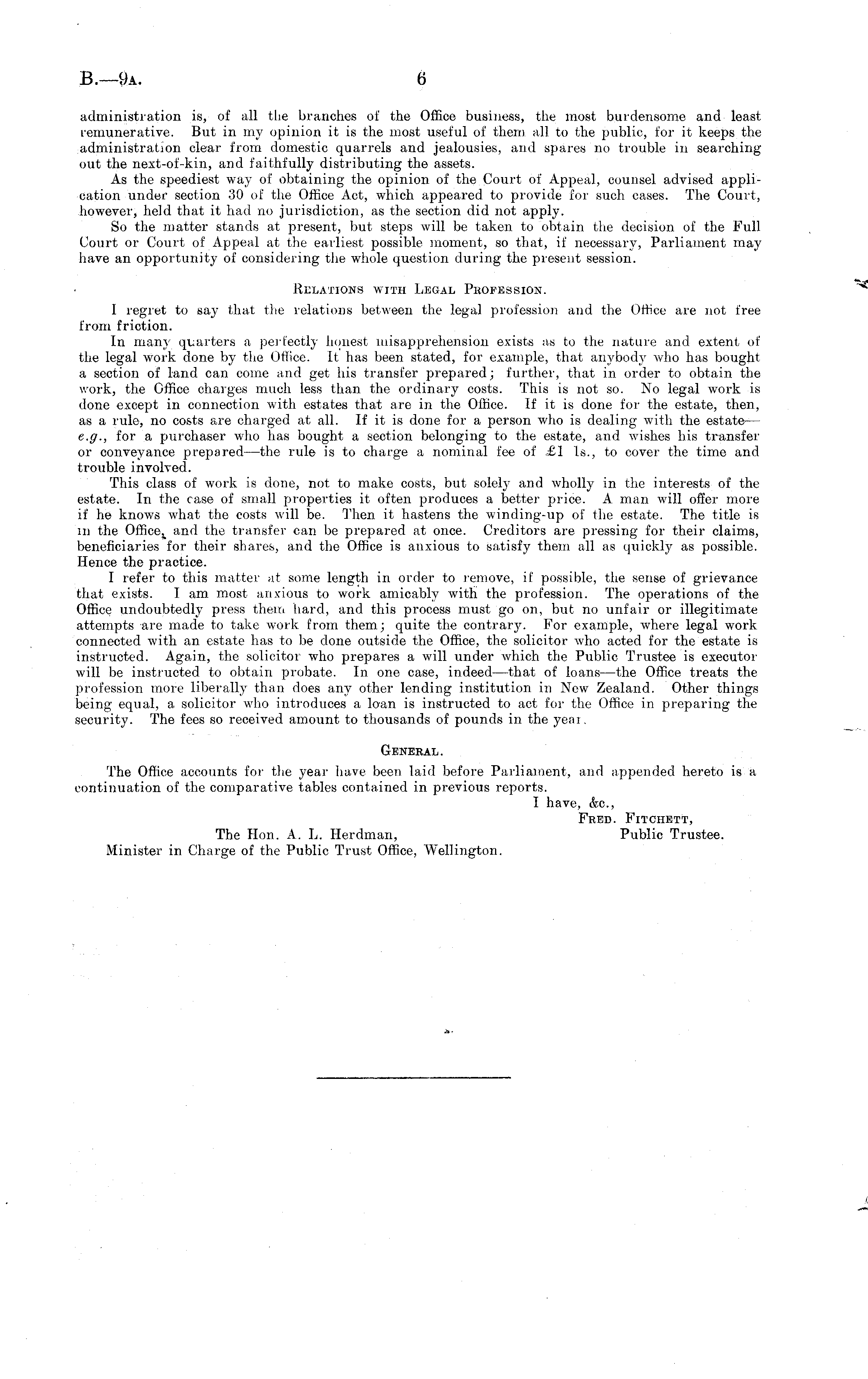 administration is, of all the branches of the Office business, the most burdensome and least remunerative. But in my opinion it is the most useful of them all to the public, for it keeps the administration clear from domestic quarrels and jealousies, and spares no trouble in searching out the next-of-kin, and faithfully distributing the assets. As the speediest way of obtaining the opinion of the Court of Appeal, counsel advised application under section 30 of the Office Act, which appeared to provide for such cases. The Court, however, held that it had no jurisdiction, as the section did not apply. So the matter stands at present, but steps will be taken to obtain the decision of the Full Court or Court of Appeal at the earliest possible moment, so that, if necessary, Parliament may have an opportunity of considering the whole question during the present session. Relations with JjEgal Profession. 1 regret to say that the relations between the legal profession and the Office are not free from friction. In many quarters a perfectly honest misapprehension exists as to the nature and extent of the legal work done by the Office. It has been stated, for example, that anybody who has bought a section of land can come and get his transfer prepared; further, that in order to obtain the work, the Office charges much less than the ordinary costs. This is not so. No legal work is done except in connection with estates that are in the Office. If it is done for the estate, then, as a rule, no costs are charged at all. If it is done for a person who is dealing with the estate — e.g., for a purchaser who has bought a section belonging to the estate, and wishes his transfer or conveyance prepared—the rule is to charge a nominal fee of £1 Is., to cover the time and trouble involved. This class of work is done, not to make costs, but solery and wholly in the interests of the estate. In the case of small properties it often produces a better price. A man will offer more if he knows what the costs will be. Then it hastens the winding-up of the estate. The title is in the and the transfer can be prepared at once. Creditors are pressing for their claims, beneficiaries for their shares, and the Office is anxious to satisfy them all as quickly as possible. Hence the practice. I refer to this matter at some length in order to remove, if possible, the sense of grievance that exists. lam most anxious to work amicably with the profession. The operations of the Office undoubtedly press them hard, and this process must go on, but no unfair or illegitimate attempts are made to take work from them; quite the contrary. For example, where legal work connected with an estate has to be done outside the Office, the solicitor who acted for the estate is instructed. Again, the solicitor who prepares a will under which the Public Trustee is executor will be instructed to obtain probate. In one case, indeed —that of loans—the Office treats the profession more liberally than does any other lending institution in New Zealand. Other things being equal, a. solicitor who introduces a loan is instructed to act for the Office in preparing the security. The fees so received amount to thousands of pounds in the year. General. The Office accounts for the year have been laid before Parliament, and appended hereto is a continuation of the comparative tables contained in previous reports. I have, &c, Feed. Fitchett, The Hon. A. L. Herdman, Public Trustee. Minister in Charge of the Public Trust Office, Wellington.