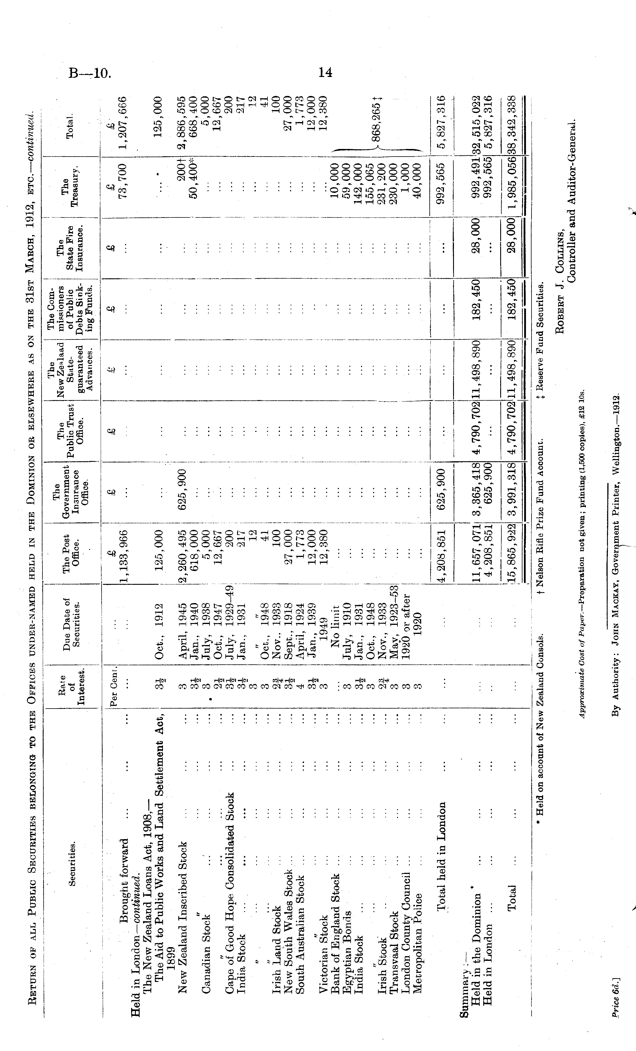 Securities. Rate of Interest. Due Date of Securities. The Post Office. The Government Insurance Office. The Public Trust Office. The New Ze»laad Stateguaranteed Advances. The Commissioners of Public Debts Sinking Funds. The State Fire Insurance. The Treasury. Total. Brought forward Held in London — continued. The New Zealand Loans Act, 1908, — The Aid to Public Works and Land Settlement Act, 1899 New Zealand Inscribed Stock Per Cent. £ 1,133,966 £ £ £ £ £ £ 73,700 £ 1,207,666 31 Oct., 1912 125,000 j } 125,000 i j tt ■ • - ■-. ■•• Canadian Stock Cape of Good Hope Consolidated Stock India Stock 3 34 . 3 24 34 34 3 3 3J4 3 April, 1945 ! Jan., 1940 July, 1938 Oct., 1947 July, 1929-49: Jan., 1931 Oct., 1948 Nov.. 1933 Sept.. 1918 April, 1924 Jan., 1939 1949 No limit July, 1910 Jan., 1931 ! Oct., 1948 Nov., 1933 Mav, 1923-53 1920 or after ! 1920 2,260,495 618,000 5,000 12,6.67 200 217 12 41 : 100 ! 27,000 1,773 ! 12,000 12,380 ; i— Z _ 625,900 1 1 200+ 50,400* ... 2,886,595 668,400 5,000 12,667 200 217 12 41 100 27,000 1,773 12,000 12,380 Irish Land Stock New South Wales Stock ... South Australian Stock ... I 1 ! ... I i a ■ ■ • ■ • • .-• ... Victorian Stock Bank of England Stock ... Egyptian Bonds India Stock 3 34 3 3 3 3 1 i 1 1 i i I 10,000 59,000 142,000 155,065 231,200 230,000 1,000 40,000 1 I >- 868,2651 Irish Stock Transvaal Stock London County Council ... Metropolitan Police l Total held in London 4,208,851 14,208,851 625,900 625,900 992,565 I 5,827,316 Summary :— Held in the Dominion ' Held in London ... 1 11,657,071) I 11,657,071 4,208,851 3,365,41^ 3,365,418 625,900 i 4, 4,790,702 ,790 11,498,890 182,450 28,000 992,491' 992,5651 '32,515,022 I 5,827,316 4,208,851 625.90C ... ... Total 'l5,865,922J i 3,991,313,991,318 S 4, 4,790,702! ,790 Ill, 498, 890 182,450 28,000 1,985,056 38,342,338