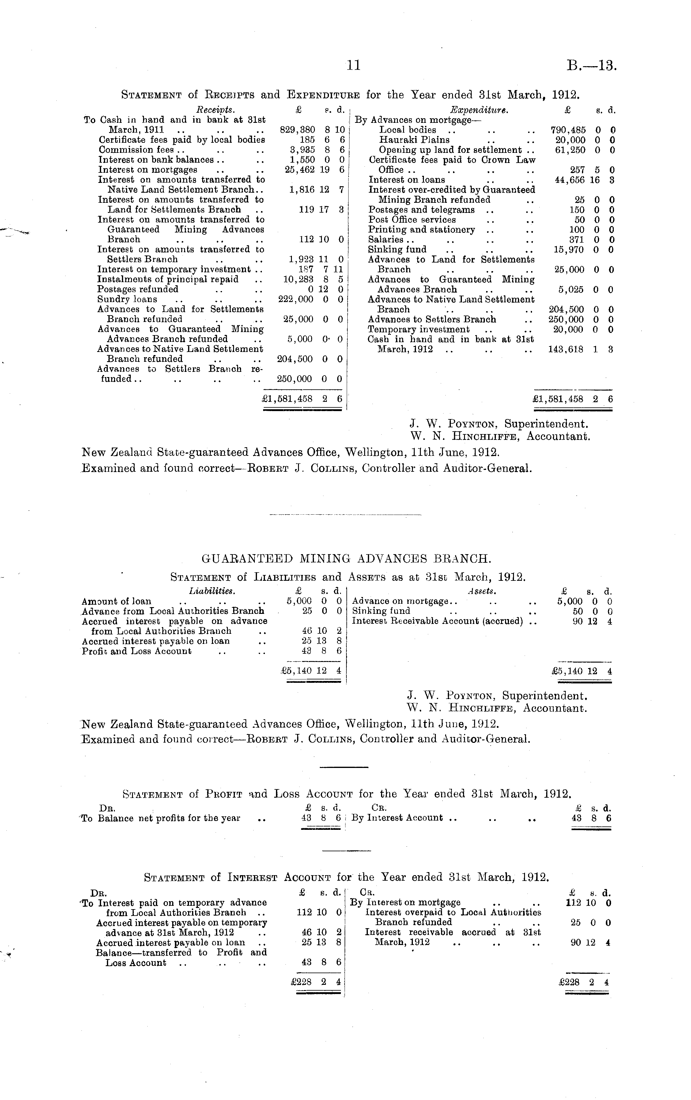 Statement of Beceipts and Expenditure for the Tear ended 31st March, 1912. Receipts. £ c. A. \ Expenditure. £ a. d. To Gash in hand and in bank at 31st [ By Advances on mortgage— March, 1911 .. .. .. 829,880 810 Local bodies .. .. .. 790,485 0 0 Certificate fees paid by local bodies 185 6 6 Hauraki Plains .. .. 20,000 0 0 Commission fees .. .. .. 3,935 8 6 Opening up land for settlement .. 61,250 0 0 Interest on bank balances .. .. 1,550 0 0 | Certificate fees paid to Crown Law Interest on mortgages .. .. 25,462 19 6 Office.. .. .. .. 257 5 0 Interest on amounts transferred to Interest on loans .. .. 44,656 16 3 Native Land Settlement Branch.. 1,816 12 7 Interest over-credited by Guaranteed Interest on amounts transferred to Mining Branch refunded .. 25 0 0 Land for Settlements Branch .. 119 17 8 Postages and telegrams .. .. 150 0 0 Interest on amounts transferred to Post Office services .. .. 50 0 0 Guaranteed Mining Advances Printing and stationery .. .. 100 0 0 Branch .. .. .. 112 30 0 Salaries.. .. .. .. 371 0 0 Interest on amounts transferred to Sinking fund .. .. .. 15,970 0 0 Settlers Branch .. .. 1,923 11 0 Advances to Land for Settlements Interest on temporary investment .. 187 7 11 Branch .. .. .. 25,000 0 0 Instalments of principal repaid .. 10,283 8 5 I Advances to Guaranteed Mining Postages refunded .. .. 0 12 0 Advances Branch .. .. 5,025 0 0 Sundry loans .. .. .. 222,000 0 0 Advances to Native Land Settlement Advances to Land for Settlements Branch .. .. .. 204,500 0 0 Branch refunded .. .. 25,000 00| Advances to Settlers Branch .. 250,000 0 0 Advances to Guaranteed Mining Temporary investment .. .. 20,000 0 0 Advances Branch refunded .. 5,000 0 , 0j Cash in hand and in bank at 31st Advances to Native Land Settlement March, 1912 .. .. .. 143,618 1 3 Branch refunded .. .. 204,500 0 0 Advances to Settlers Branch refunded.. .. .. .. 250,000 0 0 £1,581,458 2 6 £1,581,458 2 6 J. W. Poynton, Superintendent. W. N. Hinchlifpe, Accountant. New Zealand State-guaranteed Advances Office, Wellington, 11th June, 1912. Examined and found correct—Eobeet J. Collins, Controller and Auditor-General. GUARANTEED MINING ADVANCES BRANCH. Statement of Liabilities and Assets as at 31st March, 1912. Liabilities. £ s. d, I Assets. £ s. d. Amount of loan .. .. .. 5,000 0 0 Advance on mortgage.. .. .. 5,000 0 0 Advance from Local Authorities Branch 25 0 0 Sinking fund .. .. .. 50 0 0 Accrued interest payable on advance Interest Receivable Account (accrued) .. 90 12 4 from Local Authorities Branch .. 46 10 2 Accrued interest payable on loan .. 25 13 8 Profit and Loss Account .. .. 43 8 6 £5,140 12 4 £5,140 12 4 J. W. Poynton, Superintendent. W. N. HiNCHLiPPE, Accountant. New Zealand State-guaranteed Advances Office, Wellington, 11th June, 1912. Examined and found correct —Eobert J. Collins, Controller and Auditor-General. Statement of Profit and Loss Account for the Year ended 31st March, 1912. Dβ. £ s. d. Cβ. £ s. d. To Balance net profits for the year .. 43 8 6 By Interest Account .. .. .. 43 8 6 Statement of Interest Account for the Year ended 31st March, 1912. Dβ. £ s. d. j Ca. £ s. d. To Interest paid on temporary advance j By Interest on mortgage .. .. 112 10 0 from Local Authorities Branch .. 112 10 0| Interest overpaid to Local Authorities Accrued interest payable on temporary Branch refunded .. .. 25 0 0 advance at 31st March, 1912 .. 46 10 2 j Interest receivable accrued at 31st Accrued interest payable on loan .. 25 13 8 March, 1912 .. .. .. 90 12 4 Balance—transferred to Profit and Loss Account .. .. .. 43 8 6 £228 2 4 £228 2 i