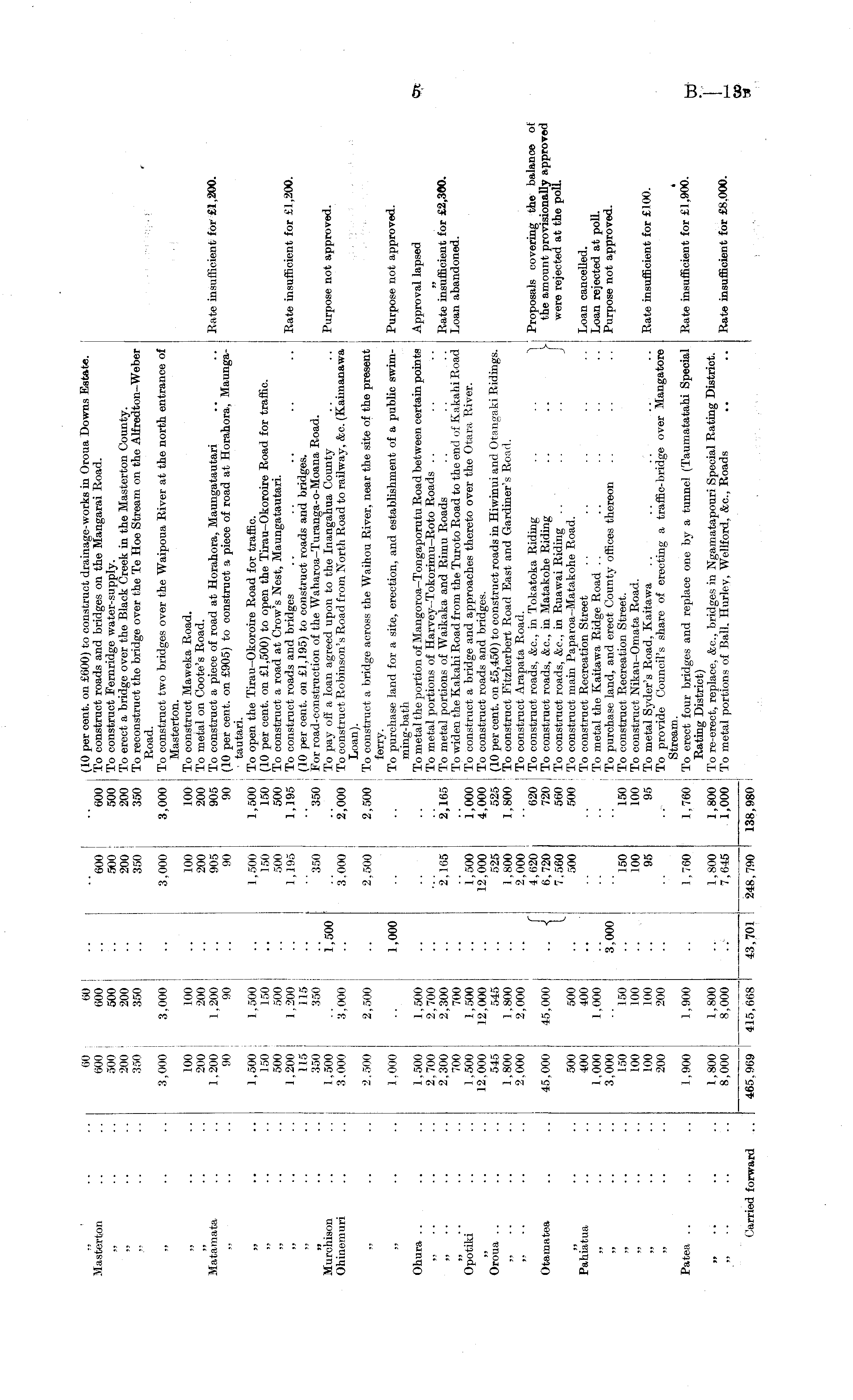 Masterton Matamata )5 • • Murchison Ohinemuri Ohura .. GO 600 i 500 ! 200 ; 350 3,000 100 200 1,200 90 1,500 150 i 500 t 1.200 i 115 350 1.500 3.000 2,500 1,000 1,500 2,700 2,300 700 1,500 12.000 545 1,800 2.000 60 J 000 500 200 350 3,000 100 200 1.200 90 ! 1,500 150 500 1,200 115 ! 350 j \ 2,500 1,500 2,700 ! 2,300 1 700 1,500 12,000 545 i 1,800 ! 2,000 I . . 1,500 1,000 600 500 200 350 3,000 100 200 905 90 1,500 150 500 1,195 350 3^000 2,500 (10 per cent, on £600) to construct drainage- works in Oroua Downs Estate. 600 To construct roads and bridges on the Mangarai Road. 500 To construct Fernridge water-supply. 200 To erect a bridge over the Black Creek in the Masterton County. 350 To reconstruct the bridge over the Te Hoe Stream on the Alfredton-Weber Road. 3,000 To construct two bridges over the Waipoua River at the north entrance of Masterton. 100 To construct Maweka Road. 200 To metal on Coote's Road. 905 To construct a piece of road at Horahora, Maungatautari 90 (10 per cent, on £905) to construct a piece of road at Horahora, Maunga- ', ■ tautari. 1,500 To open the Tirau—Okoroire Road for traffic. 150 I (10 per cent, on £1,500) to open the Tirau-Okoroire Road for traffic. 500 : To construct a road at Crow's Nest, Maungatautari. 1,195 I To construct roads and bridges ; (10 per cent, on £1,195) to construct roads and bridges. 350 ' For road-construction of the Waharoa—Turanga-o-Moana Road. To pay off a loan agreed upon to the Inangahua County 2,000 To construct Robinson's Road from North Road to railway, &c. (Kaimanawa Loan). 2,500 To construct a bridge across the Waihou River, near the site of the present ferry. To purchase land for a site, erection, and establishment of a public swim-ming-bath To metal the portion of Mangoroa-Tongaporutu Road between certain points I To metal portions of Harvey—Tokorimu— Roto Roads 2,165 To metal portions of Waikaka and Rimu Roads To widen the Kakahi Road from the Turoto Road to the end of Kakahi Road 1,000 To construct a bridge and approaches thereto over the Otara River. 4,000 To construct roads and bridges. 525 I (10 per cent, on £5,450) to construct roads in Hiwinui and Otangaki Ridings. 1,800 To construct Fitzherbert Road East and Gardiner's Road. I To construct Arapata Road. 620 i To construct roads, &c, in Tokatoka Riding 720 i To construct roads, &c, in Matakohe Riding .. .. V 560 To construct roads, &e., in Ruawai Riding . . .. .. J 500 To construct main Paparoa-Matakohe Road. To construct Recreation Street . . .. To metal the Kaitawa Ridge Road To purchase land, and erect County offices thereon 150 J To construct Recreation Street. 100 I To construct Nikau-Omata Road. 95 To metal Syder's Road, Kaitawa [ To provide Council's share of erecting a traffic-bridge over Mangatore Stream. 1,760 : To erect four bridges and replace one by a tunnel (Taumatatahi Special Rating District) 1,800 To re-erect, replace, &c, bridges in Ngamatapouri Special Rating District. 1,000 To metal portions of Ball. Hurley, Wellford, &c, Roads * Rate insufficient lor £1,200. Rate insufficient for £1,200. Purpose not approved. Purpose not approved. Approval lapsed 2,165 Rate insufficient for £2,300. Loan abandoned. Opotiki Oroua 1,500 12,000 525 1.800 2,000 4,620 6,720 7,560 500 Proposals covering the balance ol the amount provisionally approved were rejected at the poll. Otamatea 45,000 45,000 -{ Pahiatua 500 400 1,000 3,000 150 100 100 200 500 400 1,000 150 100 100 200 3^000 Loan cancelled. Loan rejected at poll. Purpose not approved. 150 100 95 Rate insufficient for £100. >j • • Patea 1,900 1,900 1,760 Rate insufficient for £1,900. 1,800 8,000 1,800 8,000 1,800 7,645 Rate insufficient for £8.000. Carried forward 465.969 415,668 43,701 i 43,701 248,790 138,980 .....'