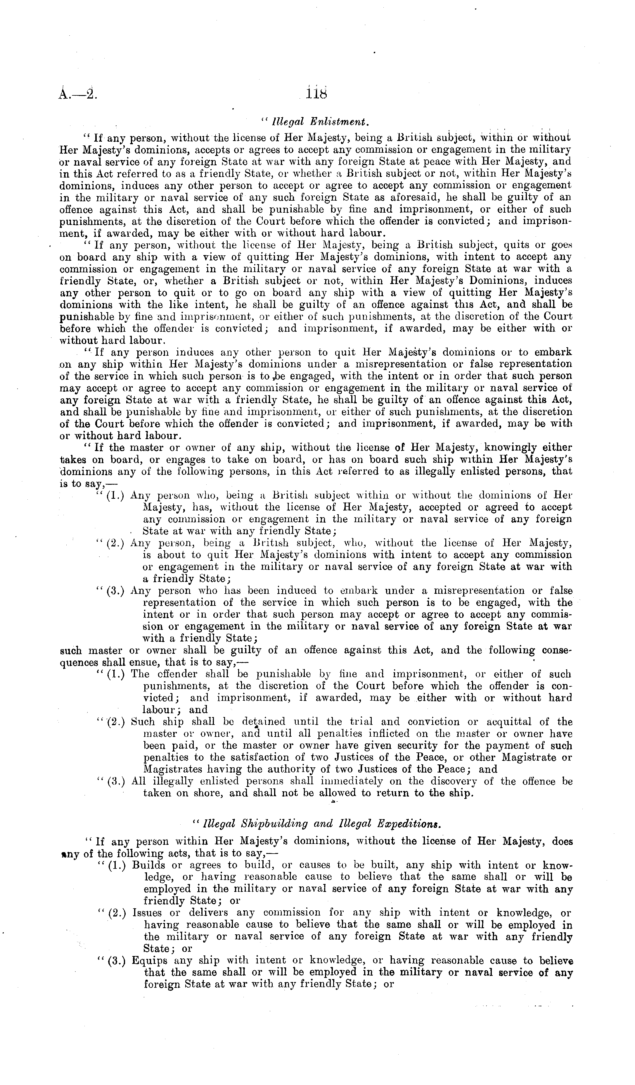 " Illegal Enlistment. " If any person, without the license of Her Majesty, being a British subject, within or without Her Majesty's dominions, accepts or agrees to accept any commission or engagement in the military or naval service of any foreign State at war with any foreign State at peace with Her Majesty, and in this Act referred to as a friendly State, or whether a British subject or not, within Her Majesty's dominions, induces any other person to accept or agree to accept any commission or engagement in the military or naval service of any such foreign State as aforesaid, he shall be guilty of an offence against this Act, and shall be punishable by fine and imprisonment, or either of such punishments, at the discretion of the Court before which the offender is convicted; and imprisonment, if awarded, may be either with or without hard labour. " If any person, without the license of Her Majesty, being a British subject, quits or goes on board any ship with a view of quitting Her Majesty's dominions, with intent to accept any commission or engagement in the military or naval service of any foreign State at war with a friendly State, or, whether a British subject or not, within Her Majesty's Dominions, induces any other person to quit or to go on board any ship with a view of quitting Her Majesty's dominions with the like intent, he shall be guilty of an offence against this Act, and shall be punishable by fine and imprisonment, or either of such punishments, at the discretion of the Court before which the offender is convicted; and imprisonment, if awarded, may be either with or without hard labour. " If any person induces any other person to quit Her Majesty's dominions or to embark on any ship within Her Majesty's dominions under a misrepresentation or false representation of the service in which such person is to ,be engaged, with the intent or in order that such person may accept or agree to accept any commission or engagement in the military or naval service of any foreign State at war with a friendly State, he shall be guilty of an offence against this Act, and shall be punishable by fine and imprisonment, or either of such punishments, at the discretion of the Court before which the offender is convicted; and imprisonment, if awarded, may be with or without hard labour. " If the master or owner of any ship, without the license of Her Majesty, knowingly either takes on board, or engages to take on board, or has on board such ship within Her Majesty's dominions any of the following persons, in this Act referred to as illegally enlisted persons, that is to say,— " (1.) Any person who, being a British subject within or without the dominions of Her Majesty, has, without the license of Her Majesty, accepted or agreed to accept any commission or engagement in the military or naval service of any foreign State at war with any friendly State; " (2.) Any poison, being a British subject, who, without the license of Her Majesty, is about to quit Her Majesty's dominions with intent to accept any commission or engagement in the military or naval service of any foreign State at war with a friendly State; " (3.) Any person who has been induced to embark under a misrepresentation or false representation of the service in which such person is to be engaged, with the intent or in order that such person may accept or agree to accept any commission or engagement in the military or naval service of any foreign State at war with a friendly State; such master or owner shall be guilty of an offence against this Act, and the following consequences shall ensue, that is to say, — " (1.) The offender shall be punishable by fine and imprisonment, or either of such punishments, at the discretion of the Court before which the offender is convicted; and imprisonment, if awarded, may be either with or without hard labour; and "(2.) Such ship shall be detained until the trial and conviction or acquittal of the master or owner, and until all penalties inflicted on the master or owner have been paid, or the master or owner have given security for the payment of such penalties to the satisfaction of two Justices of the Peace, or other Magistrate or Magistrates having the authority of two Justices of the Peace; and " (3.) All illegally enlisted persons shall immediately on the discovery of the offence be taken on shore, and shall not be allowed to return to the ship. " Illegal Shipbuilding and Illegal Expeditions. " If any person within Her Majesty's dominions, without the license of Her Majesty, does •ny of the following acts, that is to say, — " (1.) Builds or agrees to build, or causes to be built, any ship with intent or knowledge, or having reasonable cause to believe that the same shall or will be employed in the military or naval service of any foreign State at war with any friendly State; or " (2.) Issues or delivers any commission for any ship with intent or knowledge, or having reasonable cause to believe that the same shall or will be employed in the military or naval service of any foreign State at war with any friendly State; or " (3.) Equips any ship with intent or knowledge, or having reasonable cause to believe that the same shall or will be employed in the military or naval service of any foreign State at war with any friendly State; or