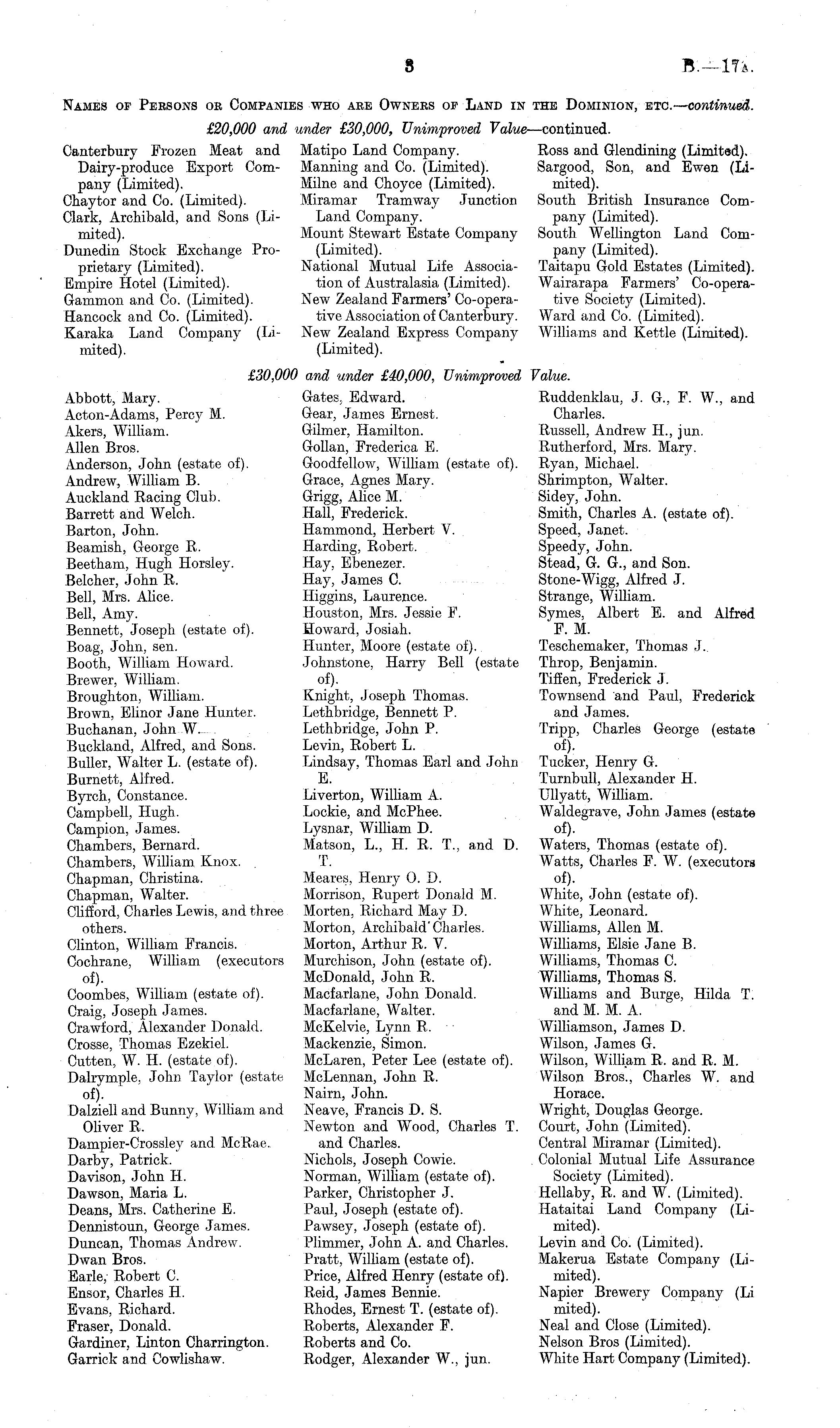 Names of Persons or Companies who are Owners of Land in the Dominion, etc. — continued,. £20,000 and under £30,000, Unimproved Value —continued. Canterbury Frozen Meat and Matipo Land Company. Ross and Glendining (Limited). Dairy-produce Export Com- Manning and Co. (Limited). Sargood, Son, and Ewen (Lipany (Limited). Milne and Choyce (Limited). mited). Chaytor and Co. (Limited). Miramar Tramway Junction South British Insurance ComClark, Archibald, and Sons (Li- Land Company. pany (Limited). raited). Mount Stewart Estate Company South Wellington Land ComDunedin Stock Exchange Pro- (Limited). pany (Limited). prietary (Limited). National Mutual Life Associa- Taitapu Gold Estates (Limited). Empire Hotel (Limited). tion of Australasia (Limited). Wairarapa Farmers' Co-opera-Gammon and Co. (Limited). New Zealand Farmers' Co-oper- tive Society (Limited). Hancock and Co. (Limited). tive Association of Canterbury. Ward and Co. (Limited). Karaka Land Company (Li- New Zealand Express Company Williams and Kettle (Limited). mited). (Limited). £30,000 and under £40,000, Unimproved Value. Abbott, Mary. Gates, Edward. Ruddenklau, J. G., F. W., and Acton-Adams, Percy M. Gear, James Ernest. Charles. Akers, William. Gilmer, Hamilton. Russell, Andrew H., jun. Allen Bros. Gollan, Frederica E. Rutherford, Mrs. Mary. Anderson, John (estate of). Goodfellow, William (estate of). Ryan, Michael. Andrew, William B. Grace, Agnes Mary. Shrimpton, Walter. Auckland Racing Club. Grigg, Alice M. Sidey, John. Barrett and Welch. Hall, Frederick. Smith, Charles A. (estate of). Barton, John. Hammond, Herbert V. Speed, Janet. Beamish, George R. Harding, Robert. Speedy, John. Beetham, Hugh Horsley. Hay, Ebenezer. Stead, G. G., and Son. Belcher, John R. Hay, James C. Stone-Wigg, Alfred J. Bell, Mrs. Alice. Higgins, Laurence. Strange, William. Bell, Amy. Houston, Mrs. Jessie F. Symes, Albert E. and Alfred Bennett, Joseph (estate of). Howard, Josiah. F. M. Boag, John, sen. Hunter, Moore (estate of). Teschemaker, Thomas J. Booth, William Howard. Johnstone, Harry Bell (estate Throp, Benjamin. Brewer, William. of). Tifien, Frederick J. Broughton, William. Knight, Joseph Thomas. Townsend and Paul, Frederick Brown, Elinor Jane Hunter. Lethbridge, Bennett P. and James. Buchanan, John W. Lethbridge, John P. Tripp, Charles George (estate Buckland, Alfred, and Sons. Levin, Robert L. of). Buller, Walter L. (estate of). Lindsay, Thomas Earl and John Tucker, Henry G. Burnett, Alfred. E. . Turnbull, Alexander H. Byrch, Constance. Liverton, William A. Ullyatt, William. Campbell, Hugh. Lockie, and McPhee. Waldegrave, John James (estate Campion, James. Lysnar, William D. of). Chambers, Bernard. Matson, L., H. R. T., and D. Waters, Thomas (estate of). Chambers, William Knox. . T. Watts, Charles F. W. (executors Chapman, Christina. Meares, Henry 0. D. of). Chapman, Walter. Morrison, Rupert Donald M. White, John (estate of). Clifford, Charles Lewis, and three Morten, Richard May D. White, Leonard. others. Morton, Archibald" Charles. Williams, Allen M. Clinton, William Francis. Morton, Arthur R. V. Williams, Elsie Jane B. Cochrane, William (executors Murchison, John (estate of). Williams, Thomas C. of). McDonald, John R. Williams, Thomas S. Coombes, William (estate of). Macfarlane, John Donald. Williams and Burge, Hilda T. Craig, Joseph James. Macfarlane, Walter. and M. M. A. Crawford, Alexander Donald. McKelvie, Lynn R. Williamson, James D. Crosse, Thomas Ezekiel. Mackenzie, Simon. Wilson, James G. Cutten, W. H. (estate of). McLaren, Peter Lee (estate of). Wilson, William R. and R. M. Dalrymple, John Taylor (estate McLennan, John R. Wilson Bros., Charles W. and of). Nairn, John. Horace. Dalziell and Bunny, William and Neave, Francis D. S. Wright, Douglas George. Oliver R. Newton and Wood, Charles T. Court, John (Limited). Dampier-Crossley and Mcßae. and Charles. Central Miramar (Limited). Darby, Patrick. Nichols, Joseph Cowie. . Colonial Mutual Life Assurance Davison, John H. Norman, William (estate of). Society (Limited). Dawson, Maria L. Parker, Christopher J. Hellaby, R. and W. (Limited). Deans, Mrs. Catherine E. Paul, Joseph (estate of). Hataitai Land Company (LiDennistoun, George James. Pawsey, Joseph (estate of). mited). Duncan, Thomas Andrew. Plimmer, John A. and Charles. Levin and Co. (Limited). Dwan Bros. Pratt, William (estate of). Makerua Estate Company (LiEarle, Robert C. Price, Alfred Henry (estate of). mited). Ensor, Charles H. Reid, James Bennie. Napier Brewery Company (Li Evans, Richard. Rhodes, Ernest T. (estate of). mited). Fraser, Donald. Roberts, Alexander F. Neal and Close (Limited). Gardiner, Linton Charrington. Roberts and Co. Nelson Bros (Limited). Garrick and Cowlishaw. Rodger, Alexander W., jun. White Hart Company (Limited).