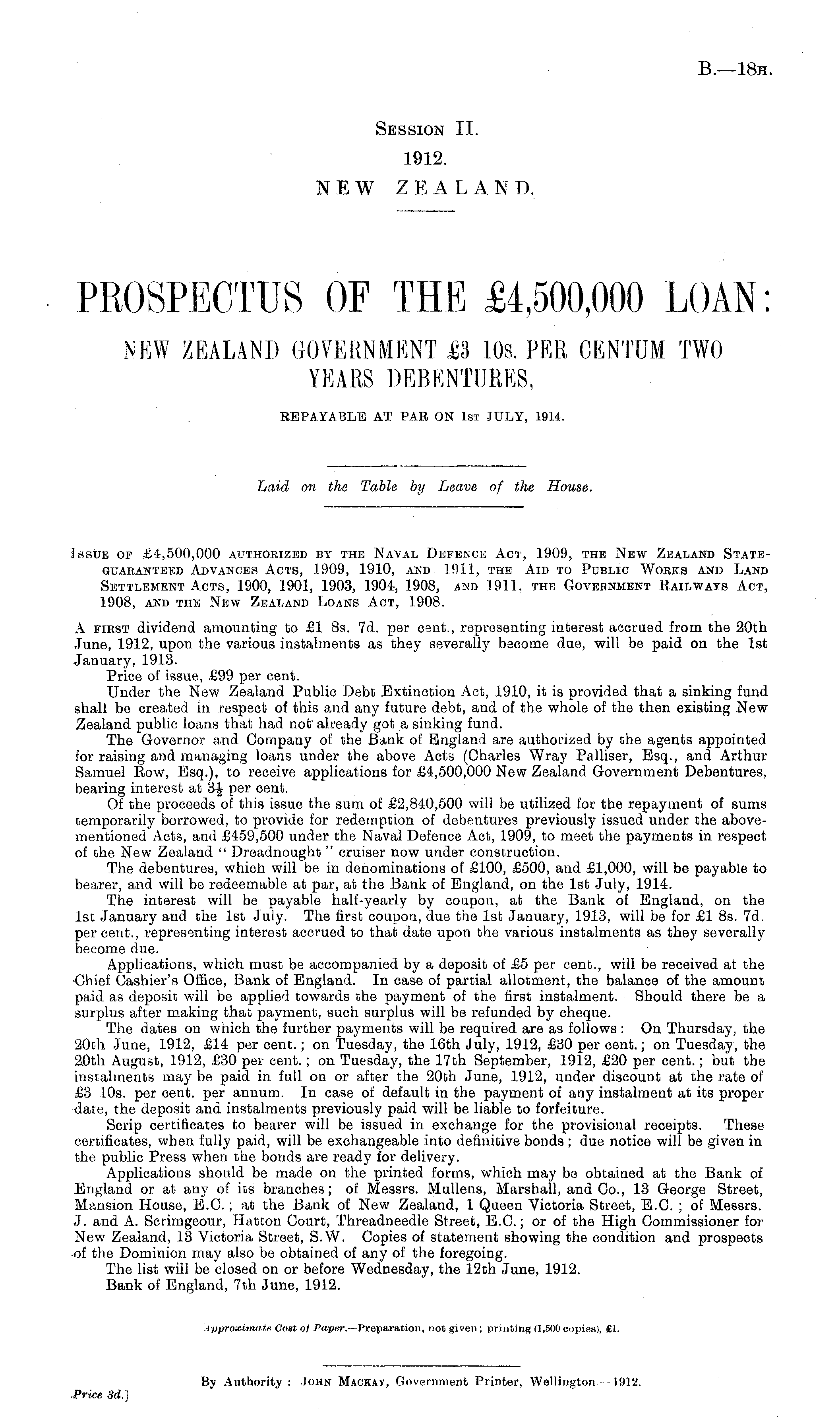 PROSPECTUS OF THE £4,500,000 LOAN: NEW ZEALAND GOVERNMENT £3 10s. PER CENTUM TWO YEARS DEBENTURES, REPAYABLE AT PAR ON 1st JULY, 1914.