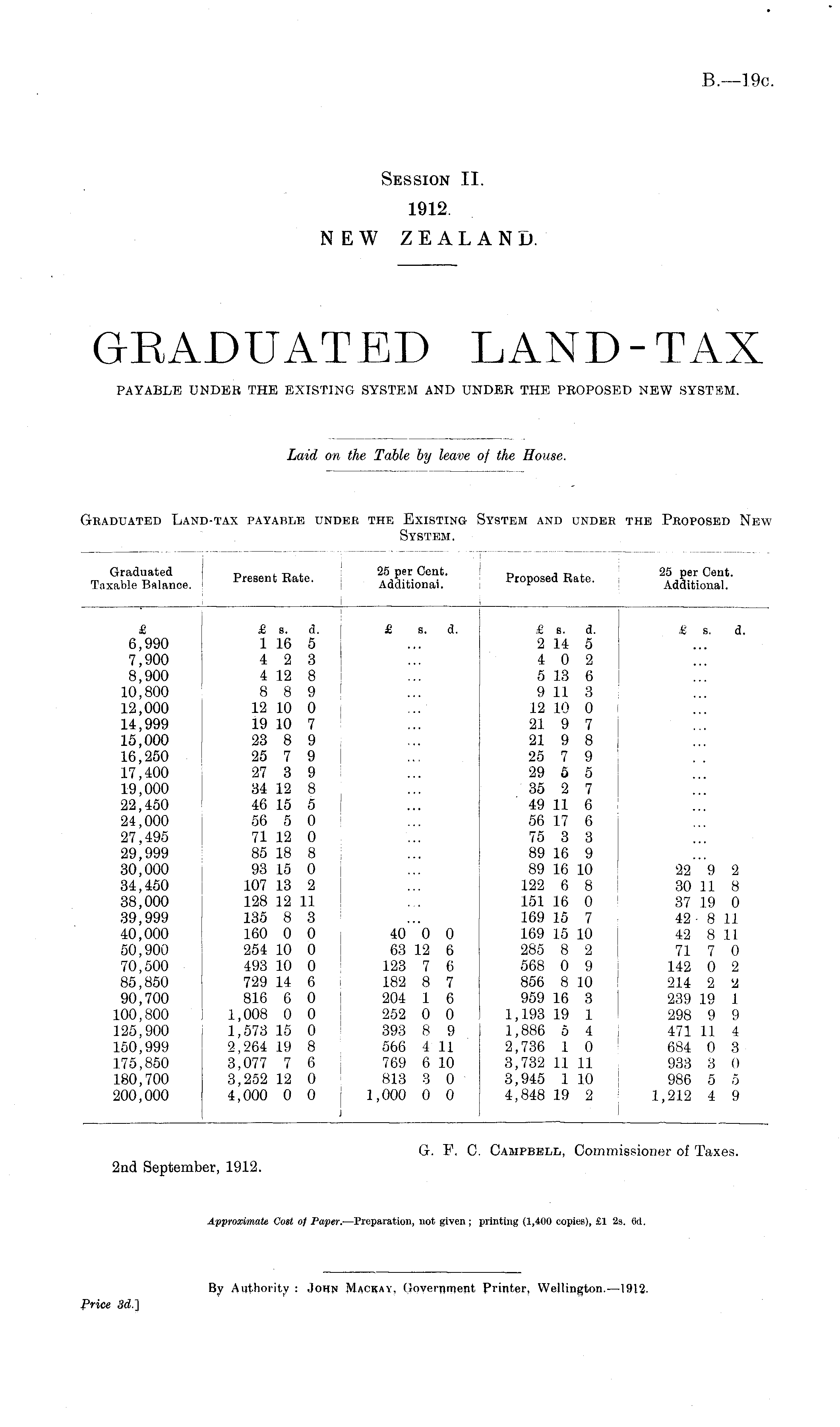 Graduated Taxable Balance. Present Rate. 25 per Cent. Additional. Proposed Rate. 25 per Cent. Additional. £ 6,990 7,900 8,900 10,800 12,000 14,999 15,000 16,250 17,400 19,000 22,450 24,000 27,495 29,999 30,000 34,450 38,000 39,999 40,000 50,900 70,500 85,850 90,700 100,800 125,900 150,999 175,850 180,700 200,000 £ a. A. 1 16 5 4 2 3 4 12 8 8 8 9 12 10 0 19 10 7 23 8 9 25 7 9 27 3 9 34 12 8 46 15 5 56 5 0 71 12 0 85 18 8 93 15 0 107 13 2 128 12 11 135 8 3 160 0 0 254 10 0 493 10 0 729 14 6 816 6 0 1,008 0 0 1,573 15 0 2,264 19 8 3,077 7 6 3,252 12 0 4,000 0 0 £ s. d. 40 0 0 63 12 6 123 7 6 182 8 7 204 1 6 252 0 0 393 8 9 566 4 11 769 6 10 813 3 0 1,000 0 0 £ s. d. 2 14 5 4 0 2 5 13 6 9 11 3 12 10 0 21 9 7 21 9 8 25 7 9 29 5 5 35 2 7 49 11 6 56 17 6 75 3 3 89 16 9 89 16 10 122 6 8 151 16 0 169 15 7 169 15 10 285 8 2 568 0 9 856 8 10 959 16 3 1,193 19 1 1,886 5 4 2,736 1 0 3,732 11 11 3,945 1 10 4,848 19 2 £ s. d. 22 9 2 30 11 8 37 19 0 42- 8 11 42 8 11 71 7 0 142 0 2 214 2 l A 239 19 1 298 9 9 471 11 4 684 0 3 933 3 0 986 5 5 1,212 4 9 j