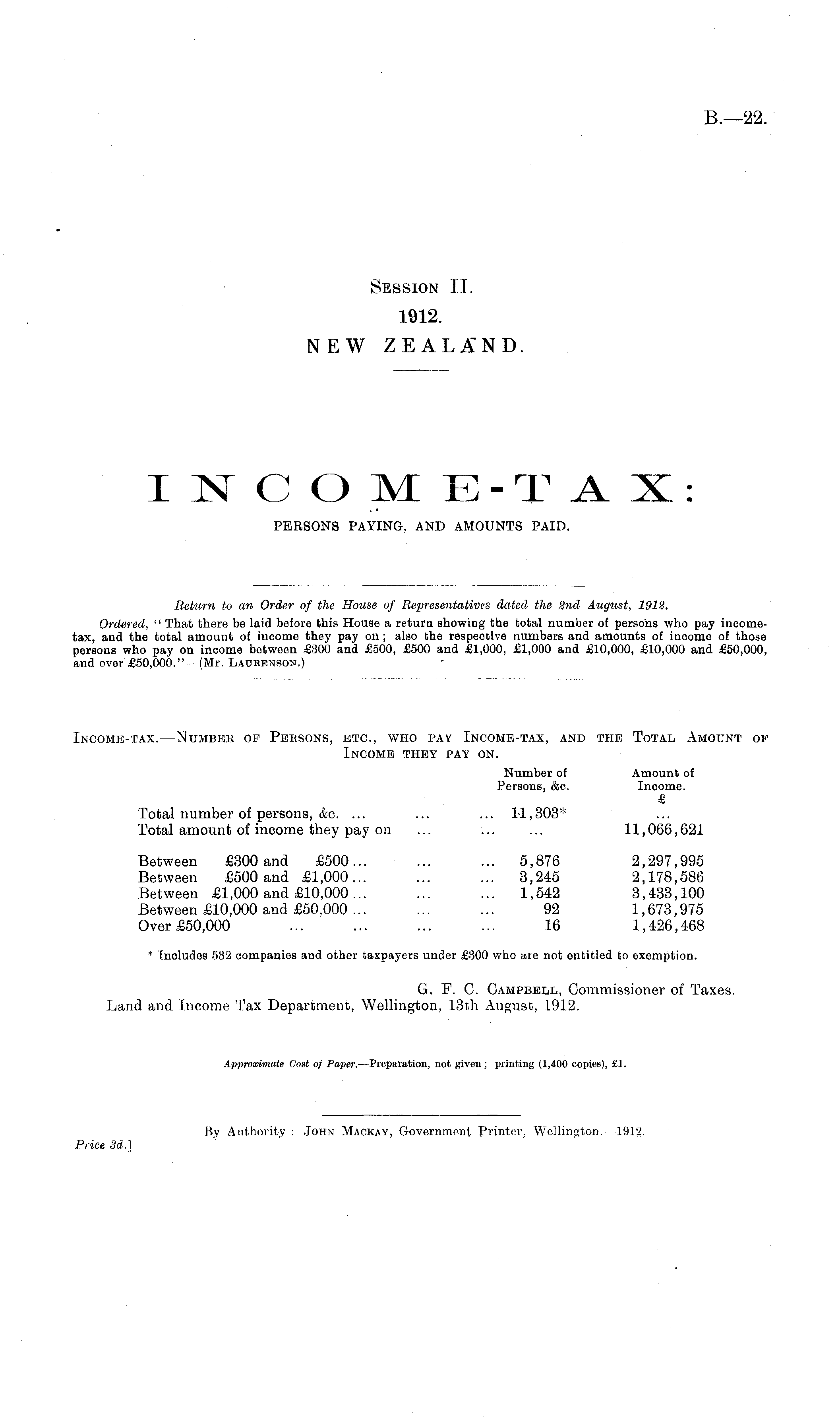 Return to an Order of the Bouse of Representatives dated the 2nd August, 1912. Ordered, " That there be laid before this House a return showing the total number of persons who pay incometax, and the total amount of income they pay on; also the respective numbers and amounts of income of those persons who pay on income between £300 and £500, £300 and £1,000, £1,000 and £10,000, £10,000 and £50,000, and over £50,000." —(Mr. Laurenson.)