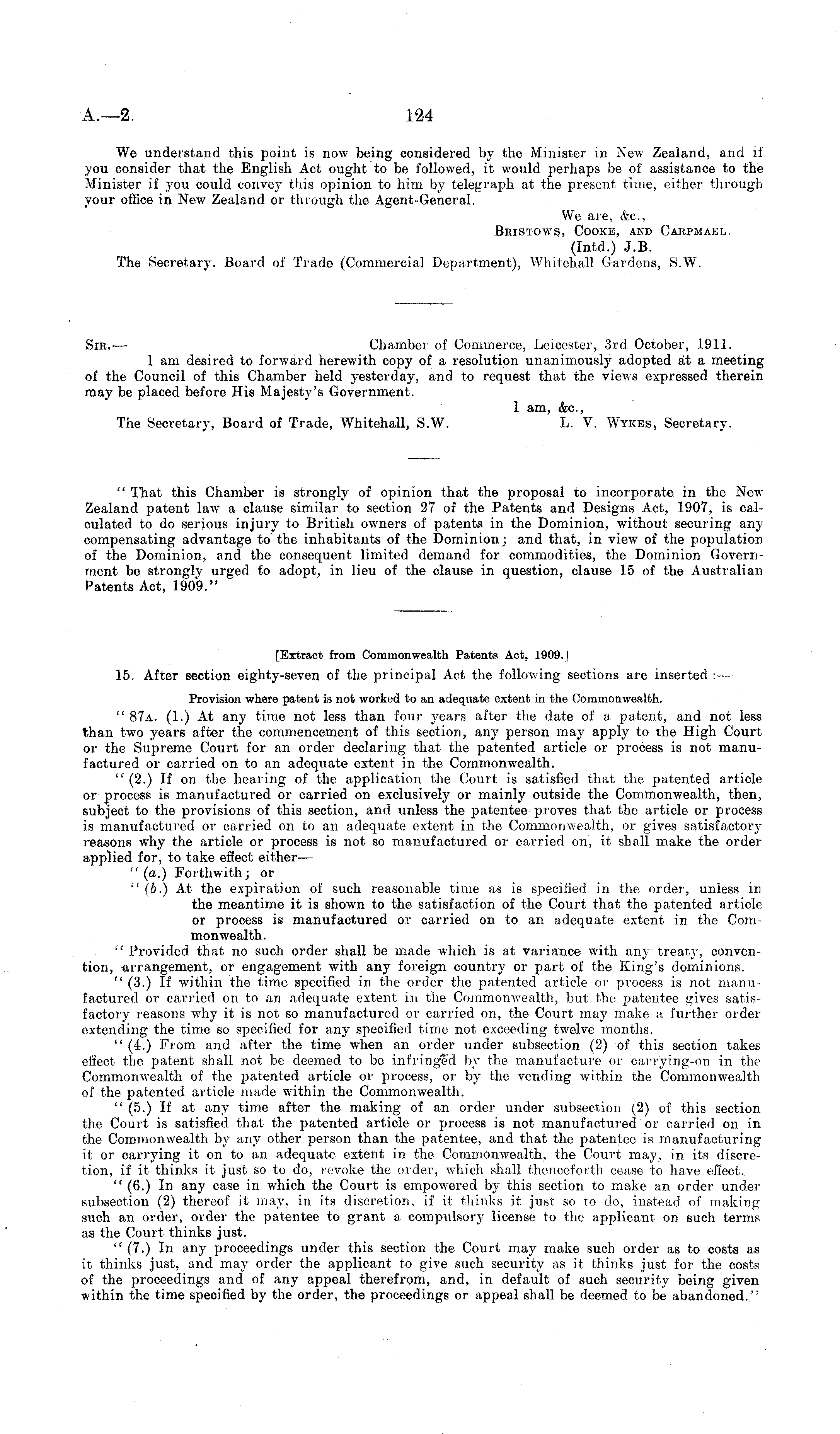 Sir. — Chamber of Commerce, Leicester, 3rd October, 1911. 1 am desired to forward herewith copy of a resolution unanimously adopted at a meeting of the Council of this Chamber held yesterday, and to request that the views expressed therein may be placed before His Majesty's Government. I am, &c, The Secretary, Board of Trade, Whitehall, S.W. L. V. Wykes, Secretary. " That this Chamber is strongly of opinion that the proposal to incorporate in the New Zealand patent law a clause similar to section 27 of the Patents and Designs Act, 1907, is calculated to do serious injury to British owners of patents in the Dominion, without securing anycompensating advantage to the inhabitants of the Dominion; and that, in view of the population of the Dominion, and the consequent limited demand for commodities, the Dominion Government be strongly urged to adopt, in lieu of the clause in question, clause 15 of the Australian Patents Act, 1909." [Extract from Commonwealth Patents Act, 1909.J 15. After section eighty-seven of the principal Act the following sections are inserted :— Provision where patent is not worked to an adequate extent in the Commonwealth. " 87a. (1.) At any time not less than four years after the date of a patent, and not less than two years after the commencement of this section, any person may apply to the High Court or the Supreme Court for an order declaring that the patented article or process is not manufactured or carried on to an adequate extent in the Commonwealth. " (2.) If on the hearing of the application the Court is satisfied that the patented article or process is manufactured or carried on exclusively or mainly outside the Commonwealth, then, subject to the provisions of this section, and unless the patentee proves that the article or process is manufactured or carried on to an adequate extent in the Commonwealth, or gives satisfactory reasons why the article or process is not so manufactured or carried on, it shall make the order applied for, to take effect either— " (a.) Forthwith; or " (b.) At the expiration of such reasonable time as is specified in the order, unless in the meantime it is shown to the satisfaction of the Court that the patented article or process is manufactured or carried on to an adequate extent in the Commonwealth. " Provided that no such order shall be made which is at variance with any treaty, convention, arrangement, or engagement with any foreign country or part of the King's dominions. " (3.) If within, the time specified in the order the patented article or process is not manufactured or carried on to an adequate extent in the Commonwealth, but the patentee gives satisfactory reasons why it is not so manufactured or carried on, the Court may make a further order extending the time so specified for any specified time not exceeding twelve months. " (4.) From and after the time when an order under subsection (2) of this section takes effect the patent shall not be deemed to be infringed by the manufacture or carrying-on in the Commonwealth of the patented article or process, or by the vending within the Commonwealth of the patented article made within the Commonwealth. " (5.) If at any time after the making of an order under subsection (2) of this section the Court is satisfied that the patented article or process is not manufactured or carried on in the Commonwealth by any other person than the patentee, and that the patentee is manufacturing it or carrying it on to an adequate extent in the Commonwealth, the Court may, in its discretion, if it thinks it just so to do, revoke the order, which shall thenceforth cease to have effect. " (6.) In any case in which the Court is empowered by this section to make an order under subsection (2) thereof it may, in its discretion, if it thinks it just so to do, instead, of making such an order, order the patentee to grant a compulsory license to the applicant on such terms as the Court thinks just. " (7.) In any proceedings under this section the Court may make such order as to costs as it thinks just, and may order the applicant to give such security as it thinks just for the costs of the proceedings and of any appeal therefrom, and, in default of such security being given within the time specified by the order, the proceedings or appeal shall be deemed to be abandoned."